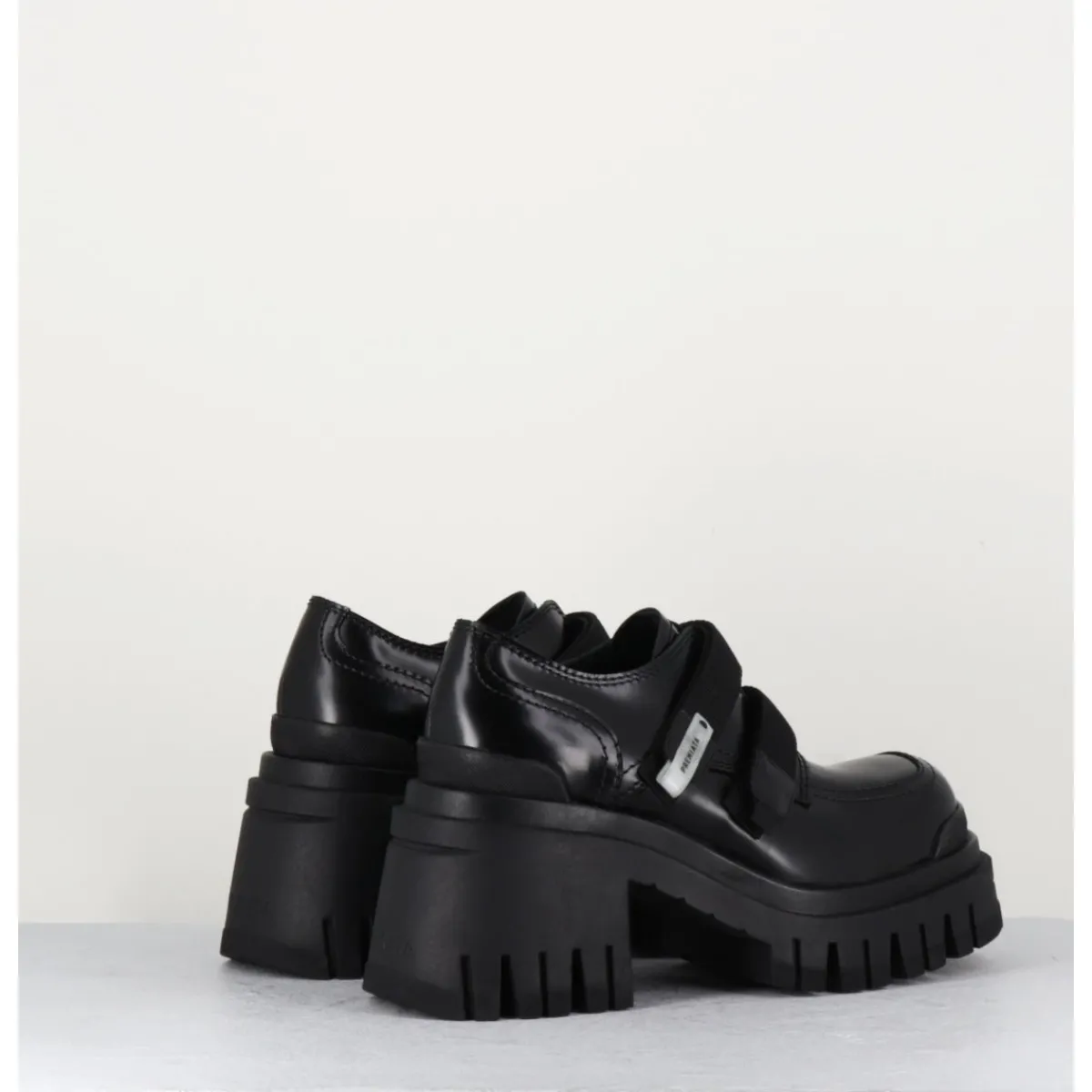 Chaussures en cuir noir double brides à scratch & brogue esprit 90s, montées sur une semelle épaisse & un talon moyen crantés