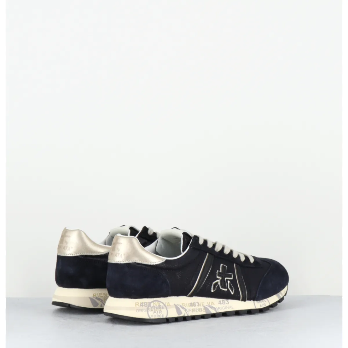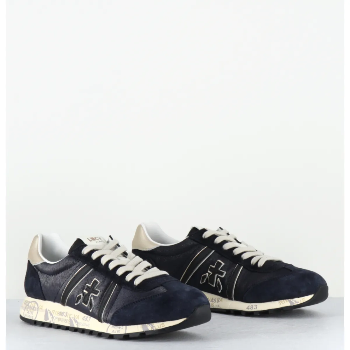 Baskets en daim bleu marine et toile irisé avec détails de cuir blanc cassé, montées sur une semelle légère, avec imprimé signature de la Maison Italienne Premiata.