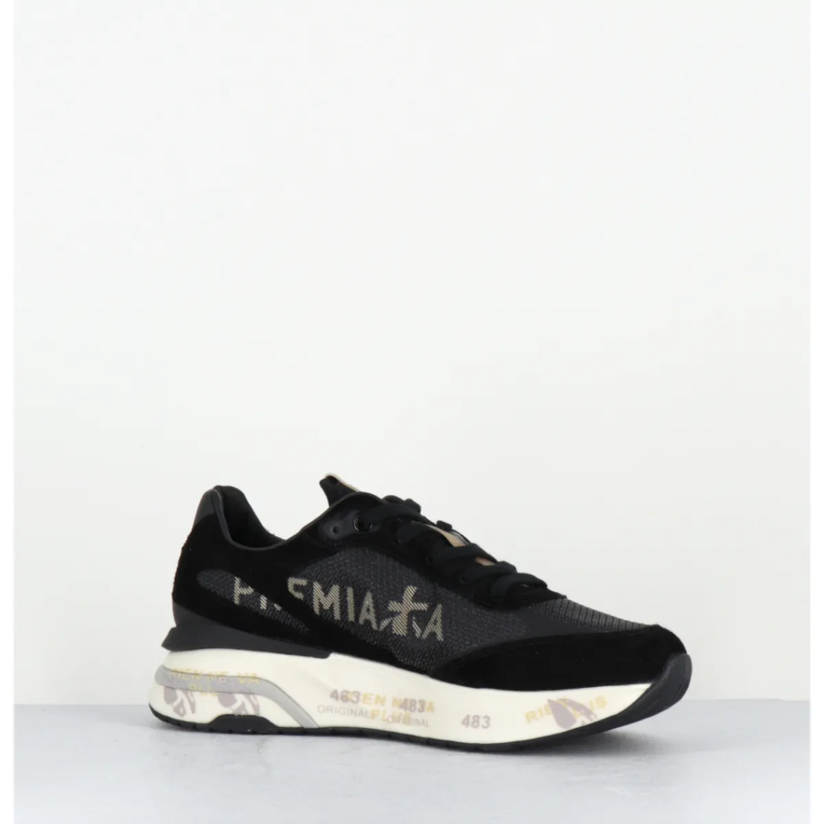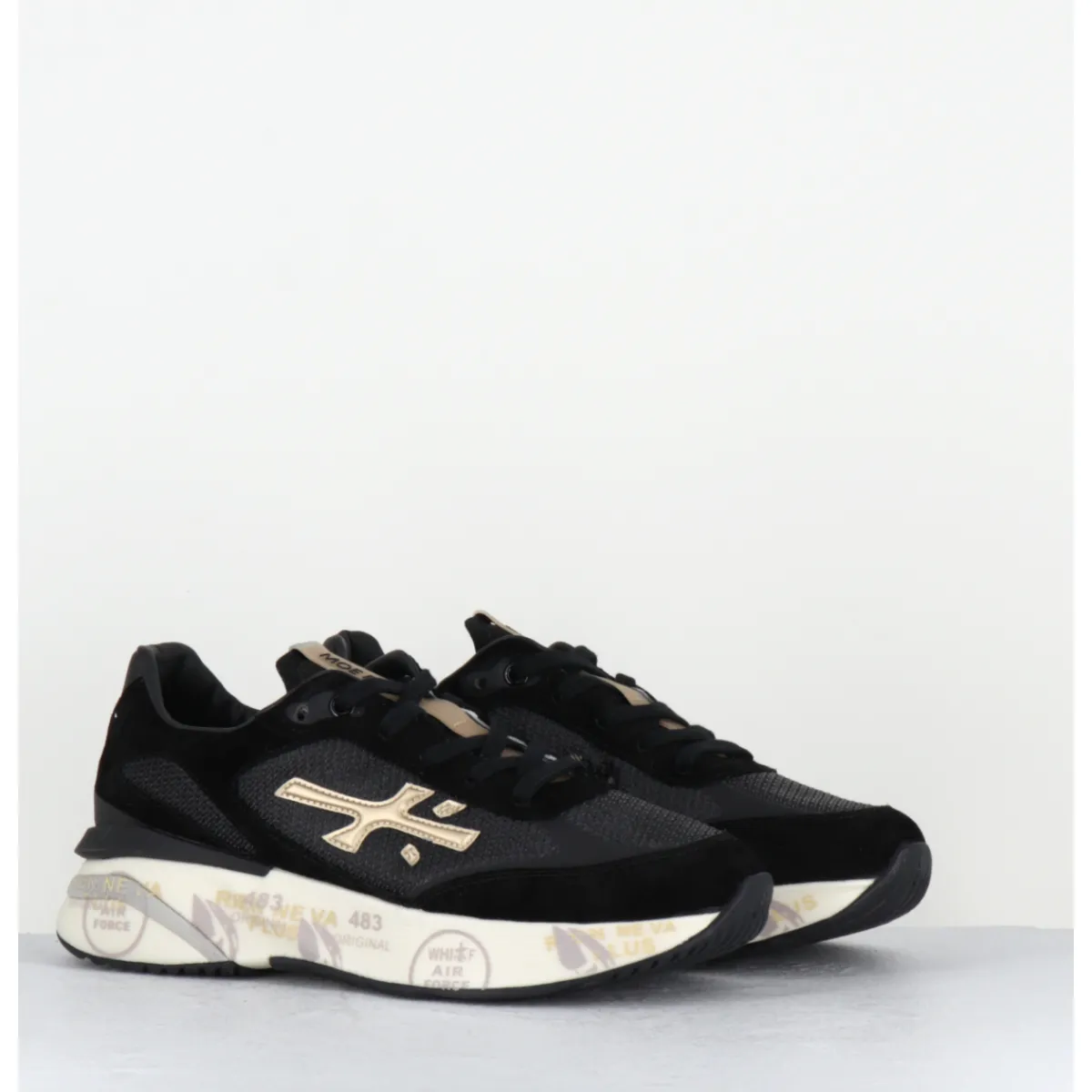 Sneakers esprit années 90, semelle ultra light innovante chez Premiata, daim noir et empiècement de toile avec détails cuir or, montées sur une semelle épaisse blanche en micro fibre, avec imprimé signature de la Maison Italienne Premiata.