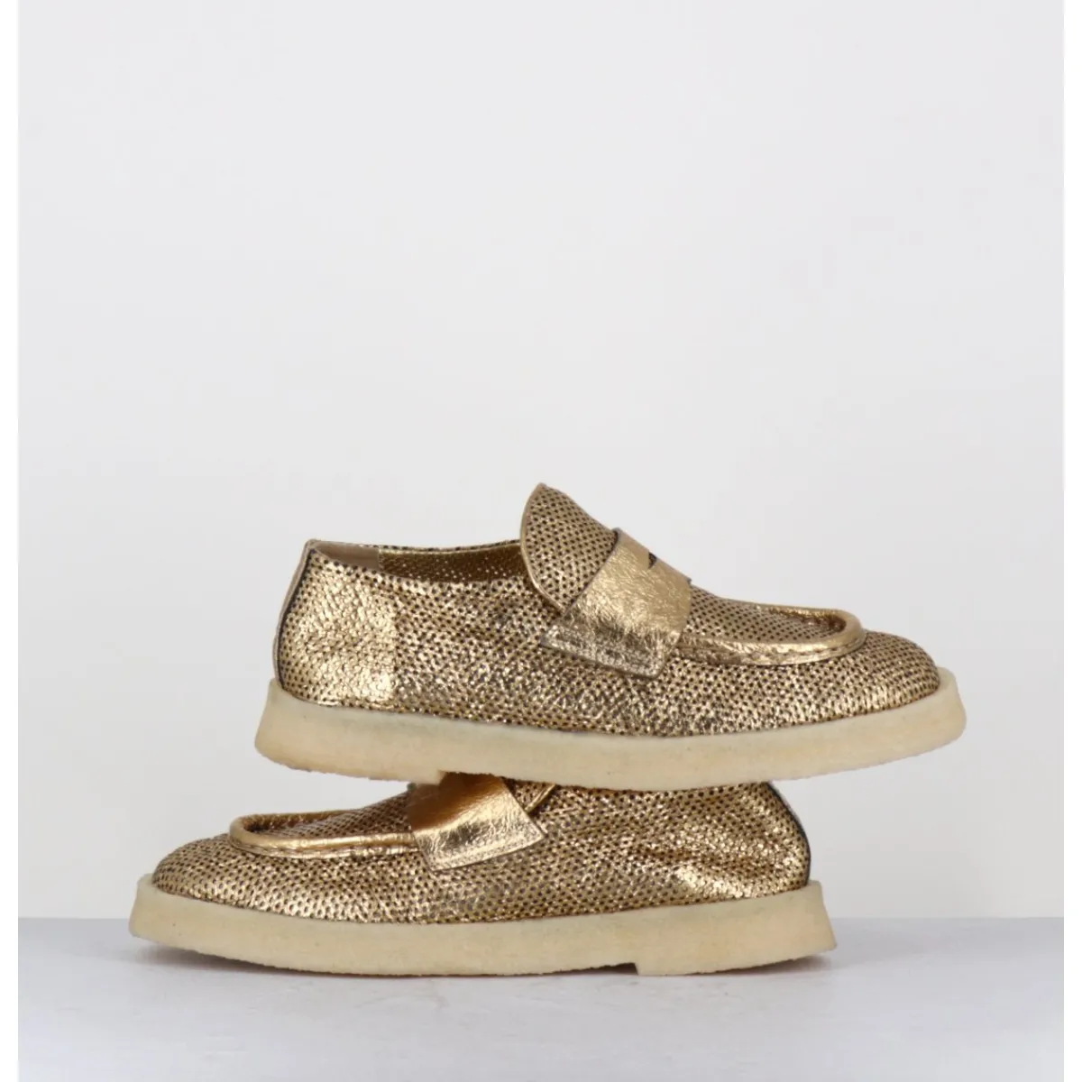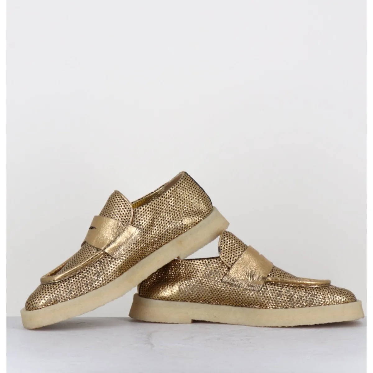 Mocassins en cuir métallisé doré perforé et crêpe naturel, construction sacchetto extrêmement souple cousu intérieur extérieur, forme large à semelle légèrement débordante