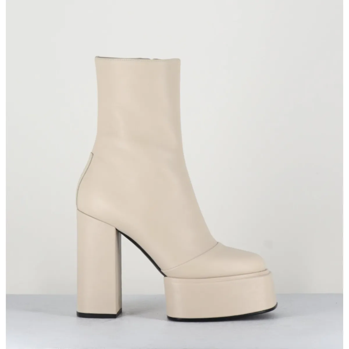 Boots en cuir souple blanc, tige haute, zip intérieur, bout rond, couture centrale rétro, montées sur une large plateforme carrée et un haut talon bloc recouverts.