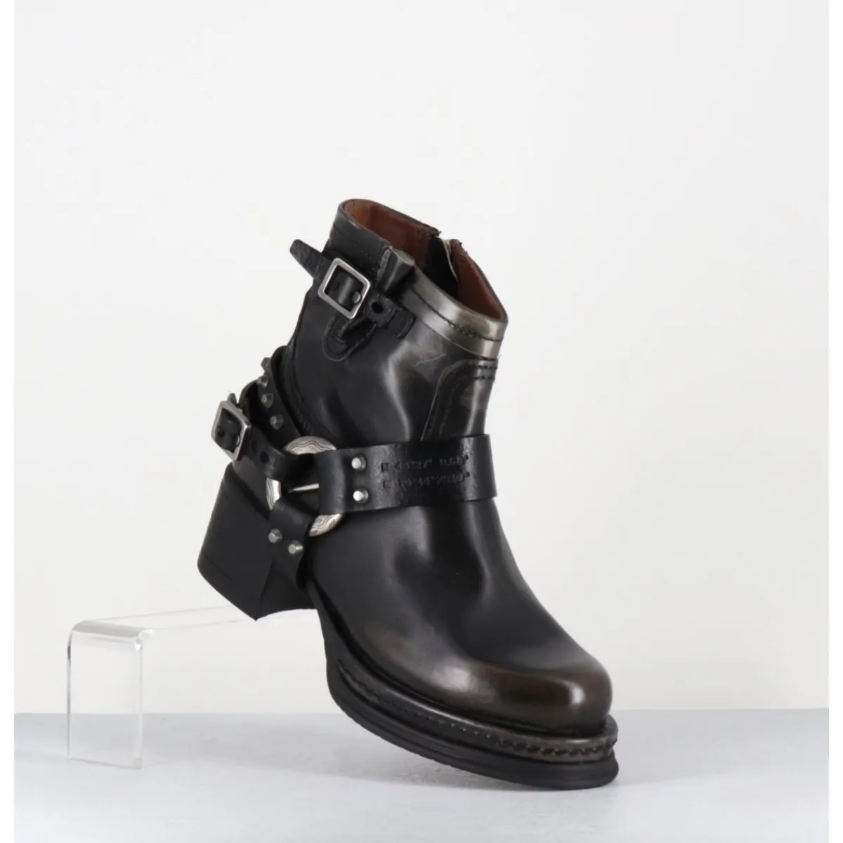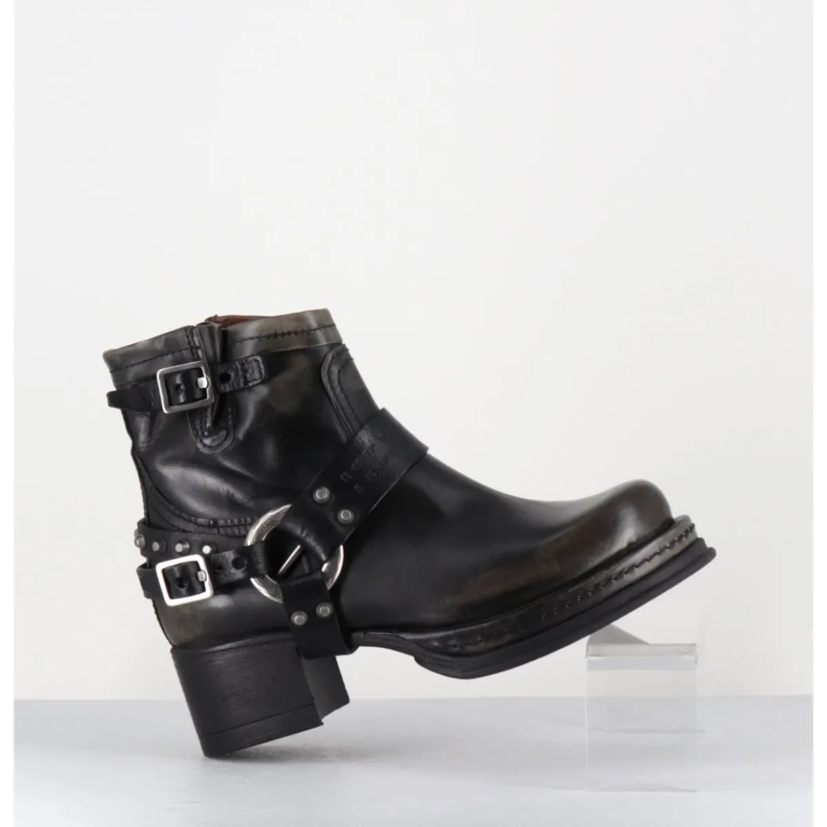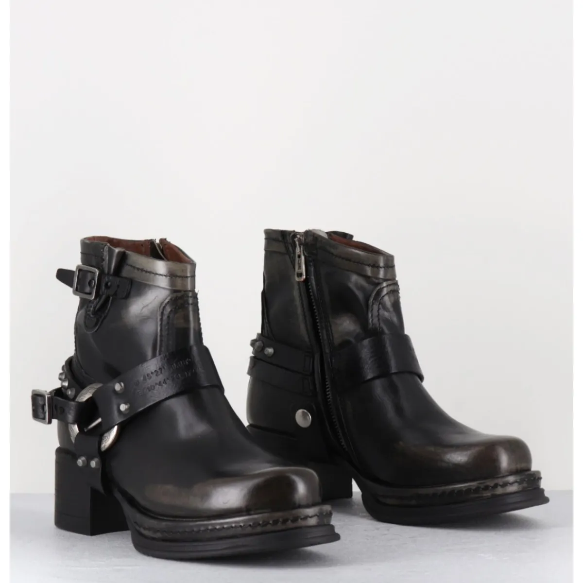 Boots bikers tige courte en cuir anthracite lustré avec patine vieilli à la main pour un effet vintage allant du gris au noir, ceinturon à clous argentés, bout arrondi, petit bride à boucle réglable sur la jambe, montées sur une semelle épaisse en gomme et un talon bloc confortable