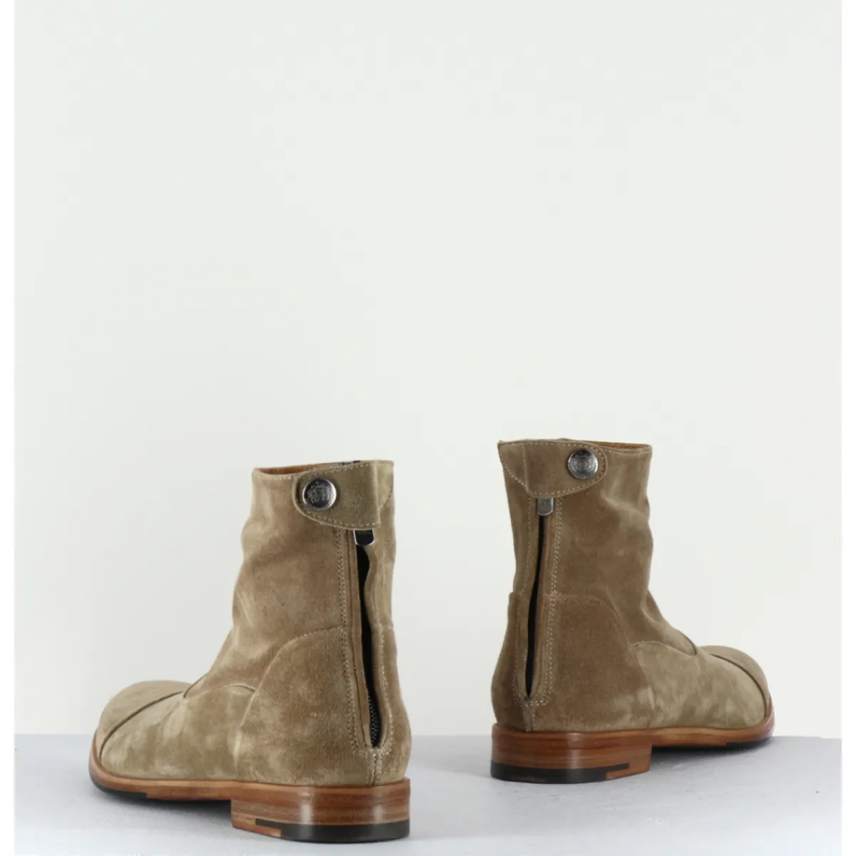 Bottines plates en daim souple taupe, bout en amande rapporté et zip arrière avec pression signature de la Maison Fasciani. D’un extrême confort.