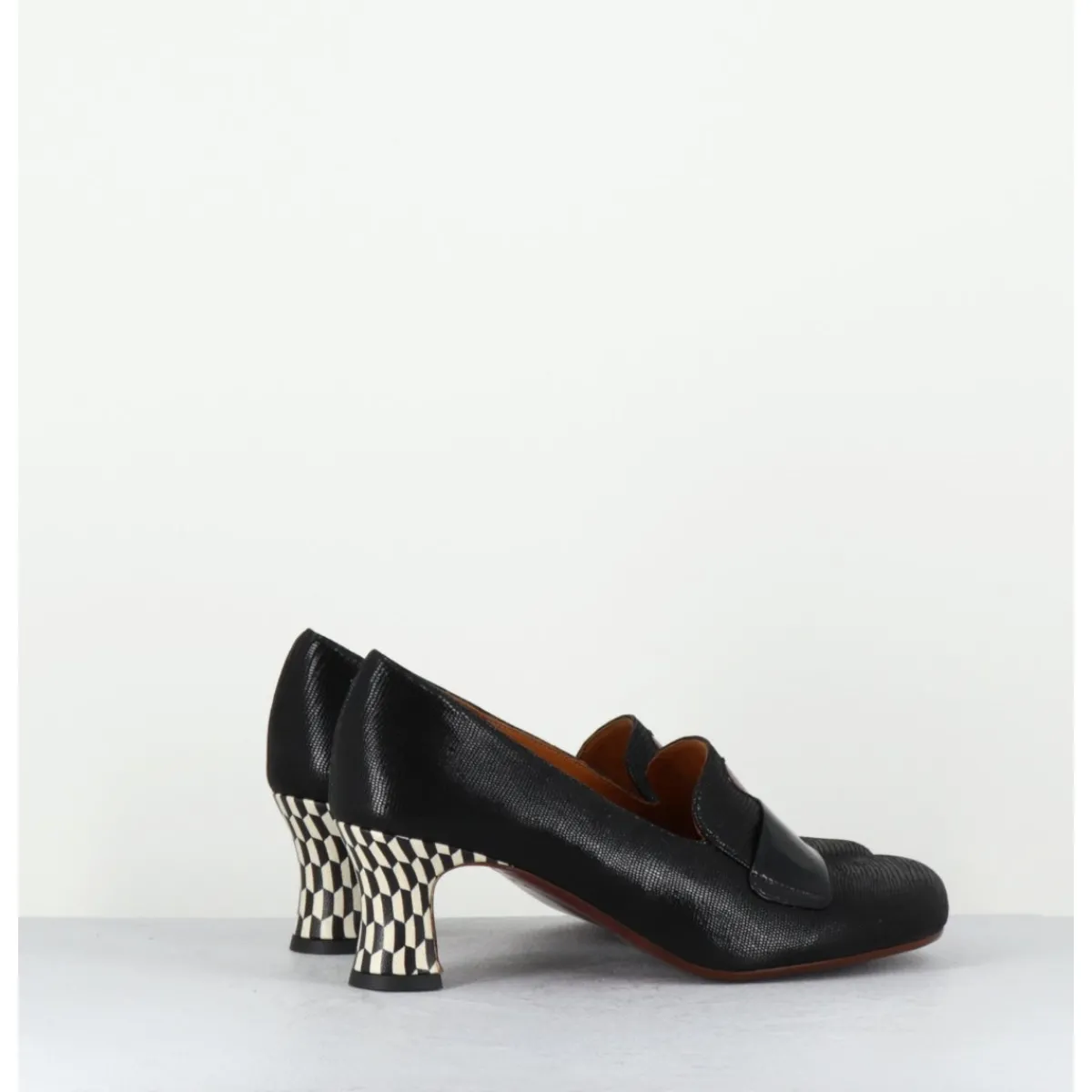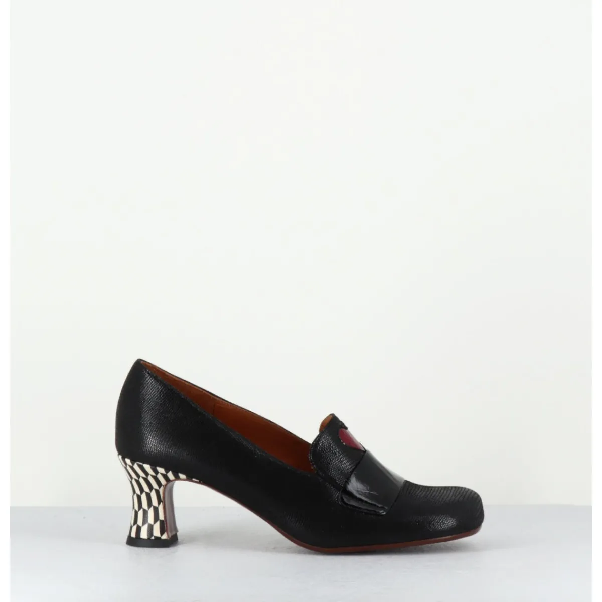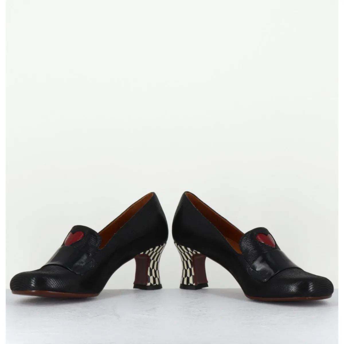 Chaussures en daim noir texturé, bout carré arrondi, orné d’un petit coeur rouge sur l’empeigne, montées sur un petit talon bobine au look rétro recouvert de cuir impression damier