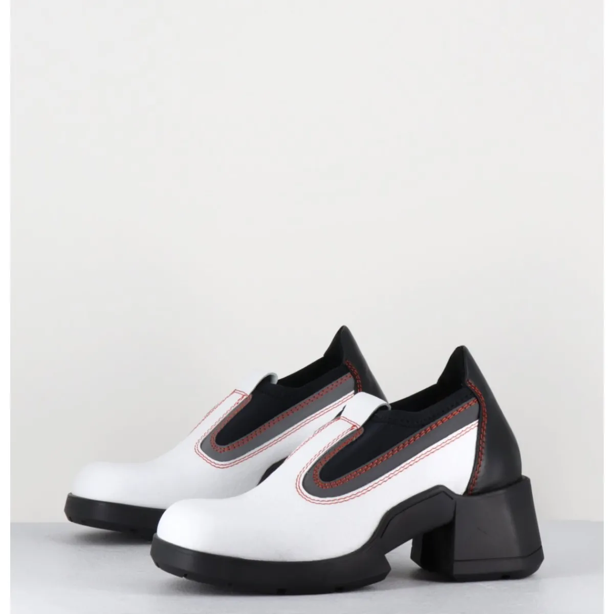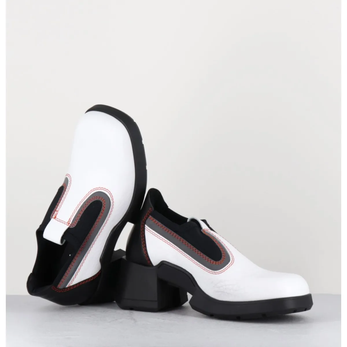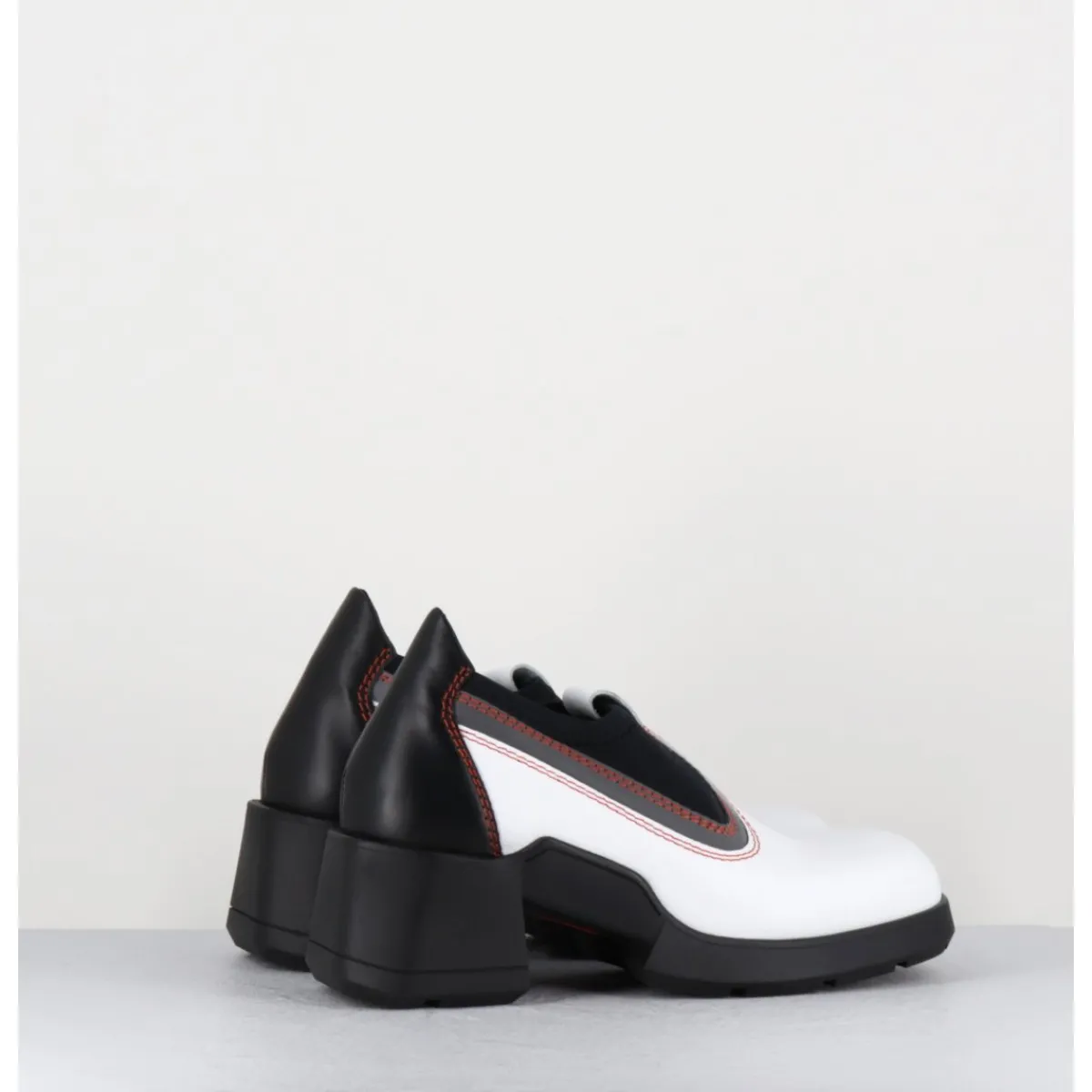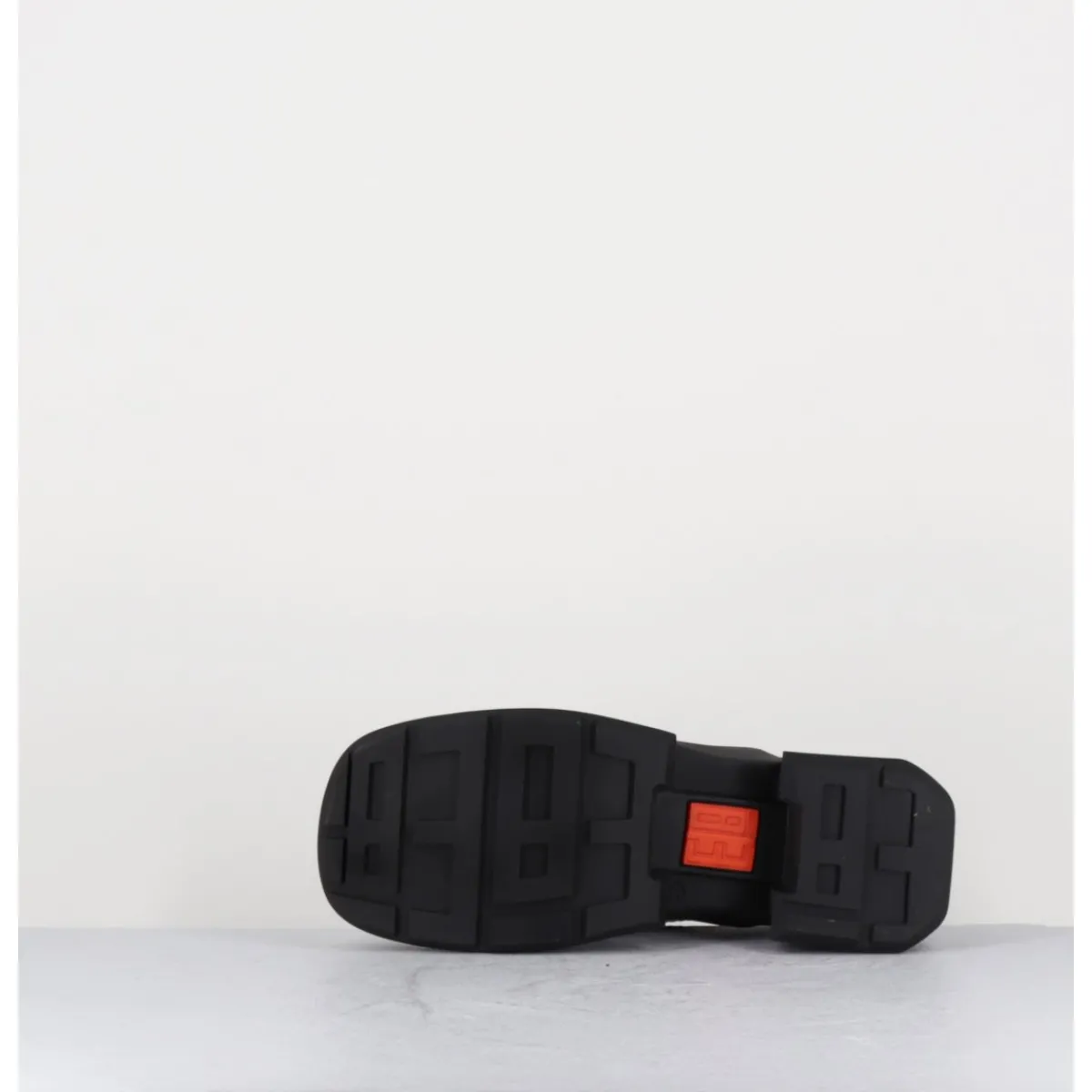 « Practical shoes » Kuda est faite pour s’enfiler, multi matière entre sportwear et futurisme des années 90s, elles présente un bout carré arrondi, une base en cuir grainé blanc, une partie faite de lycra stretch noir avec empiècements de textile gris 3M réfléchissant et coutures orange contrastantes