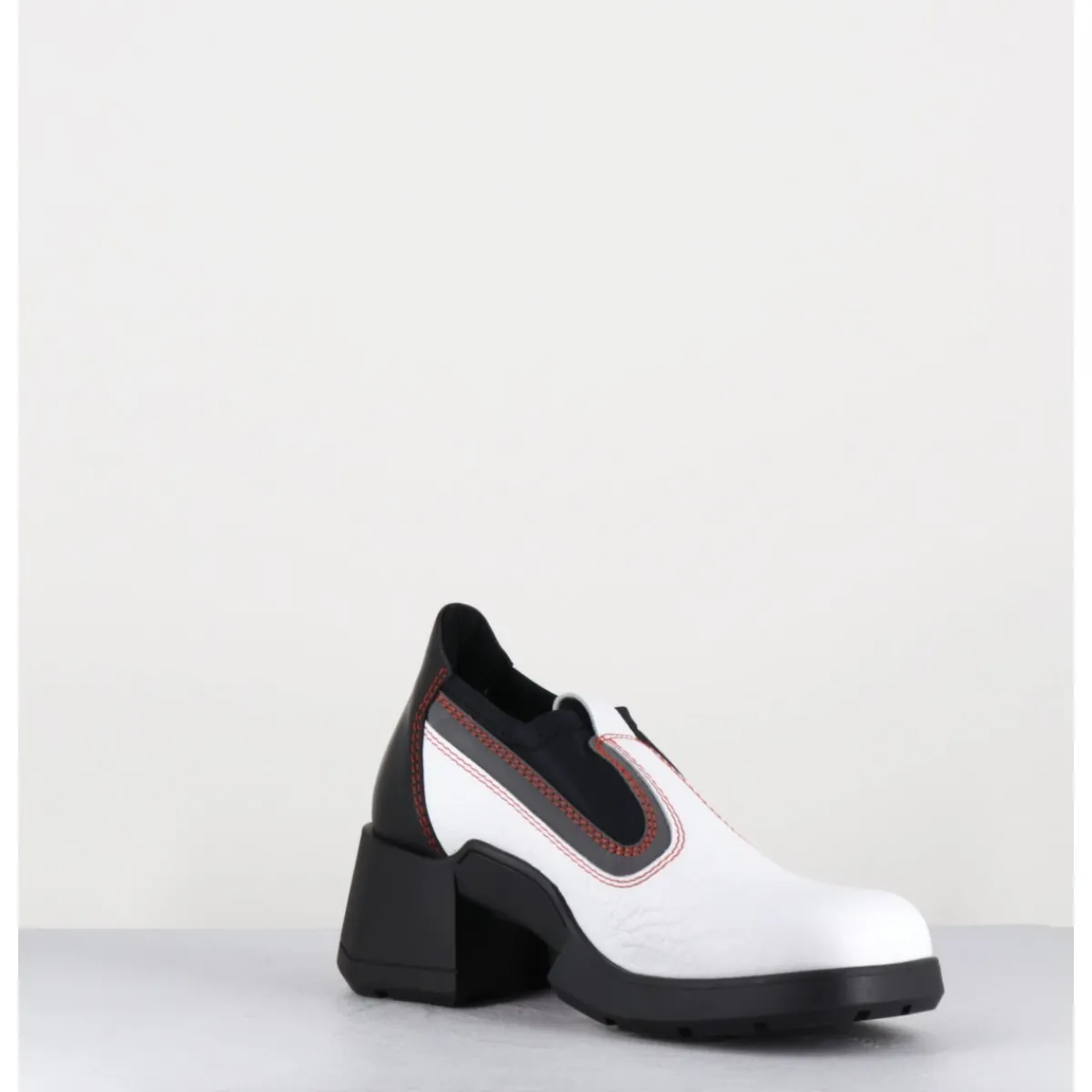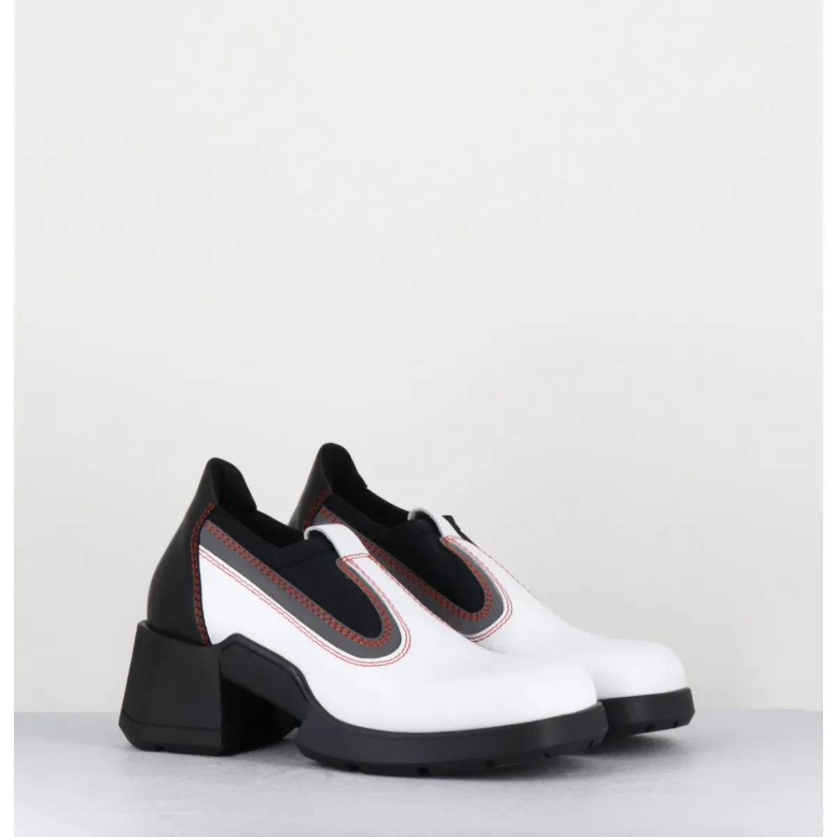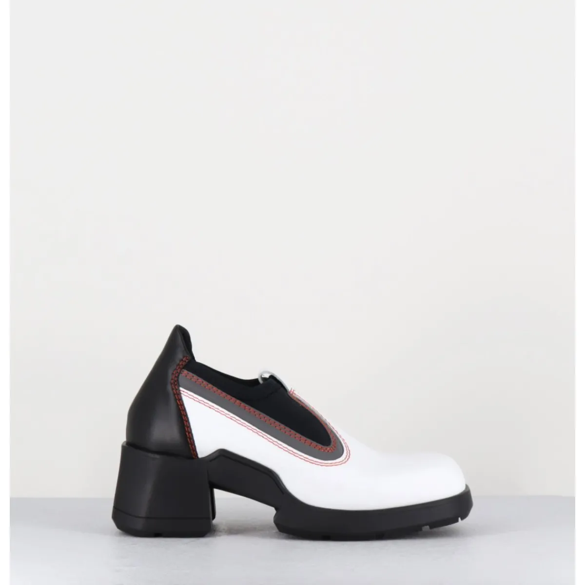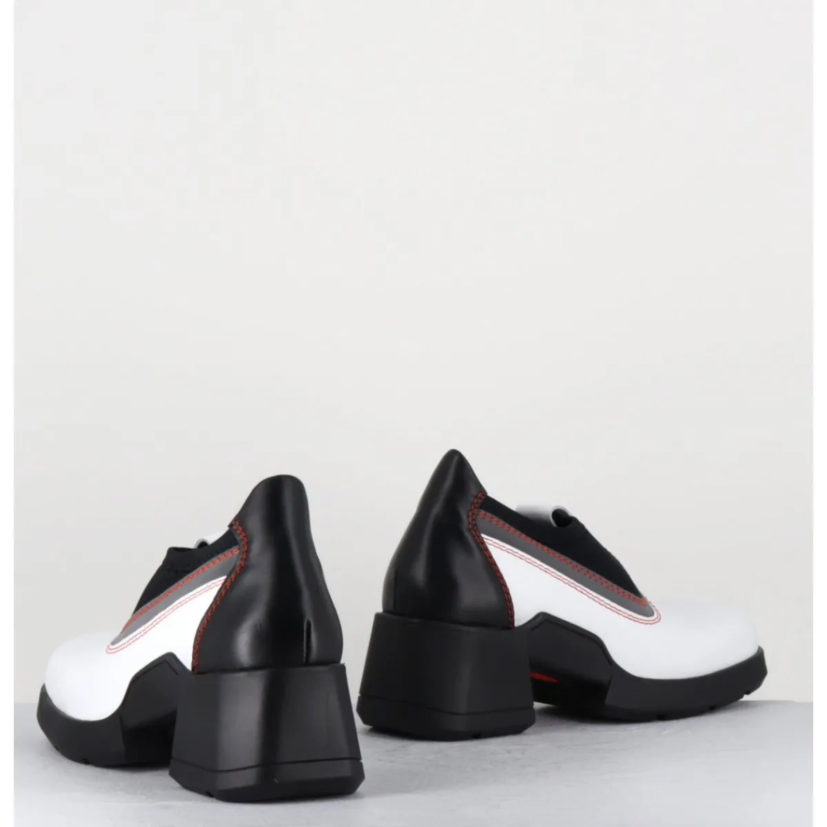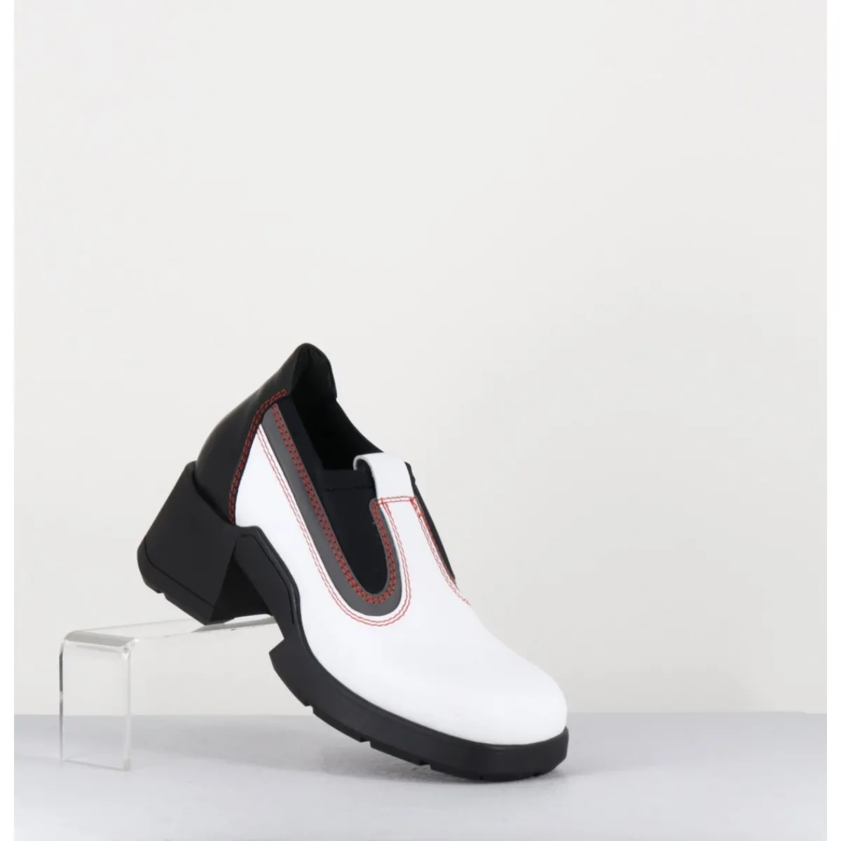 « Practical shoes » Kuda est faite pour s’enfiler, multi matière entre sportwear et futurisme des années 90s, elles présente un bout carré arrondi, une base en cuir grainé blanc, une partie faite de lycra stretch noir avec empiècements de textile gris 3M réfléchissant et coutures orange contrastantes
