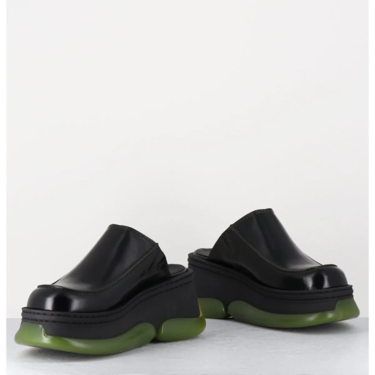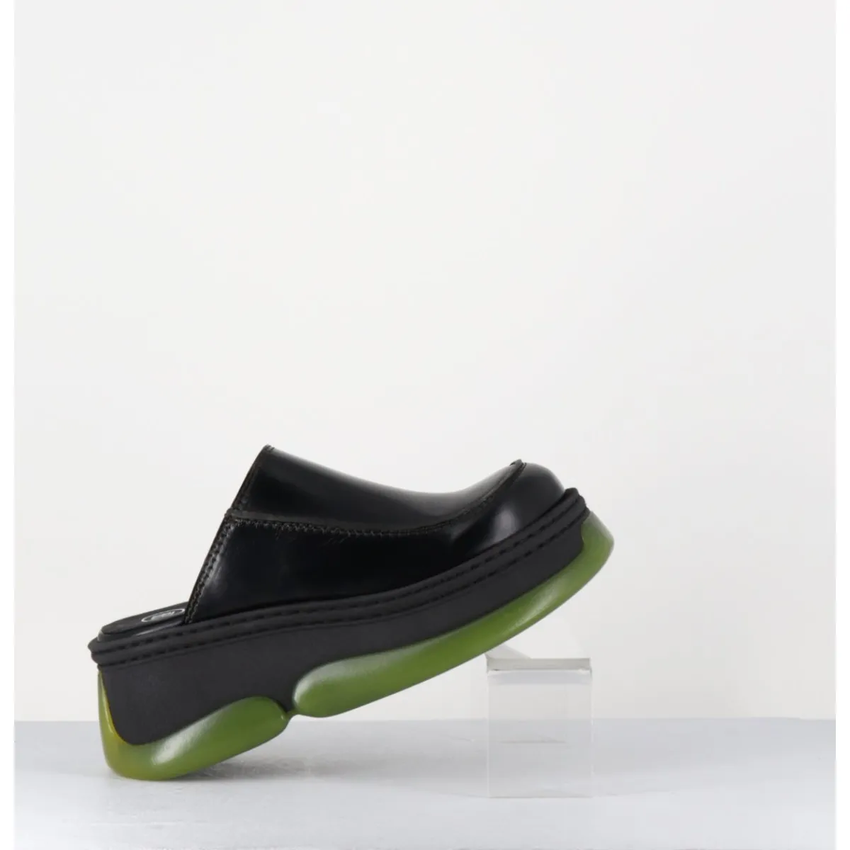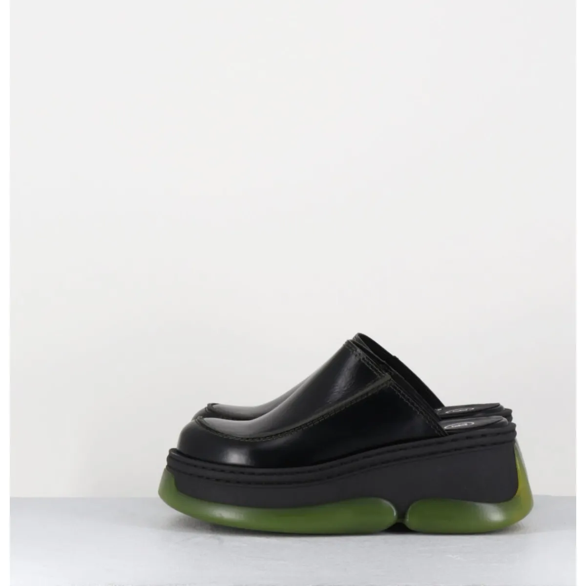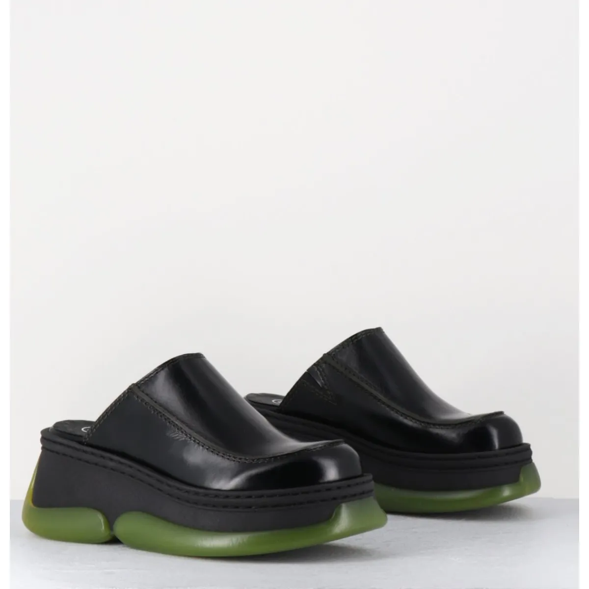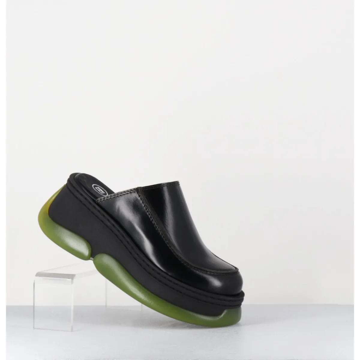Mules inspirées de la mode japonaise esprit futuriste des années 90, Brietta présente une base en cuir noir avec surpiques contrastantes et est montée sur une semelle compensée en gomme avec des inserts de gomme effet « bubble » jaune translucide