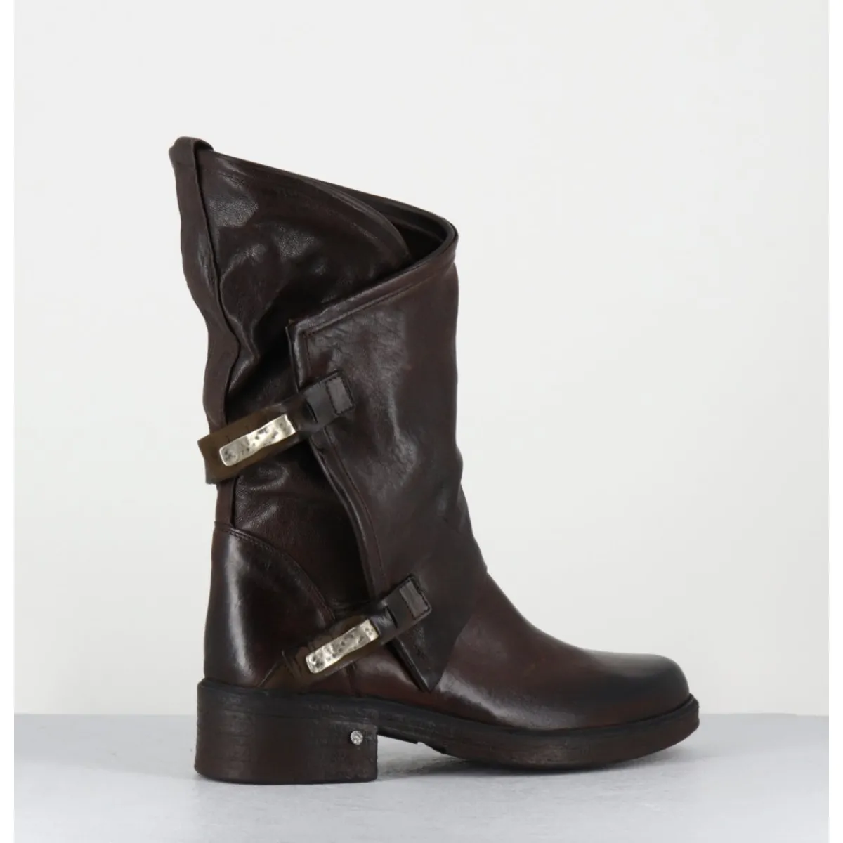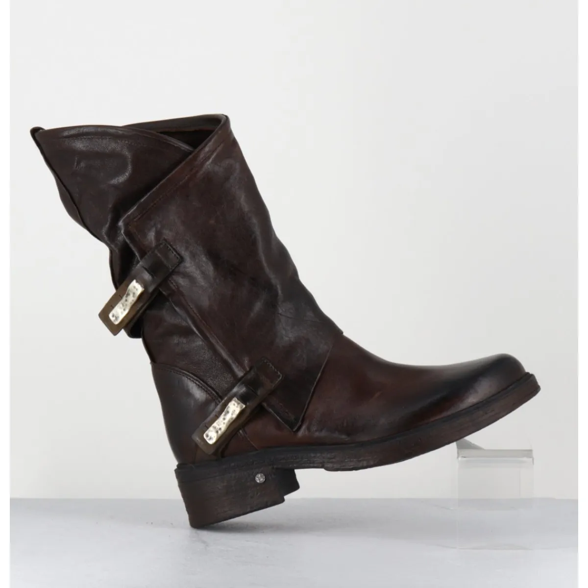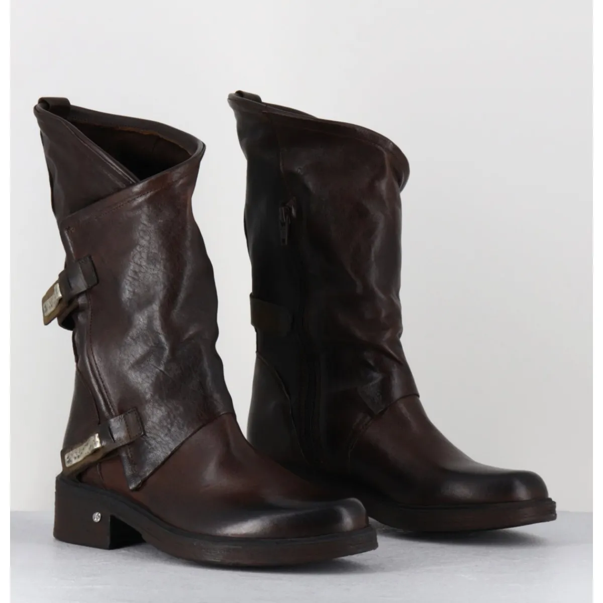Boots esprit bikers en cuir marron chocolat brossé au noir pour un effet vintage, coupe asymétrique avec système de clip argent, montées sur une semelle en gomme légère