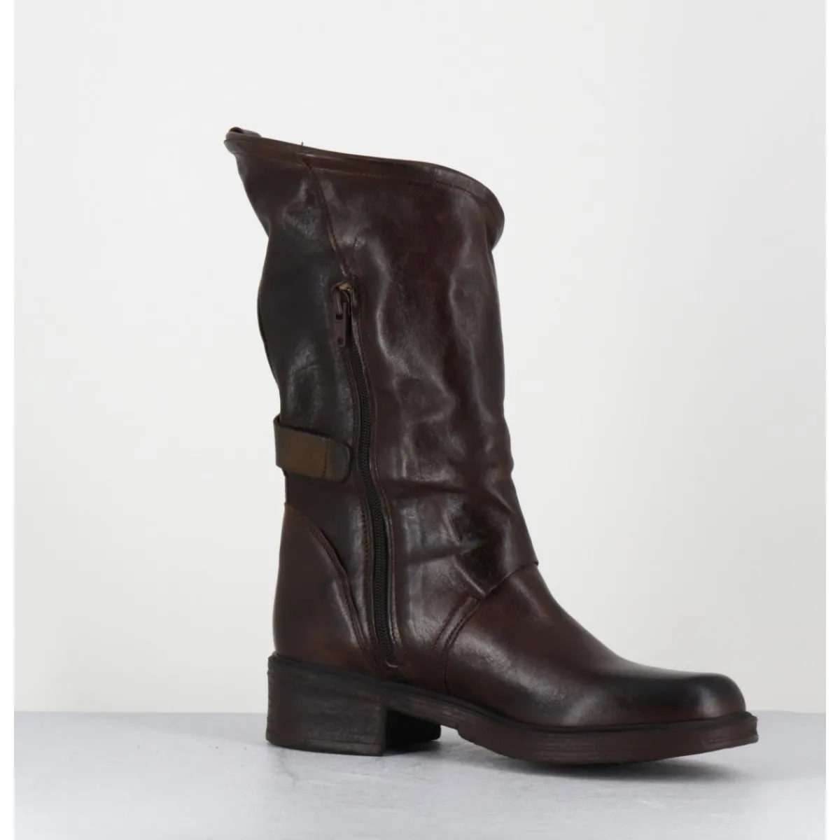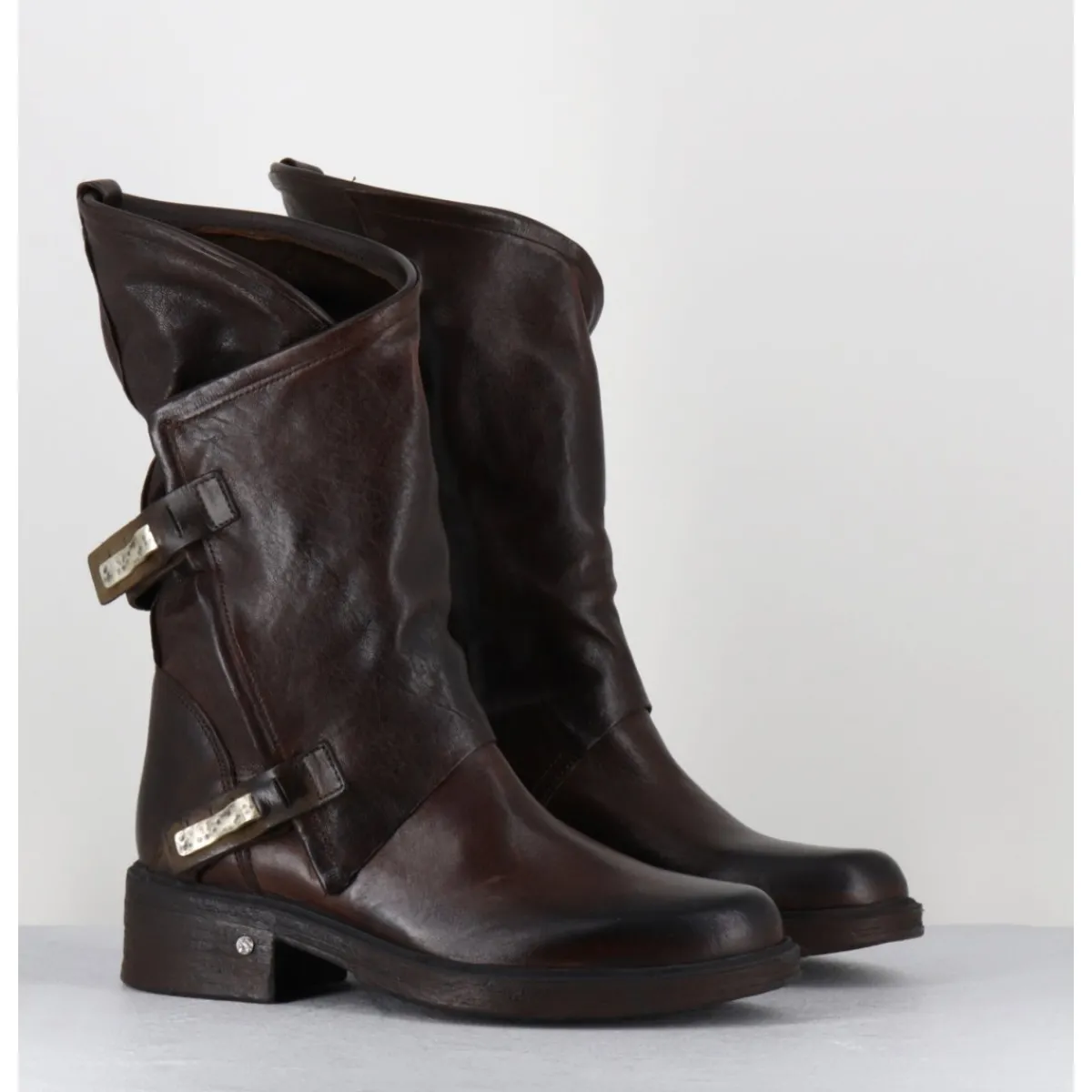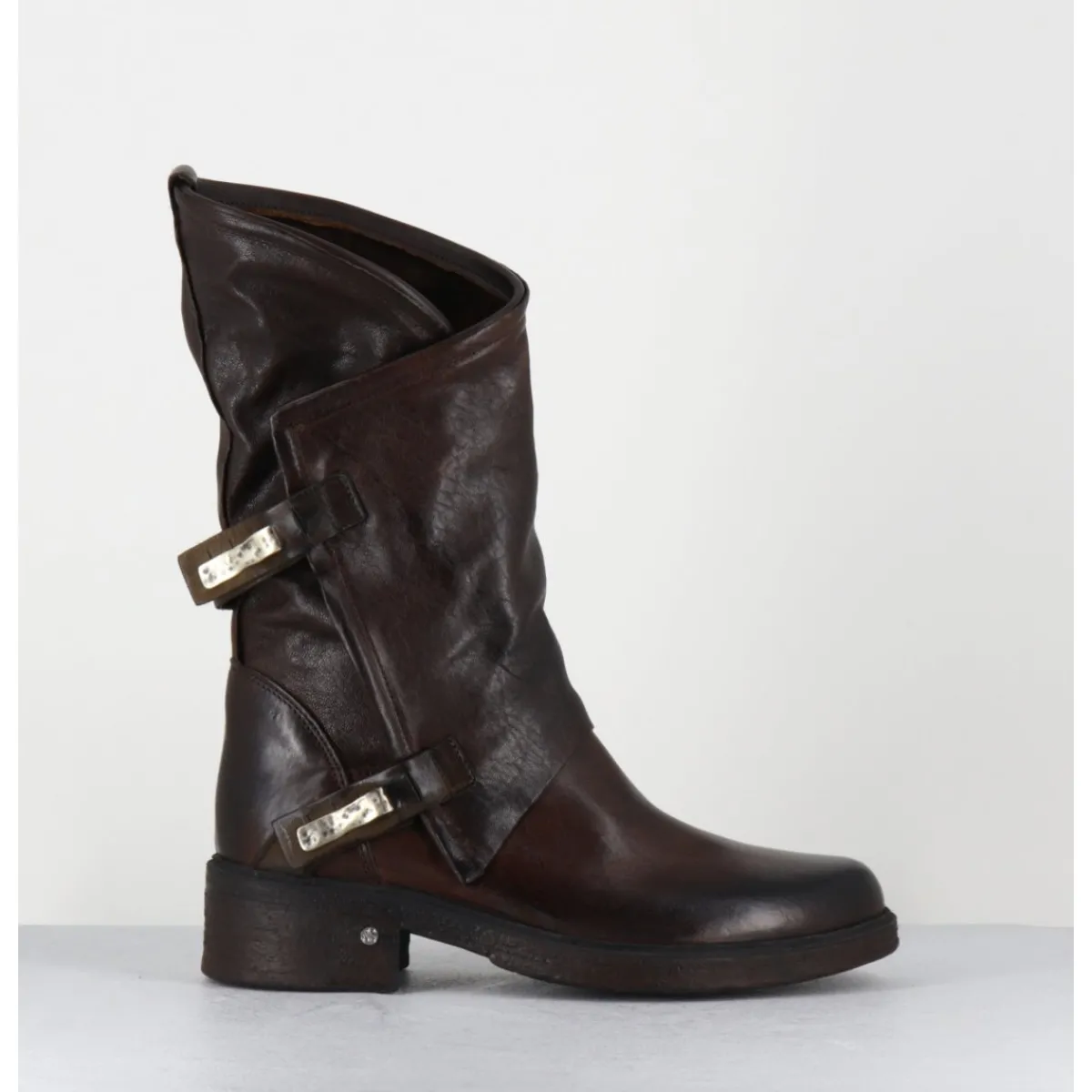 Boots esprit bikers en cuir marron chocolat brossé au noir pour un effet vintage, coupe asymétrique avec système de clip argent, montées sur une semelle en gomme légère