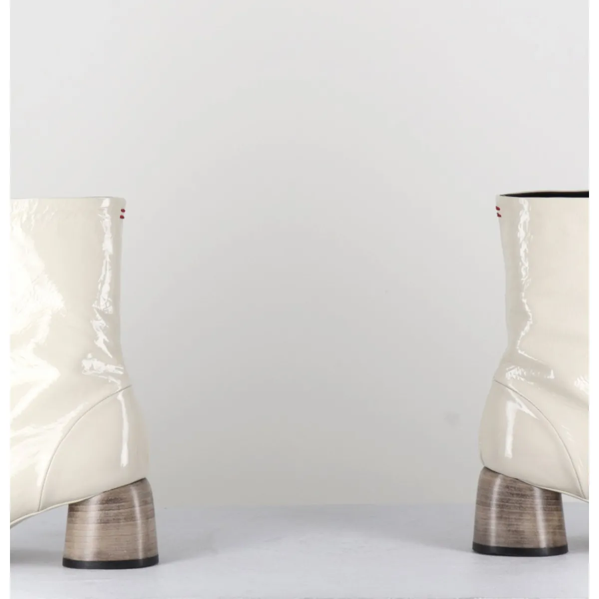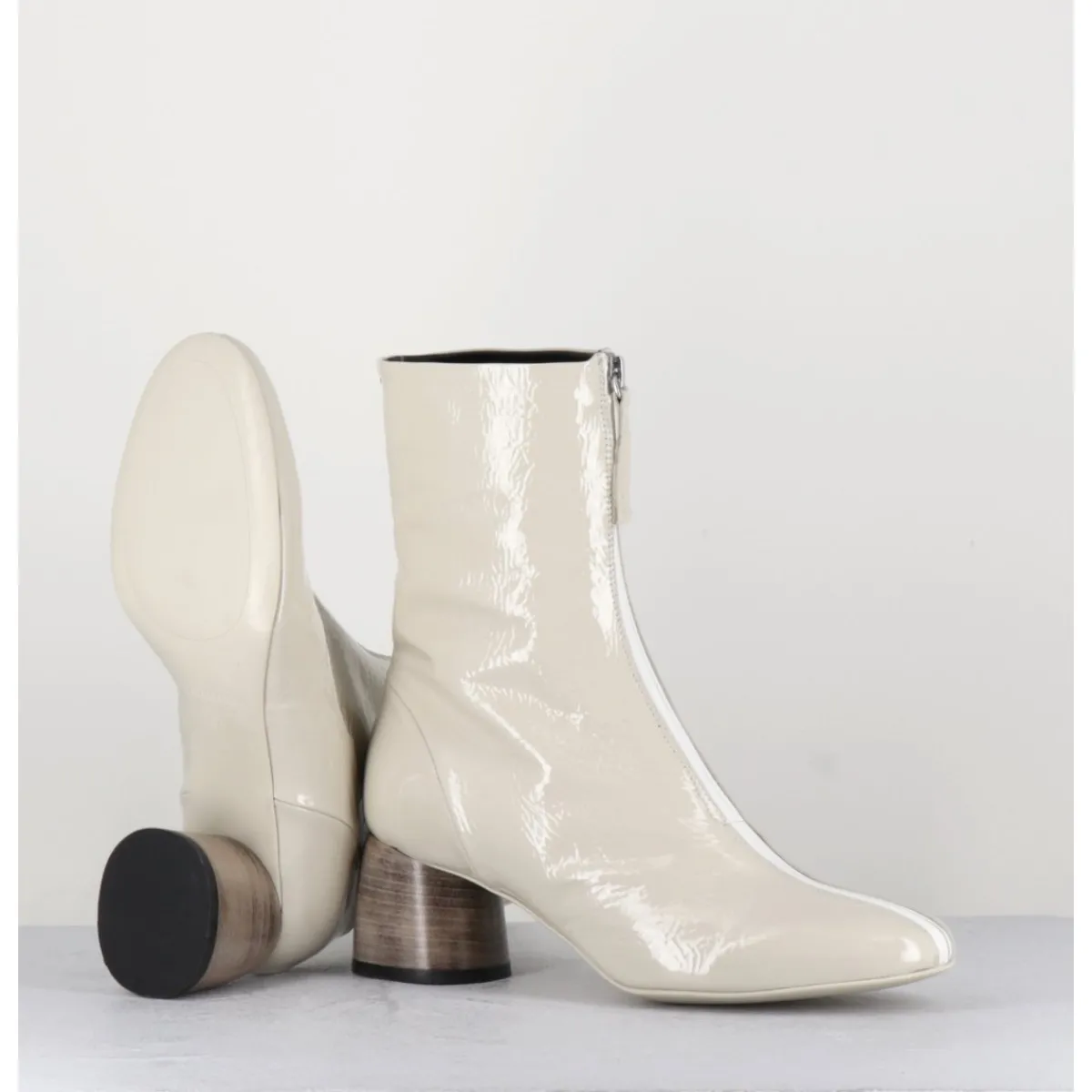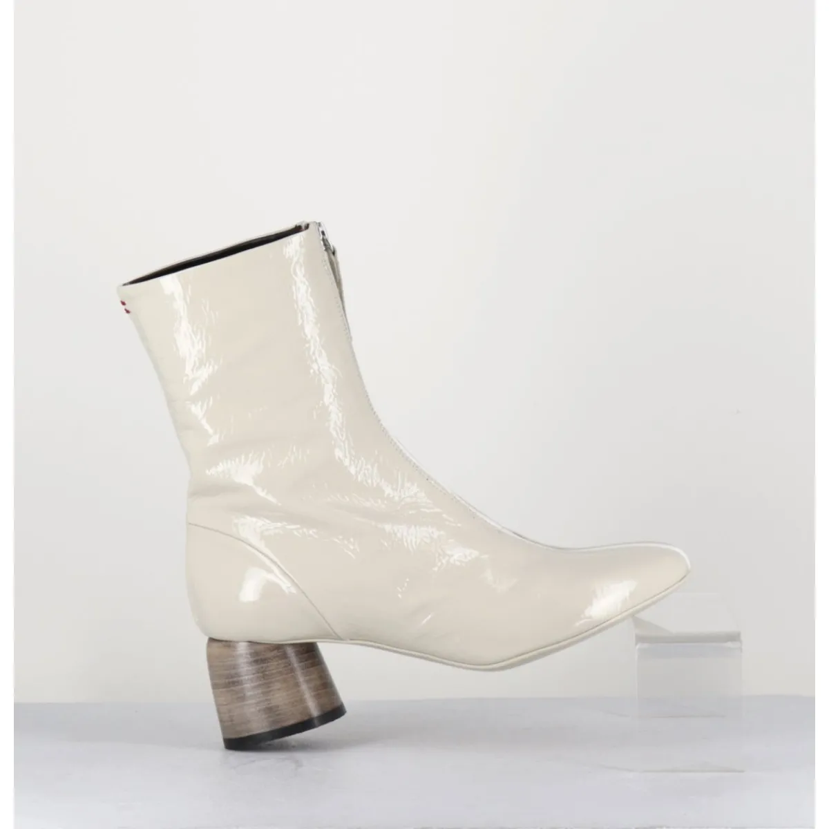 Boots en cuir vernis souple blanc cassé, zip central esprit 60s, montées sur un petit talon cylindrique stylisé peint à la main en gris dégradé. Space Age !