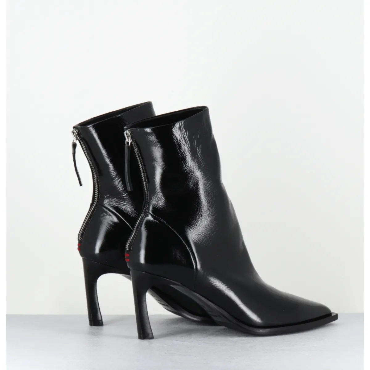 Boots bout pointu en cuir noir souple finition brillante, montées sur un talon fin stylisé et une semelle à débord noire