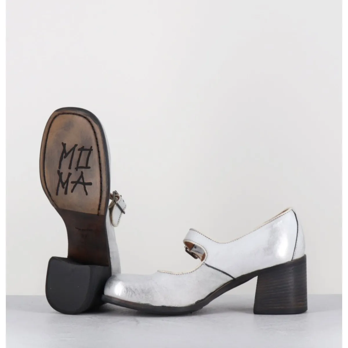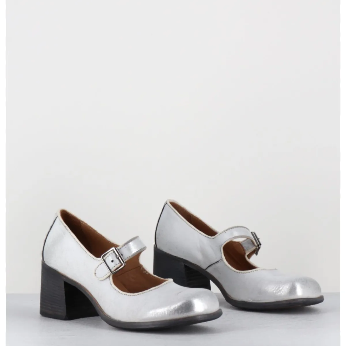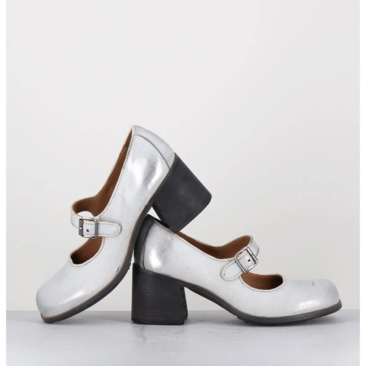 Chaussures babies en cuir souple métallisé argent, ligne pure esprit avant-garde, bout carré-arrondi, montées sur une semelle cousue et lavée à la main pour un effet usé et un talon bloc confortable