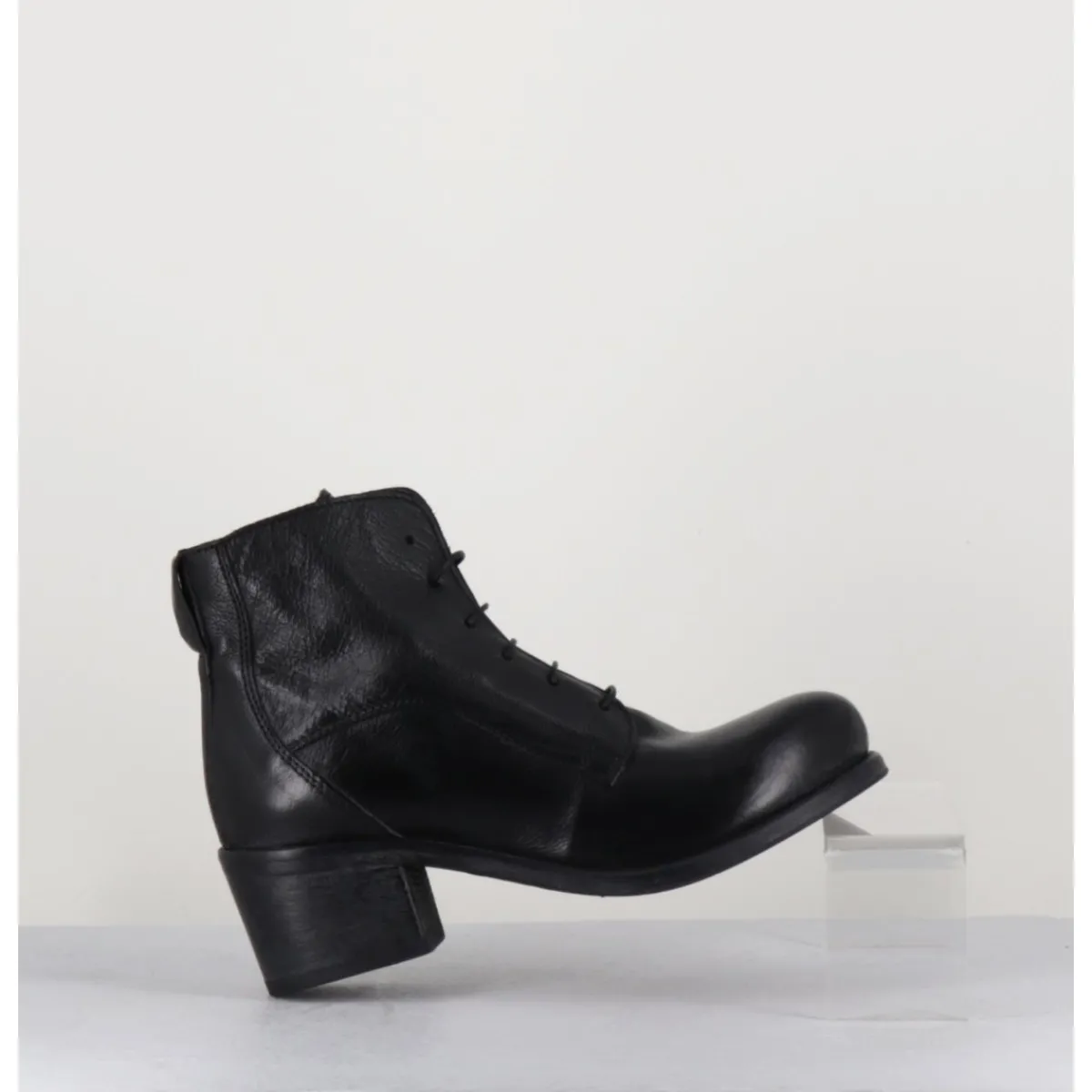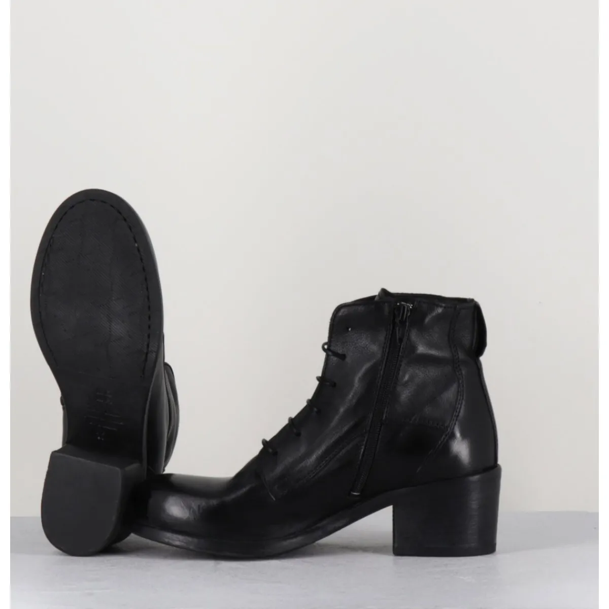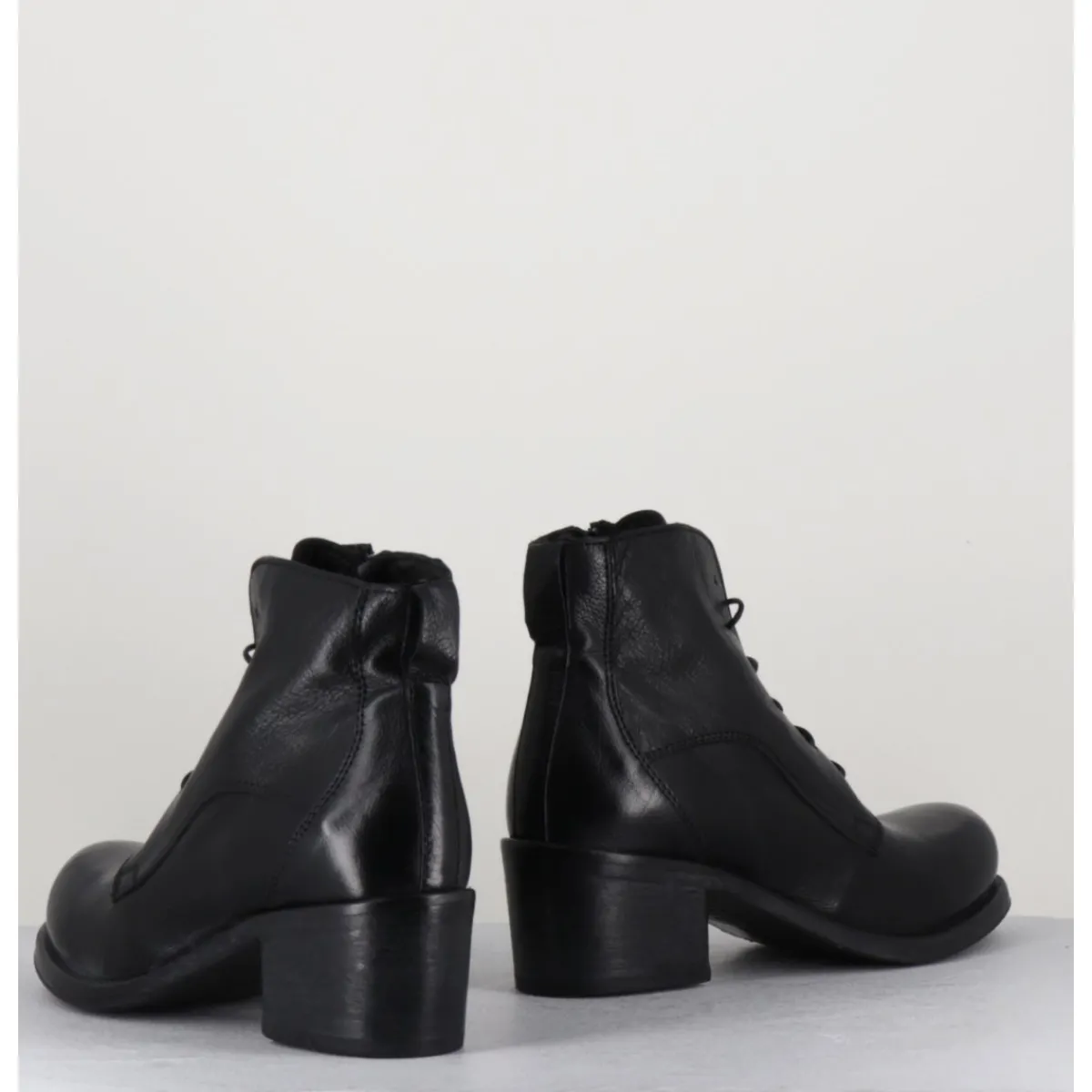 Chaussures en cuir noir, zip intérieur, bout rond, empiècements & coutures ton sur ton, lacets fins noirs montées sur un talon bloc confortable et une semelle cousue main.
