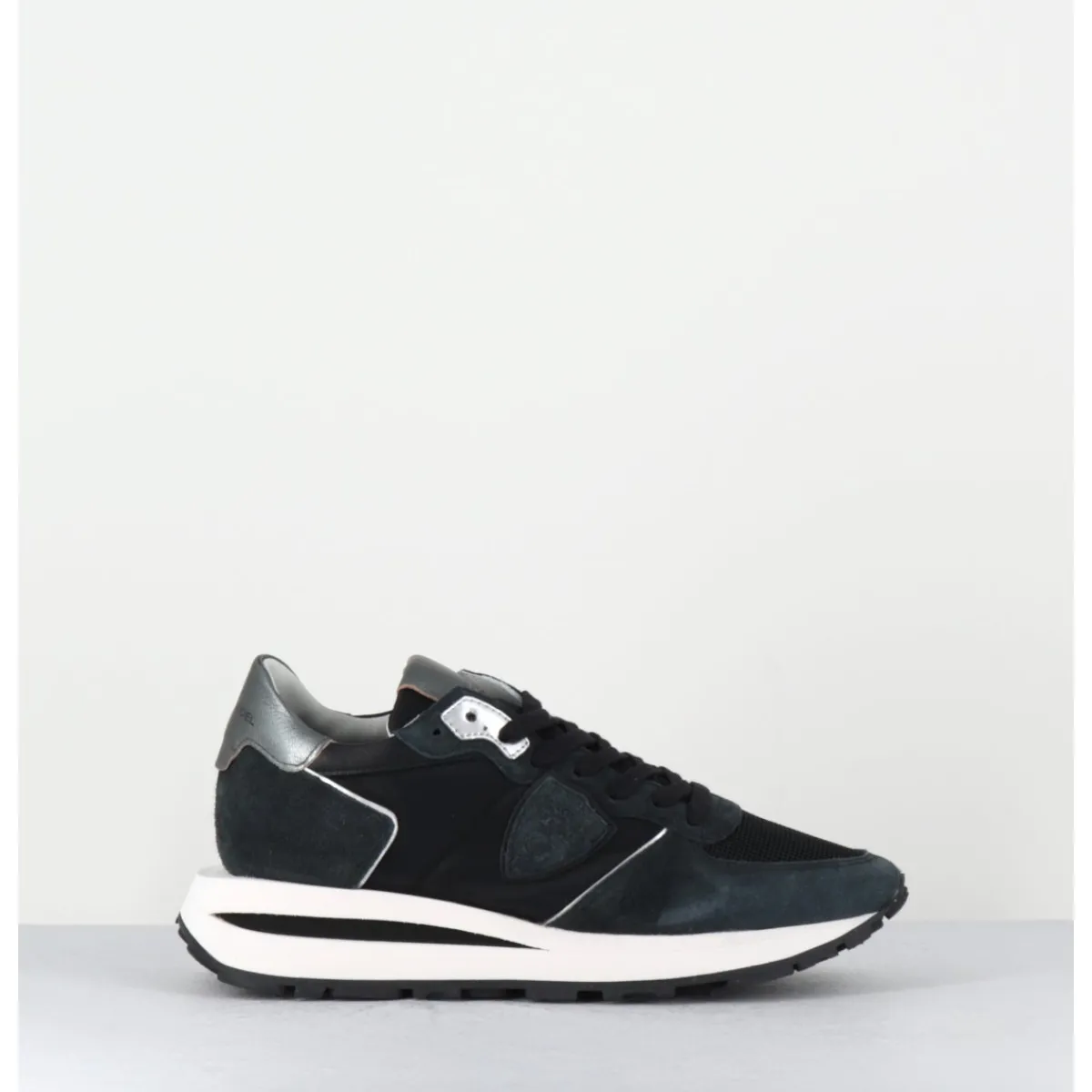 Basket avec tige en tissu technique et mesh, avec empiècements en suède et cuir laminé. Semelle en mémoire de forme amovible, avec doublure intérieure en tissu. Semelle en caoutchouc ultra-léger fraisée artisanalement avec un empiècement tridimensionnel contrasté sous le talon.