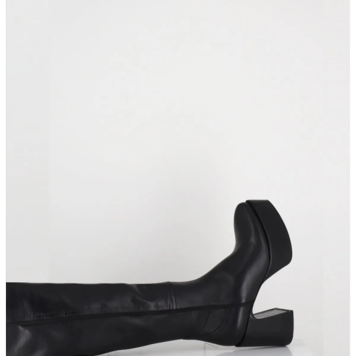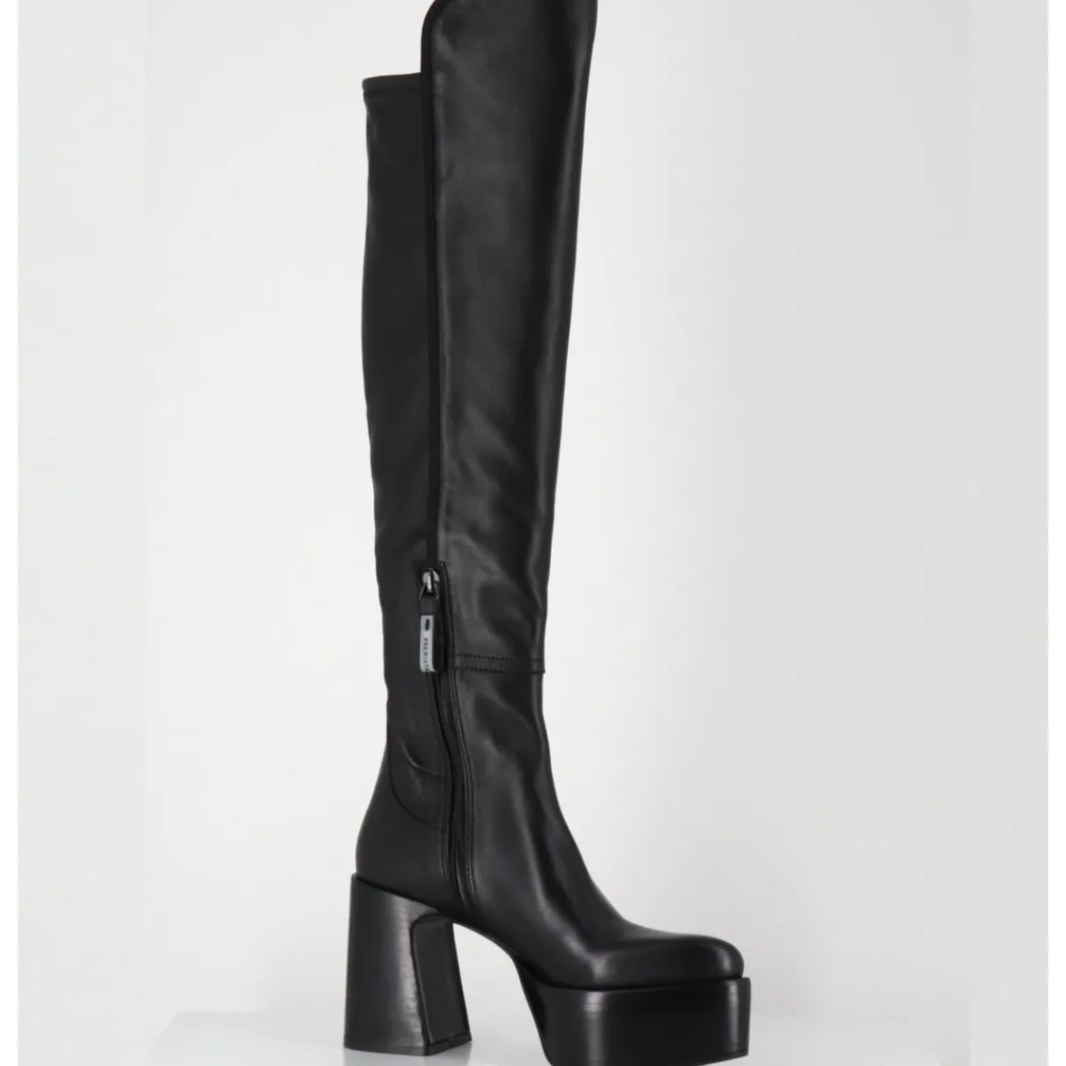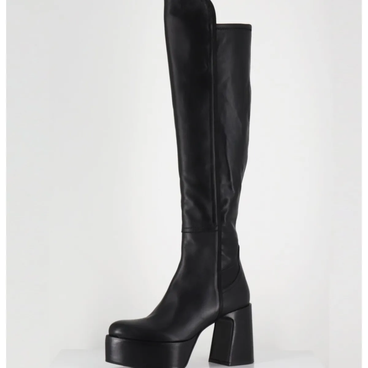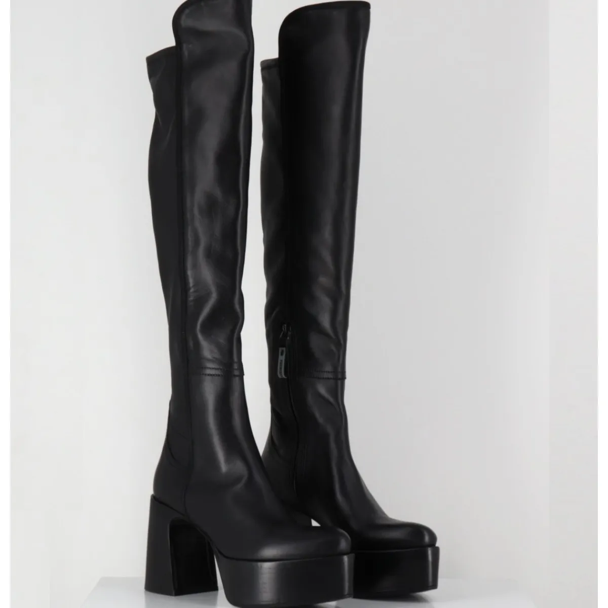 Bottes cuissardes à plateforme en cuir souple & agneau stretch à l’arrière pour un effet galbant, bout pointu soft, zip intérieur, montées sur un talon large