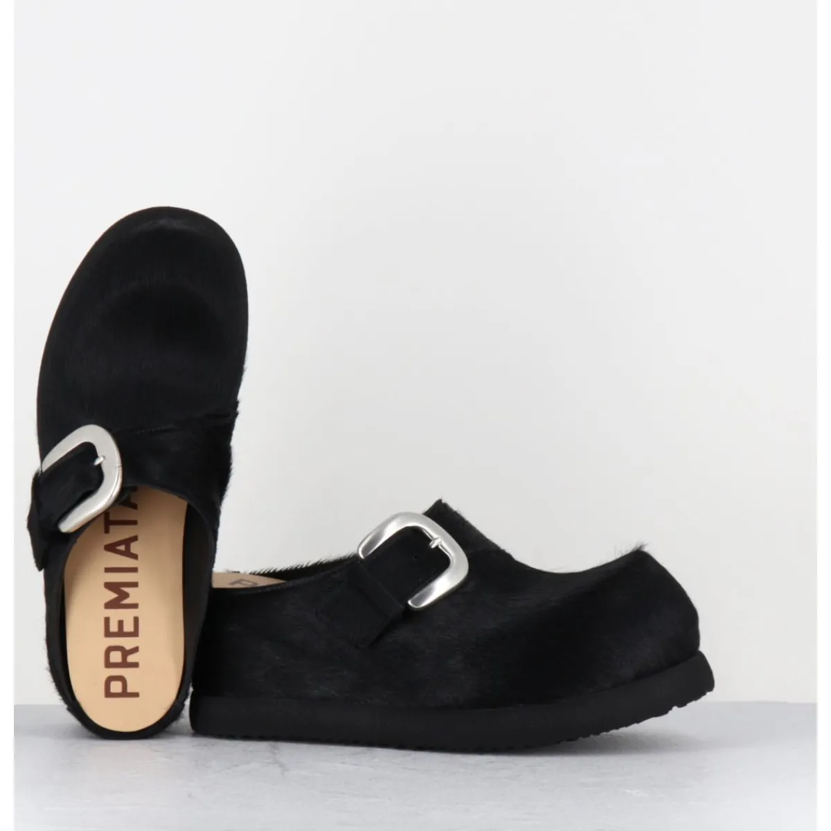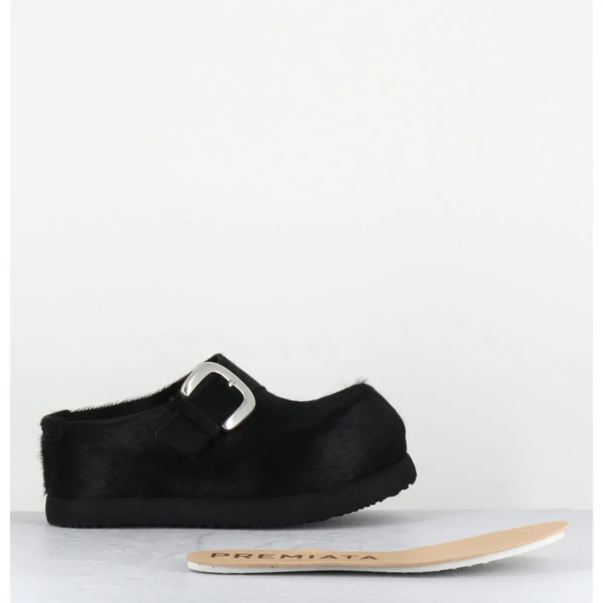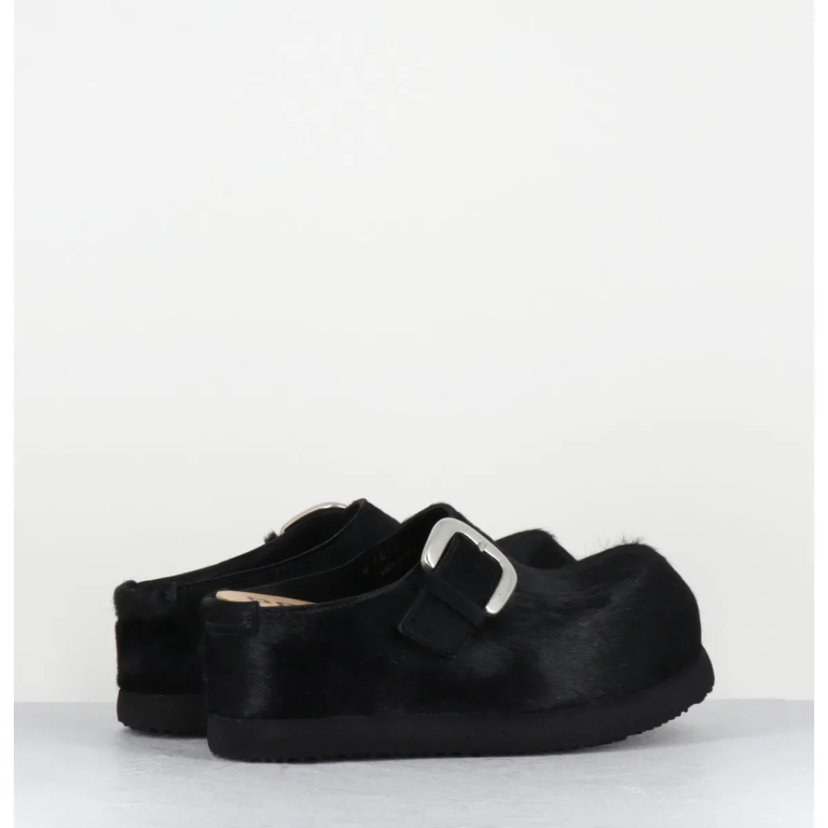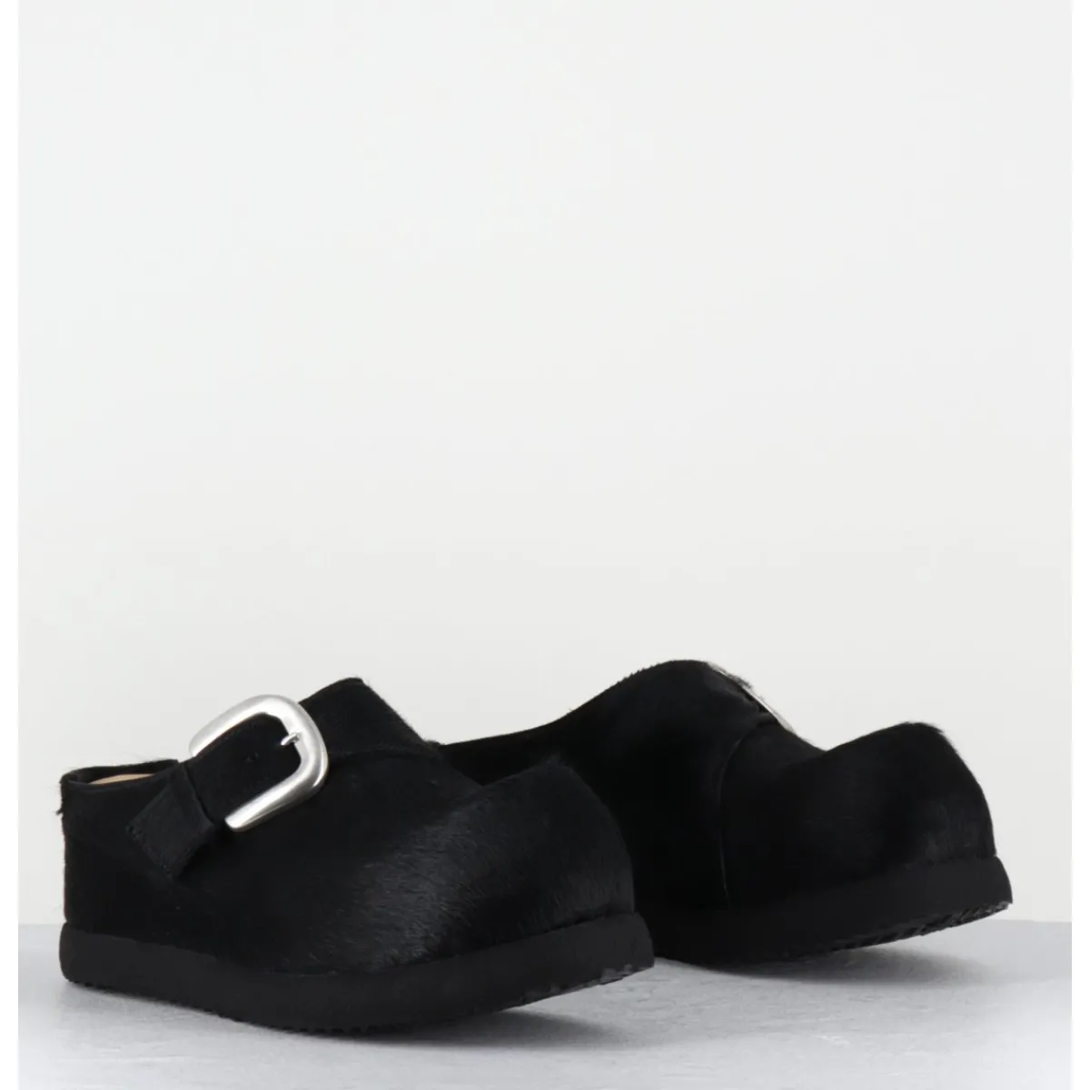 Chaussures sabots en ‘poulain’ noir, forme exagérée et déstructurée à l’avant, boucle argent mat, semelle intérieure à mémoire de forme amovible, montées sur une plateforme ultra légère et une semelle en micro-fibre
