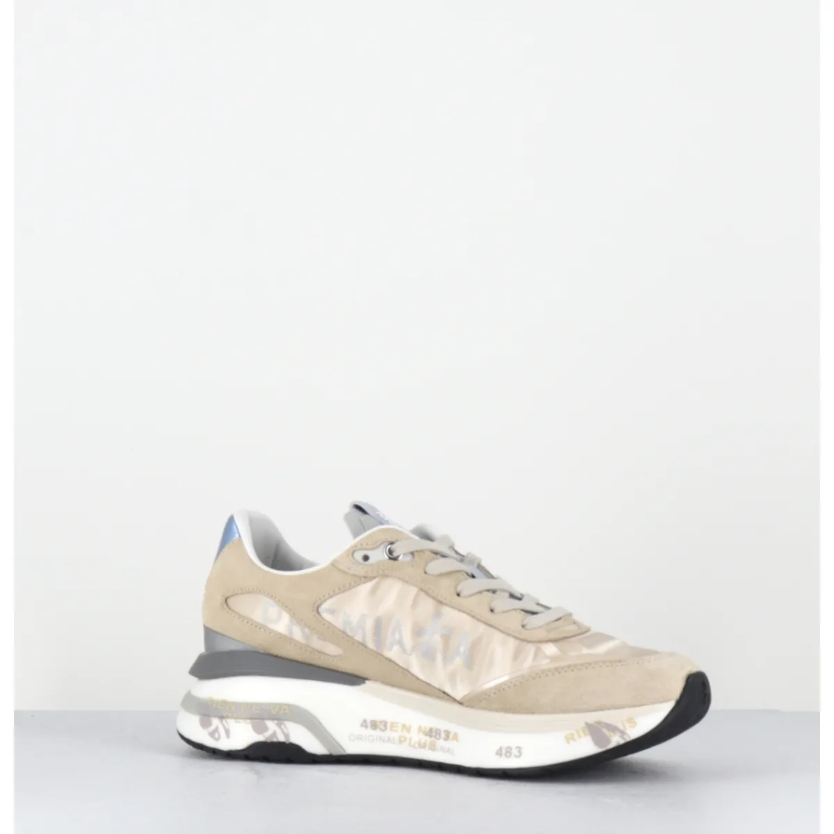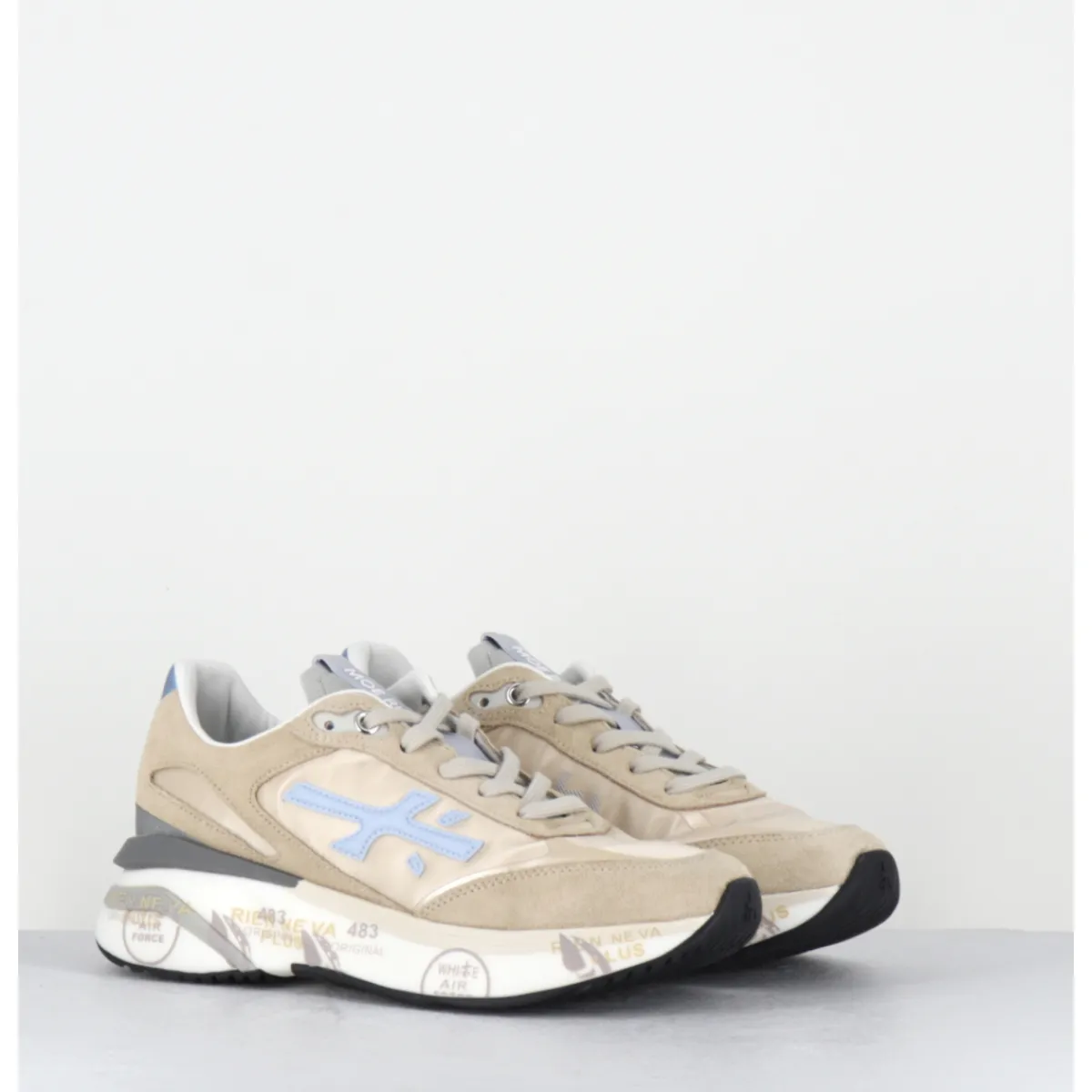 Sneakers esprit années 90, semelle ultra light innovante chez Premiata, daim beige et empiècement de toile nylon avec détails cuir bleu ciel, montées sur une semelle épaisse blanche en micro fibre, avec imprimé signature de la Maison Italienne Premiata.