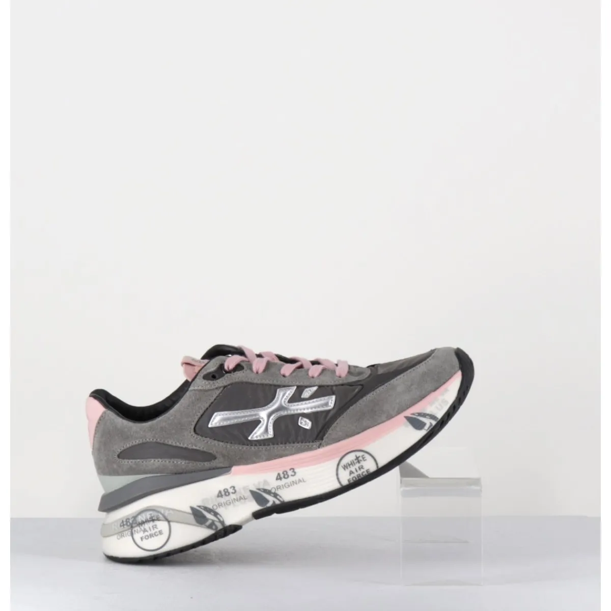 Sneakers esprit années 90, semelle ultra light innovante chez Premiata, daim & toile gris foncé, détails de cuir argent & rose pale, montées sur une semelle épaisse blanche en micro fibre, avec imprimé signature de la Maison Italienne Premiata.