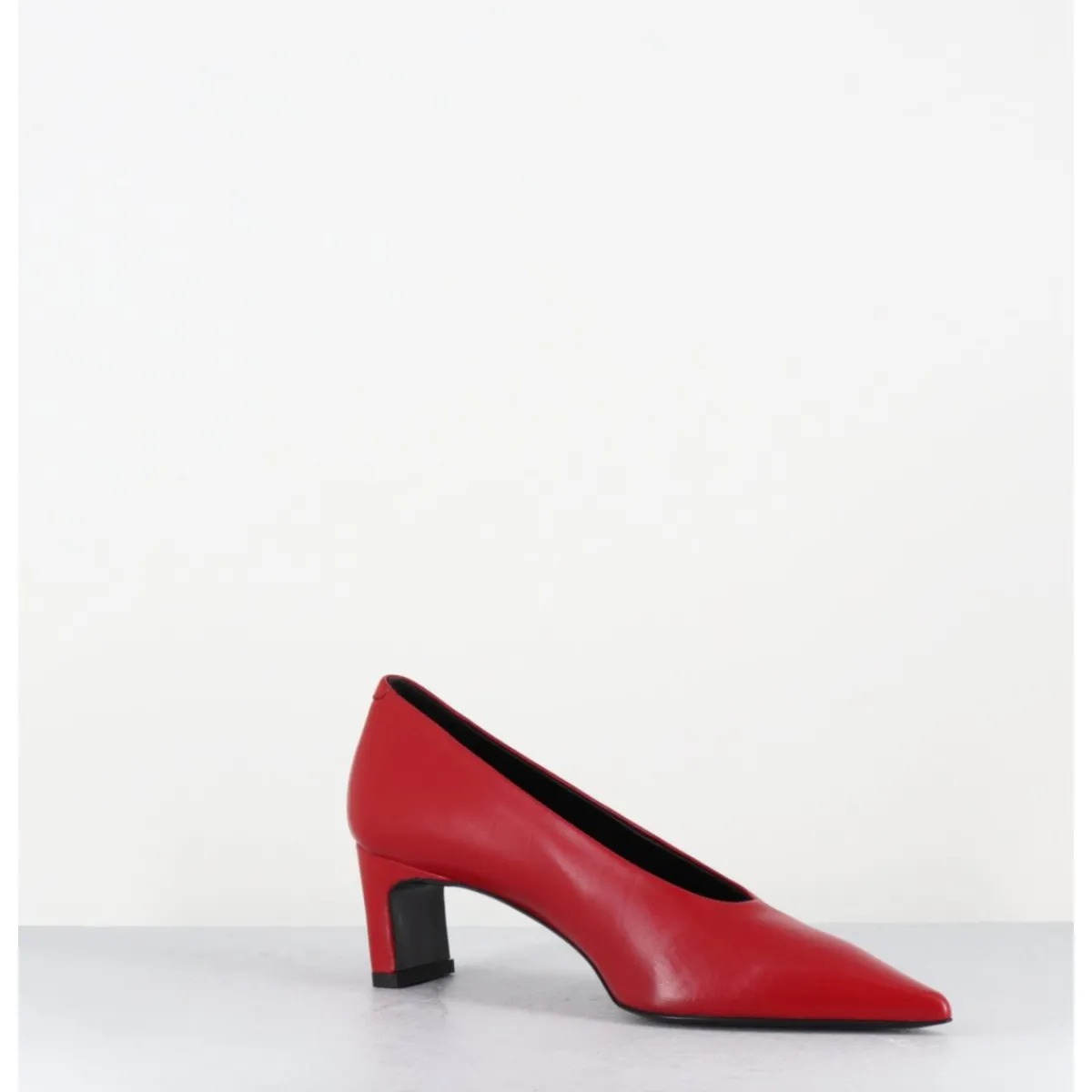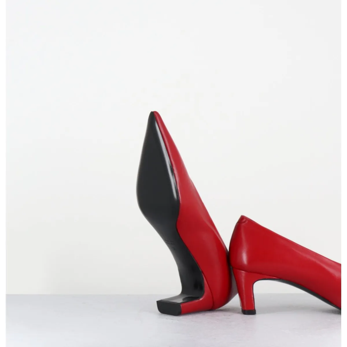 Escarpins bout pointu en cuir rouge rappelant les formes des années 80, ligne pure montée sur un petit talon structuré confortable