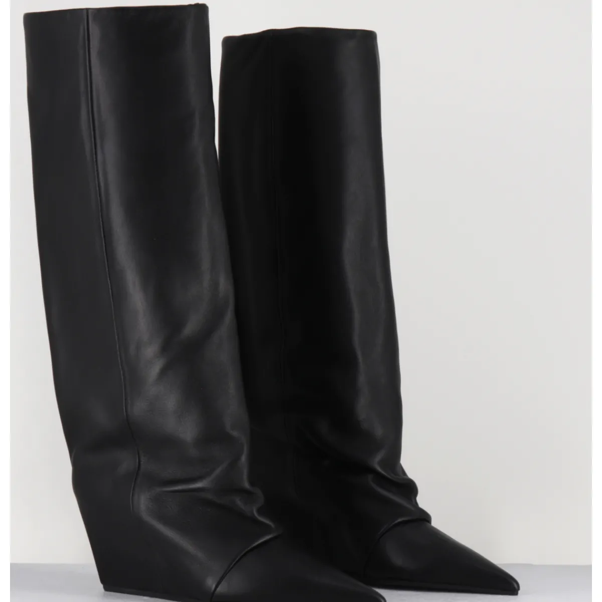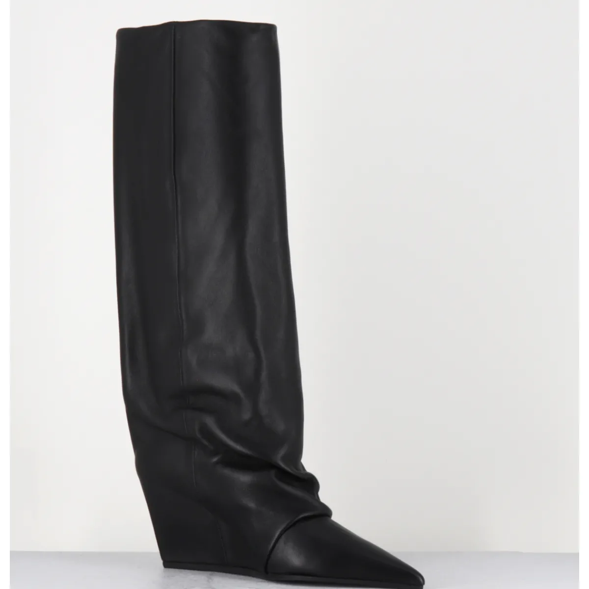 Bottes bout pointu en cuir noir à talon compensé, ligne froissée déstructurée