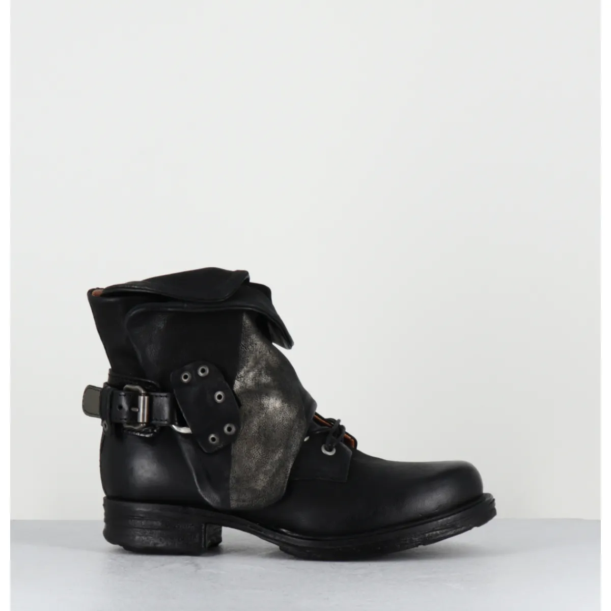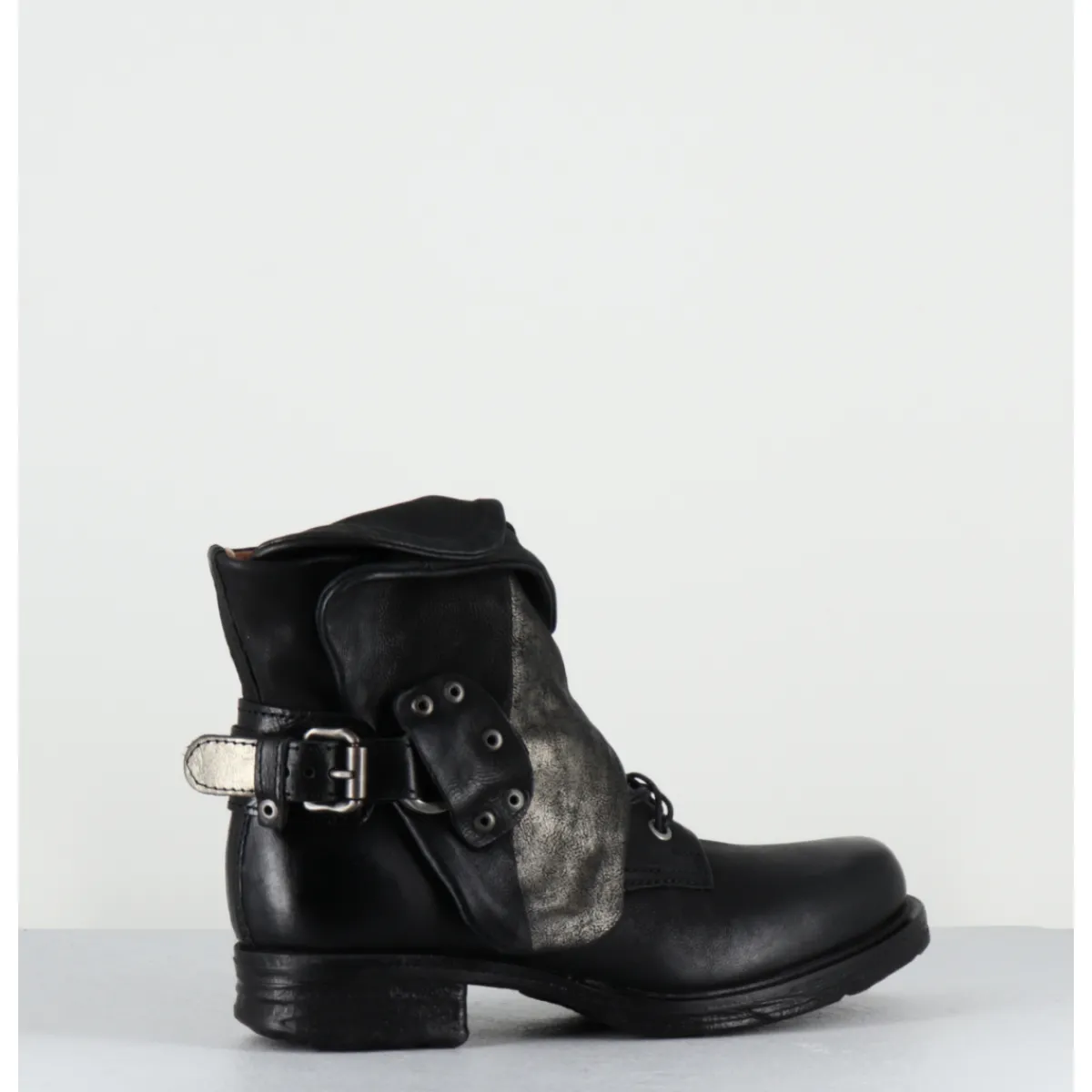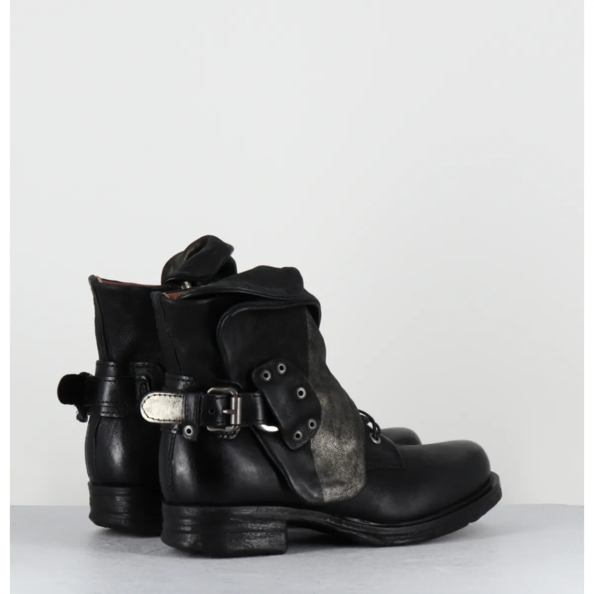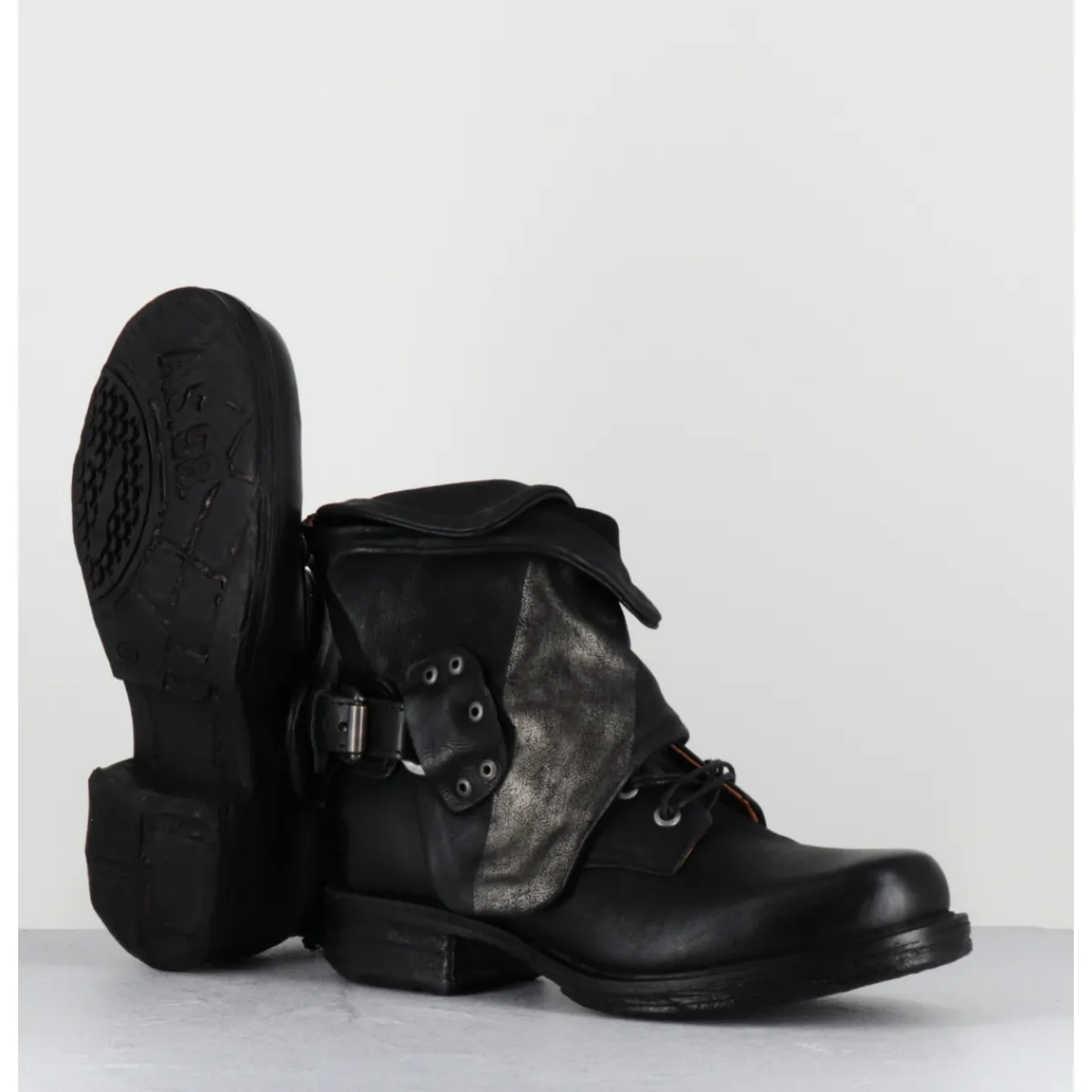 Boots rangers à lacets en cuir gras noir et doré avec empiècement asymétrique et sangle réglable à l’arrière esprit rock