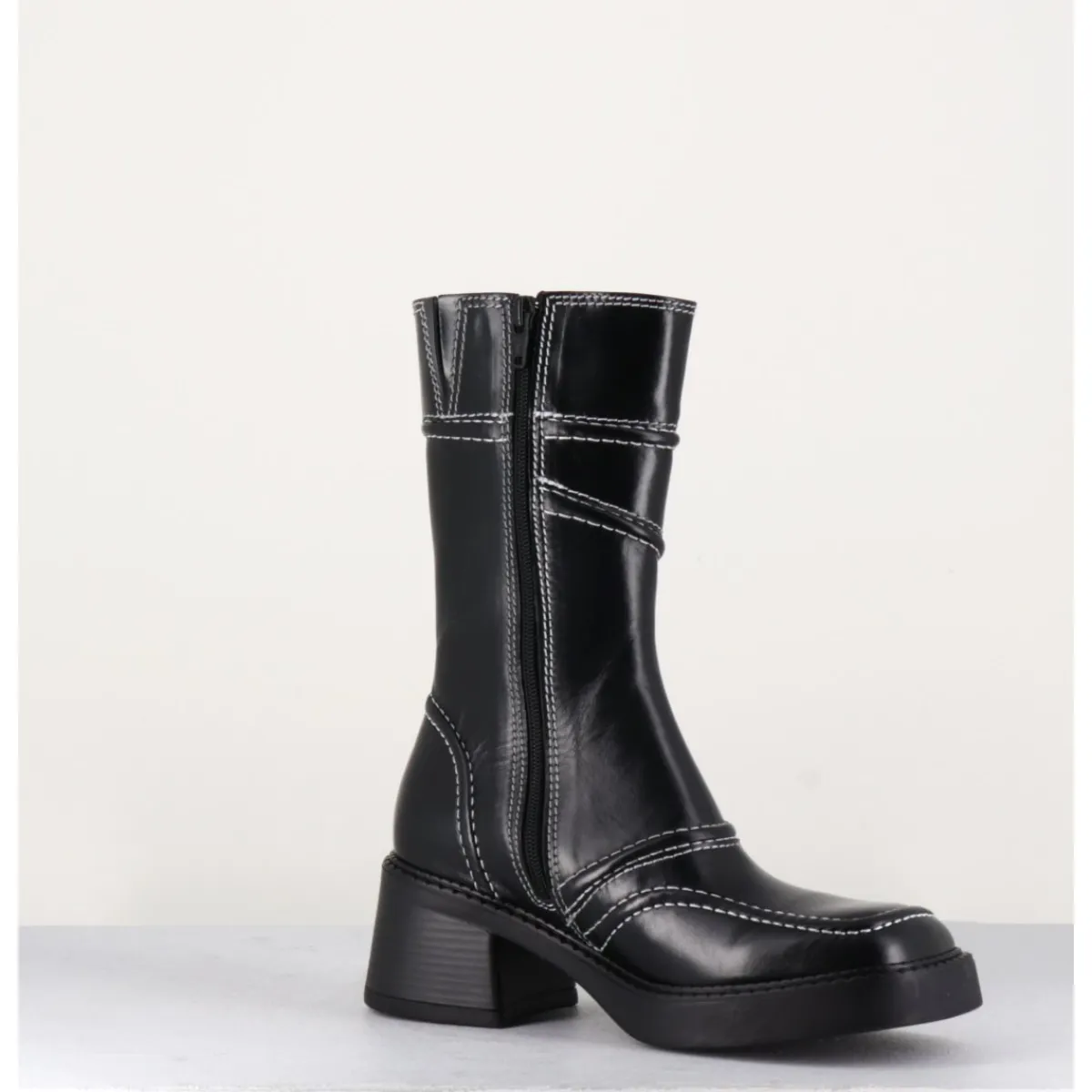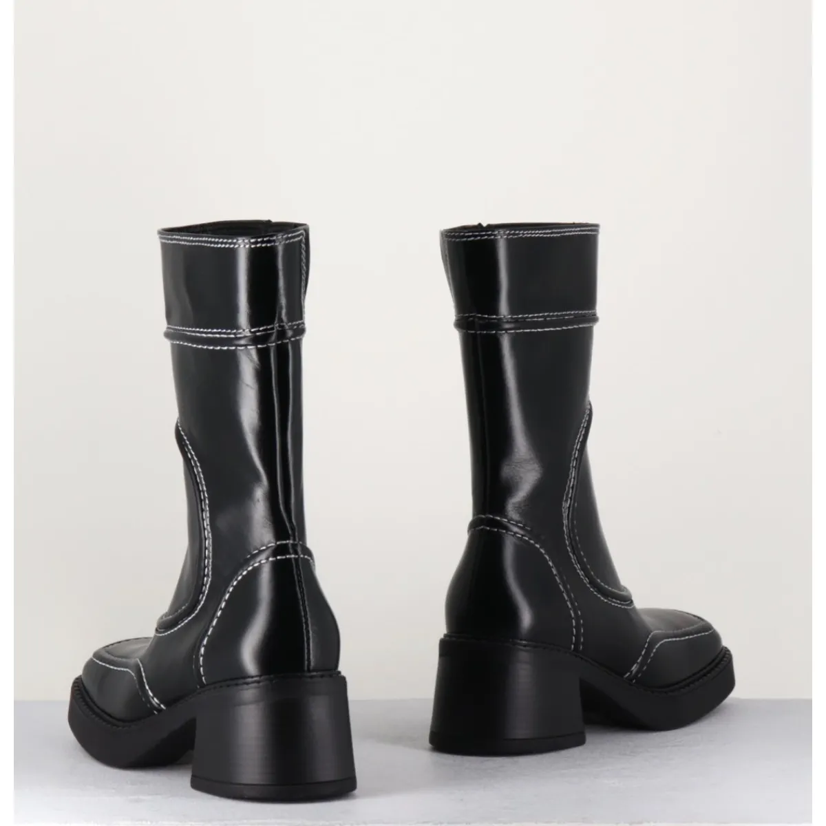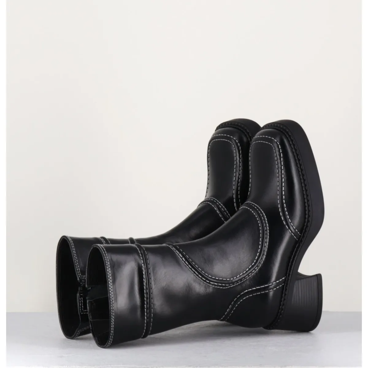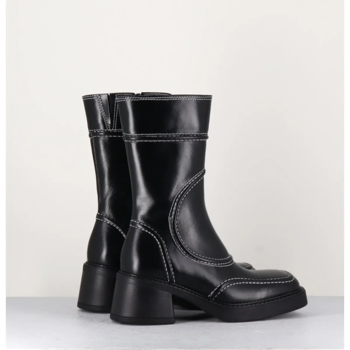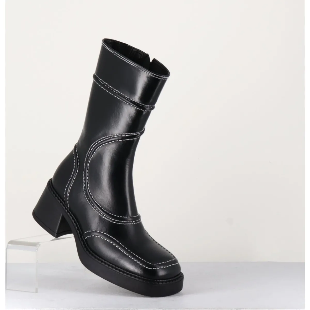 Boots en cuir noir, découpes & surpiqûres contrastantes blanches esprit années 90, bout carré arrondi, montés sur un petit talon bloc et une fine plateforme en gomme