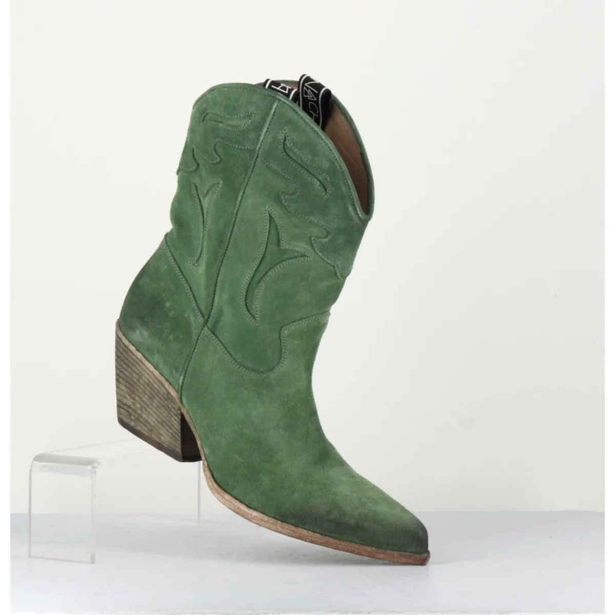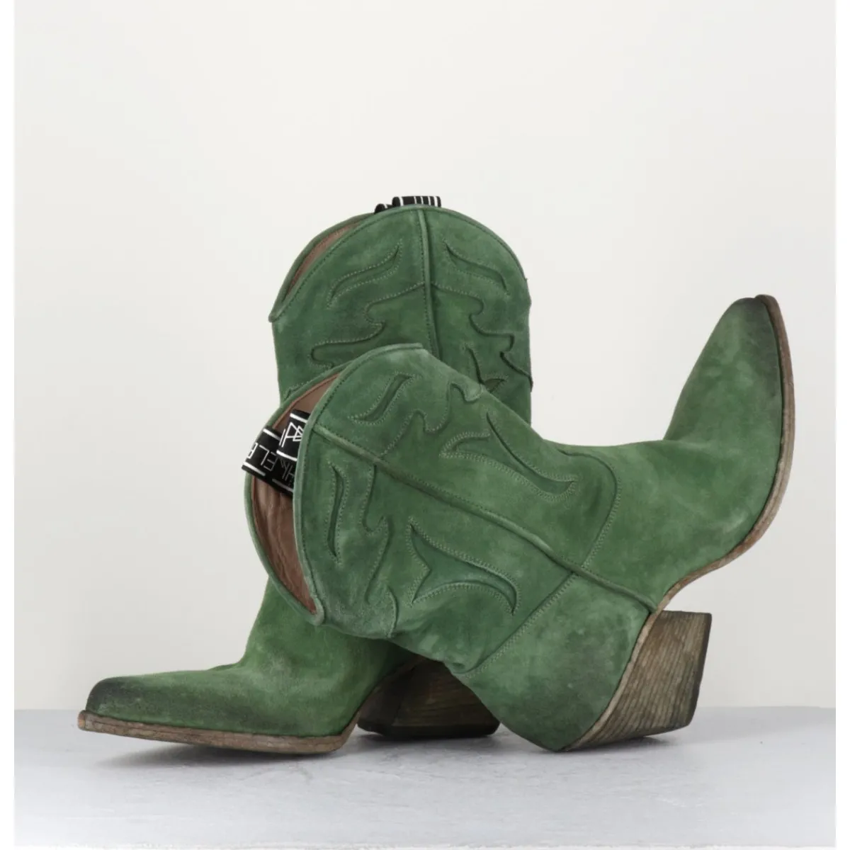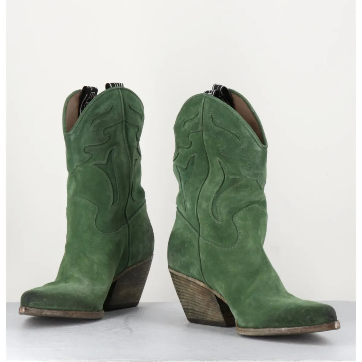 Boots santiags en daim vert souple, découpes motifs traditionnels, bout effilé légèrement brossé au noir pour un effet vieilli, montées sur un talon biseauté confortable