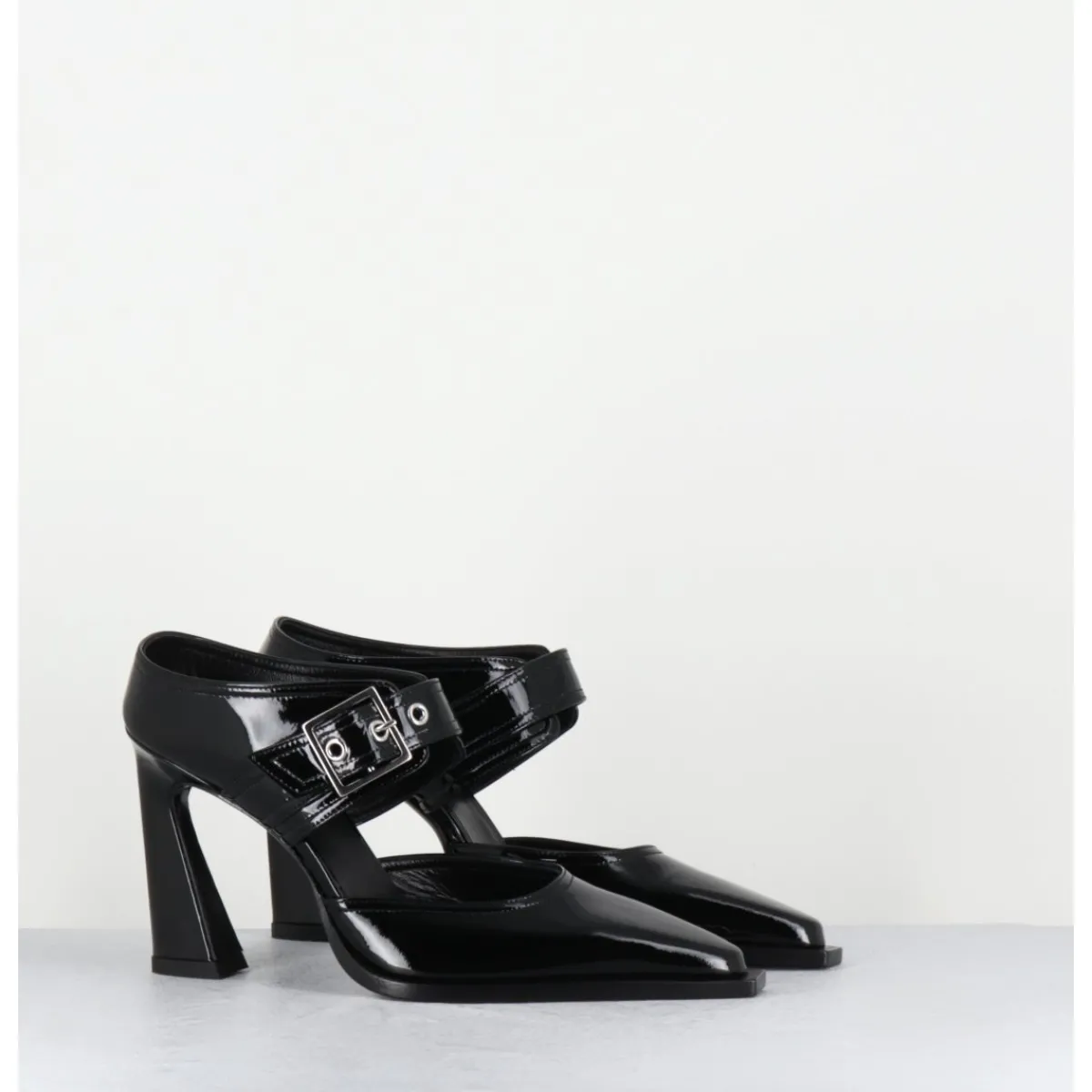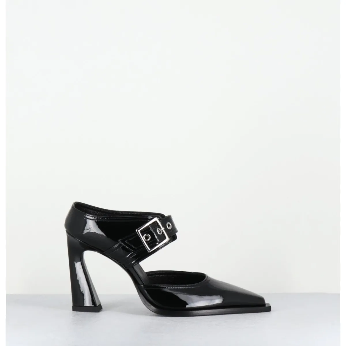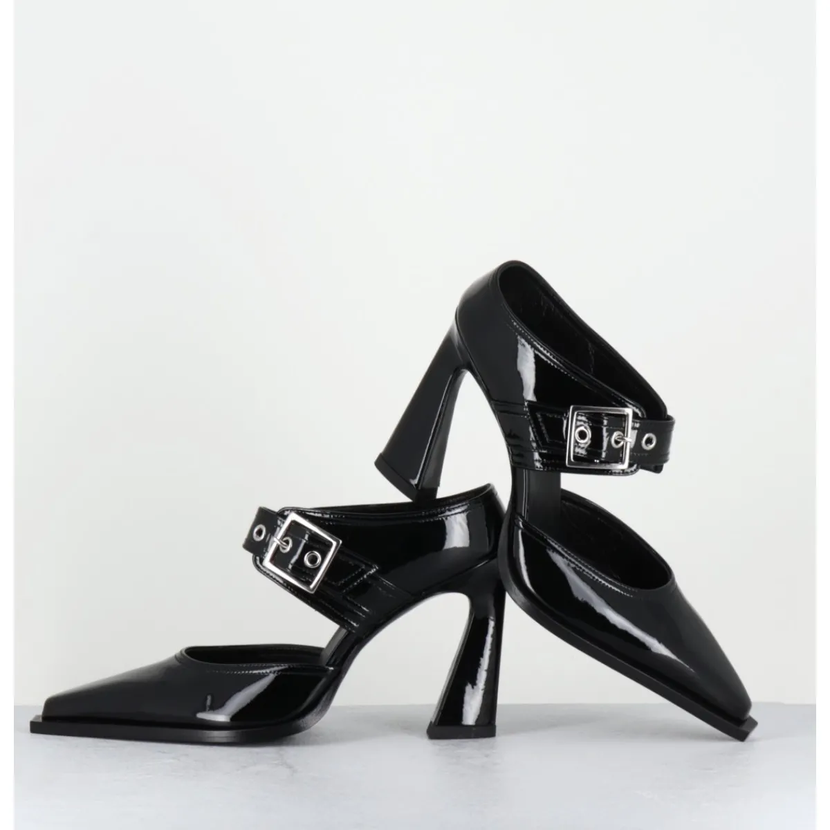 Mules pointu en cuir vernis noir, ligne effilée à bout rapporté, bride à boucle réglable, montées sur un haut talon stylisé