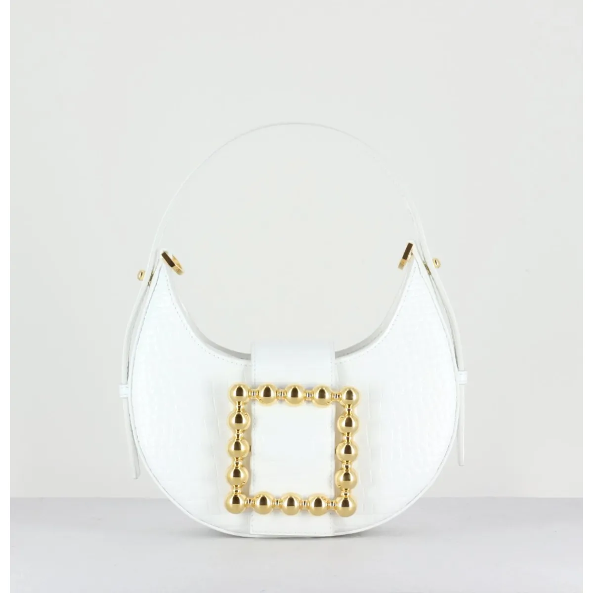 Classique de la maison, le sac Cindy s’inspire des années 90 et se décline cette fois dans une version en cuir imprimé croco blanc et boucle bijou dorée.