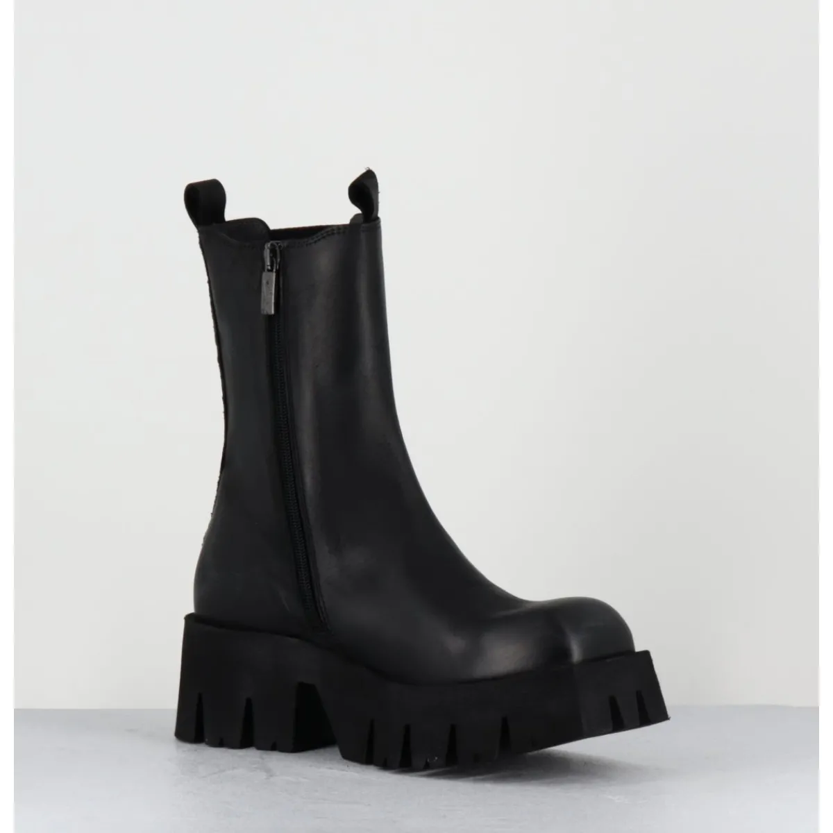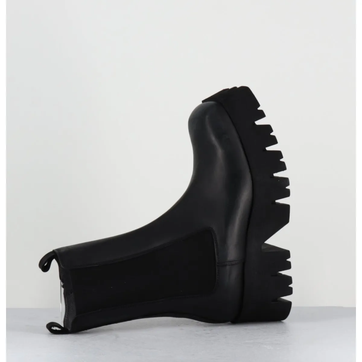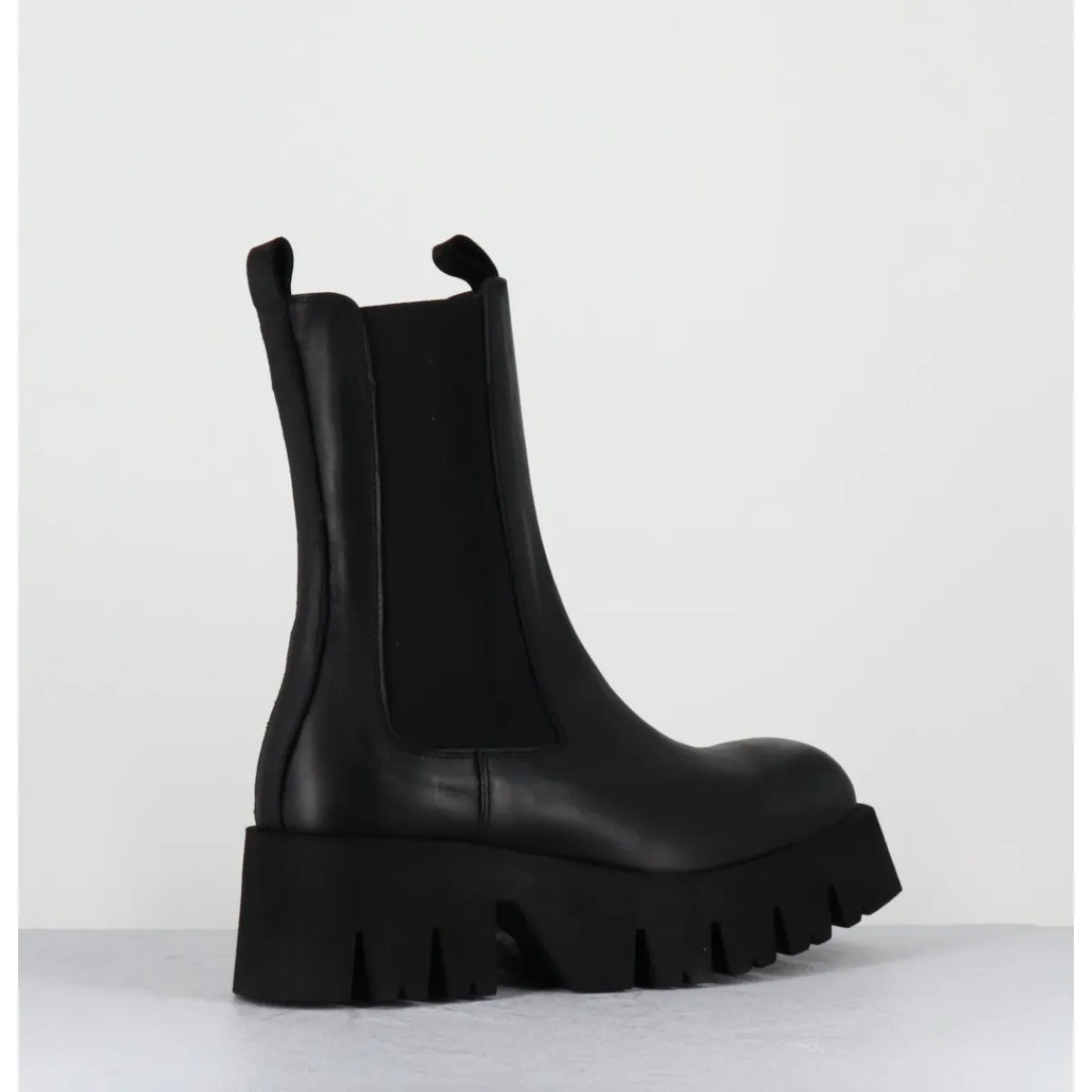 Boots en cuir noir, large élastique unilatéral, zip intérieur, forme carré large structuré, montées sur une semelle épaisse en micro-fibre ultra légère crantée pour plus de flexibilité, d’un grand confort