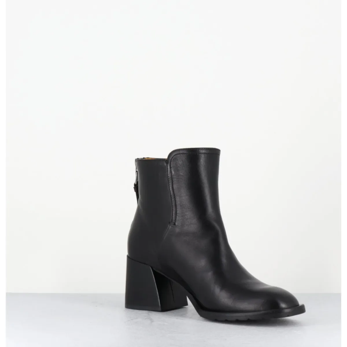 Boots en agneau extrêmement souple noir, tige courte, bout carré arrondi, zip arrière, coutures ton sur ton au look rétro, montées sur un talon bloc confortable esprit années 70