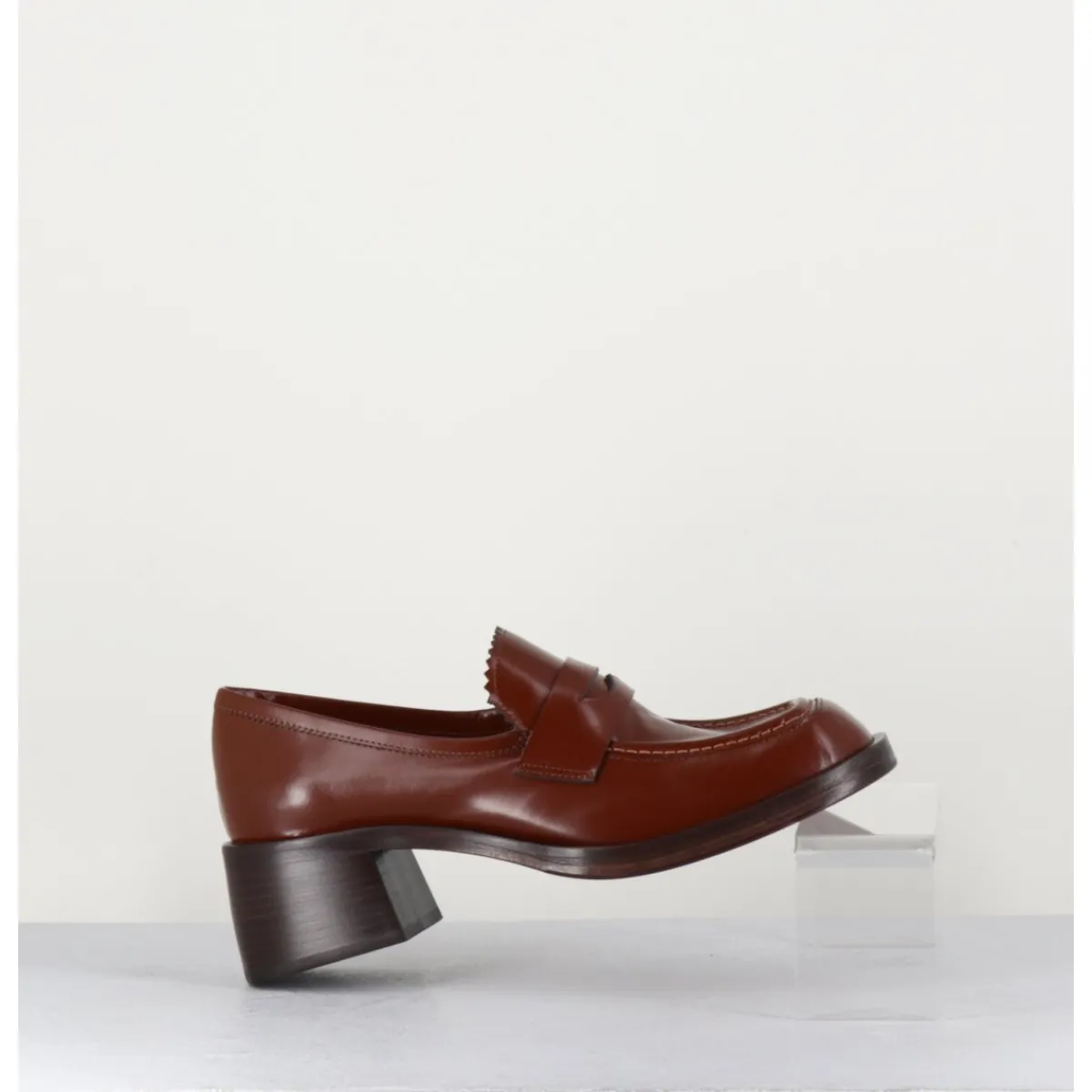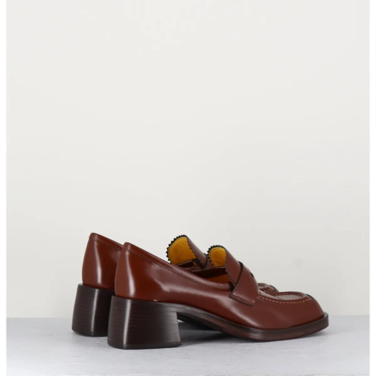 Mocassins en cuir marron, bout carré arrondi avec brogue, languette finitions dentelées, monté sur une semelle et un talon bloc en cuir.