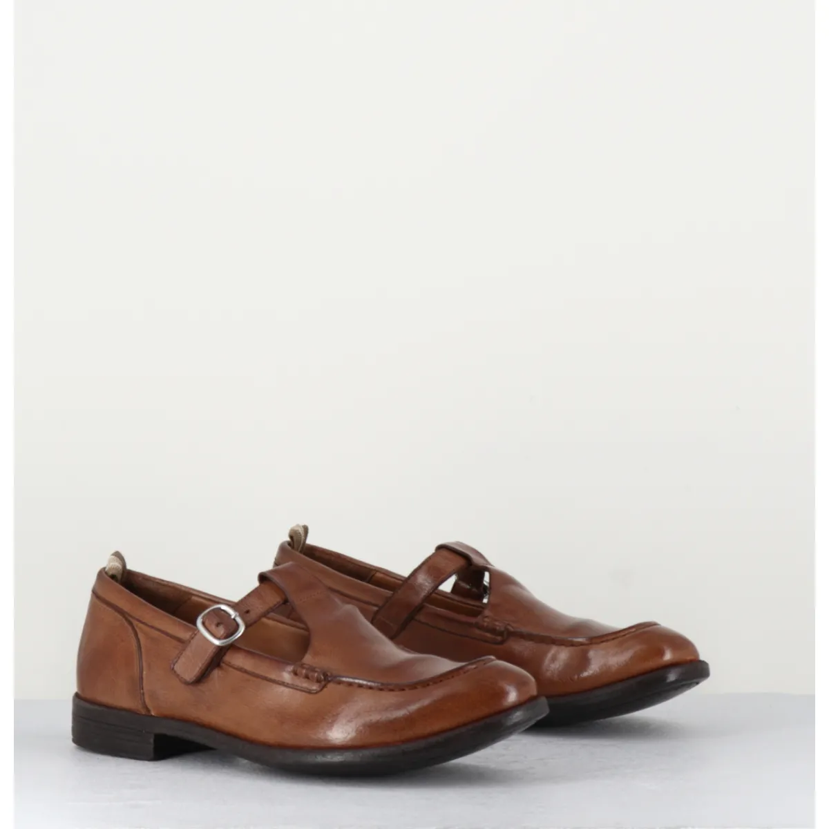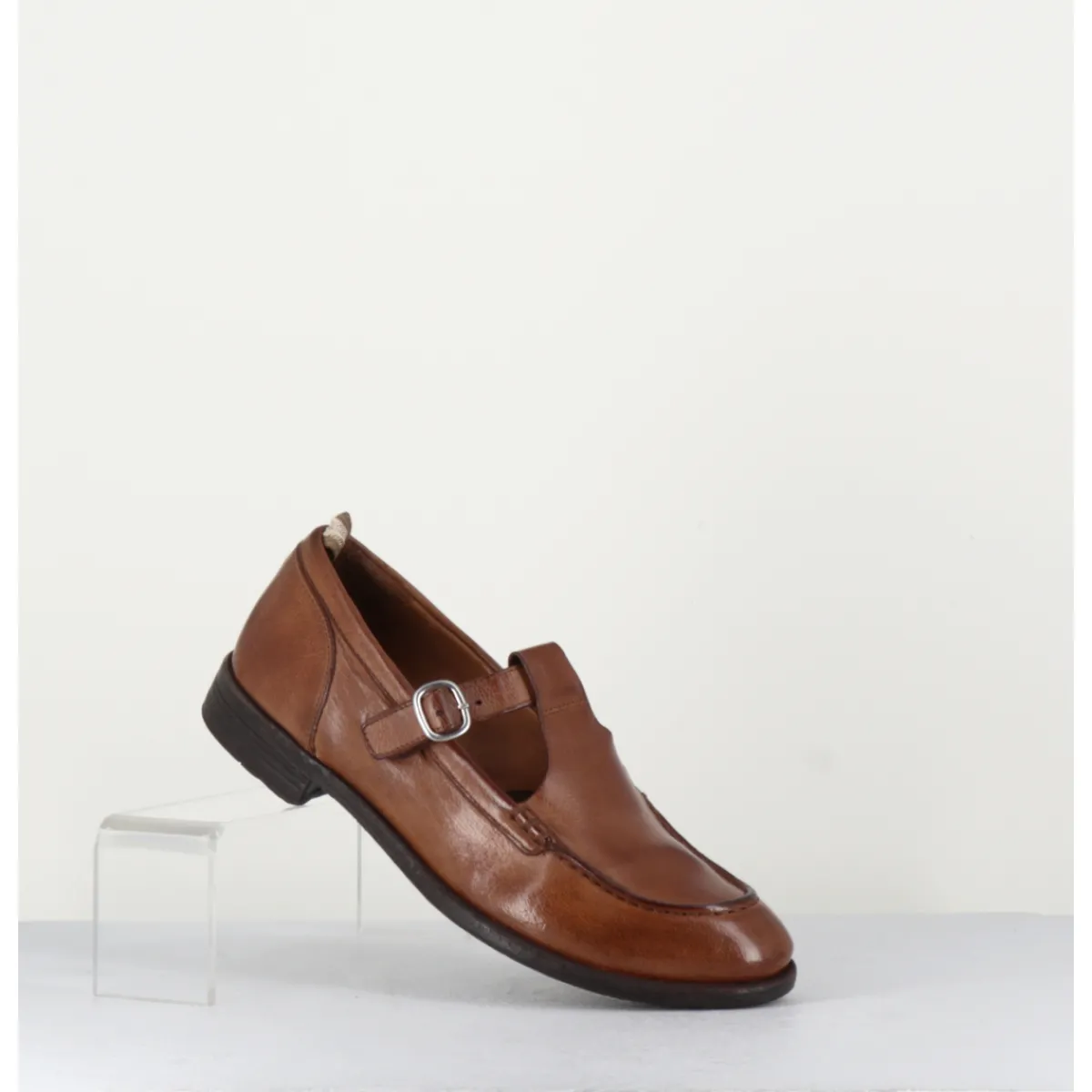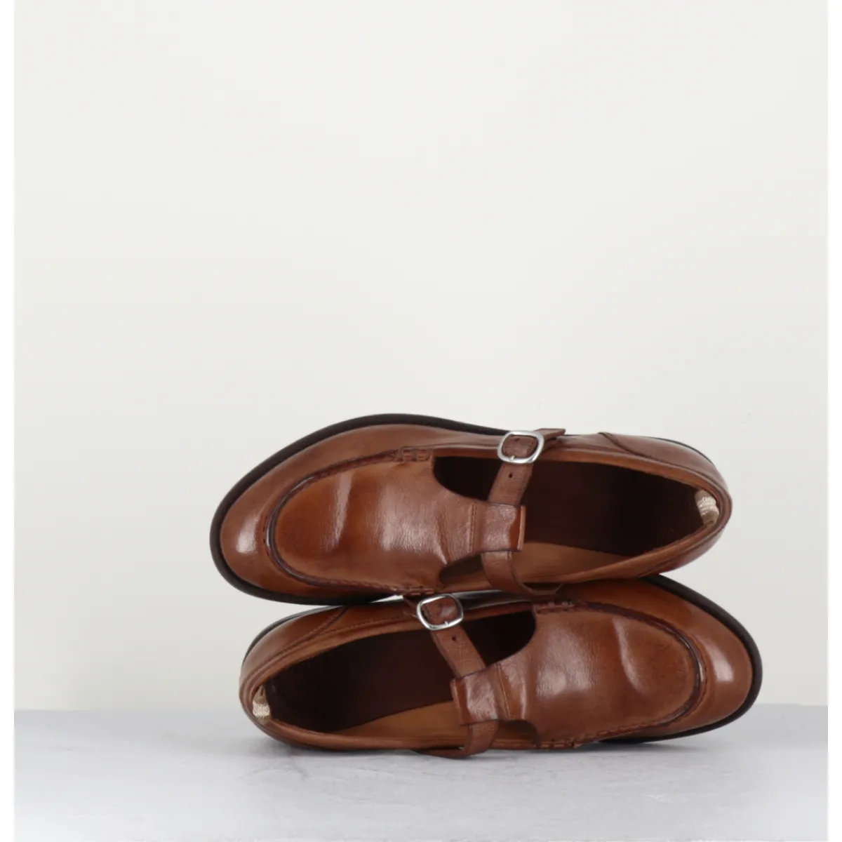 Brown leather Mary-Jane shoes with adjustable silver buckle, almond toe, mounted on a flexible hand-sewn sole with gum insert.