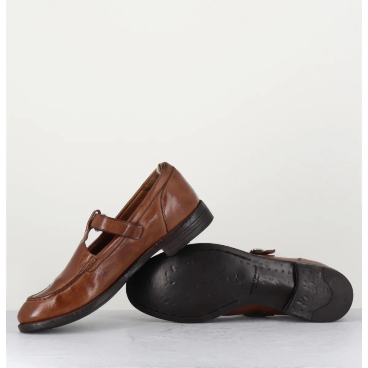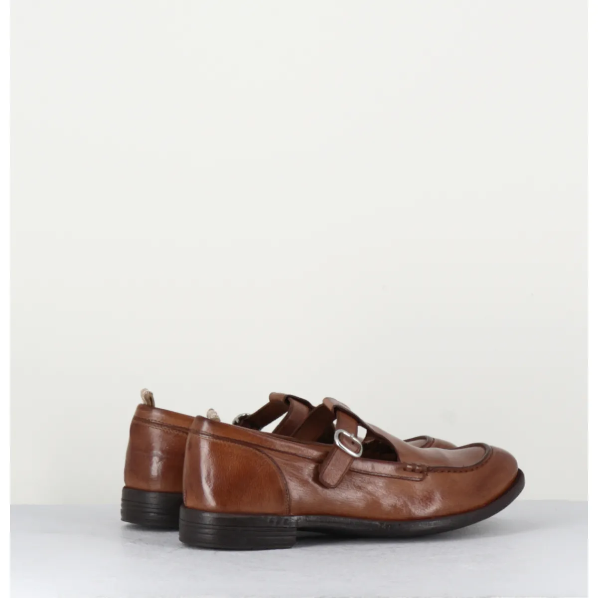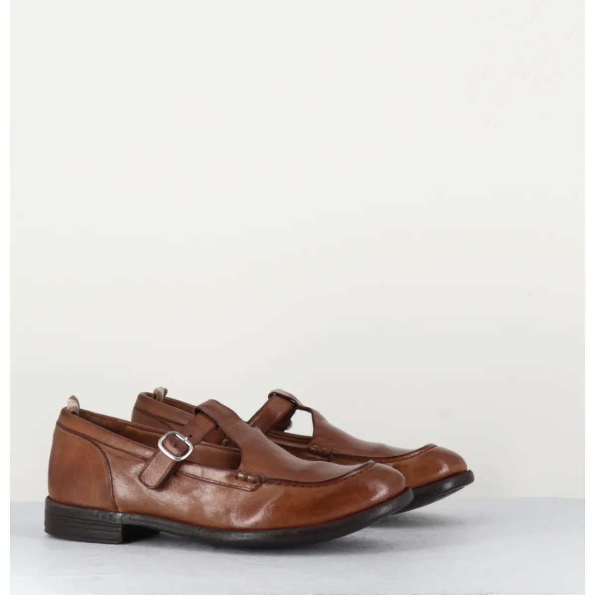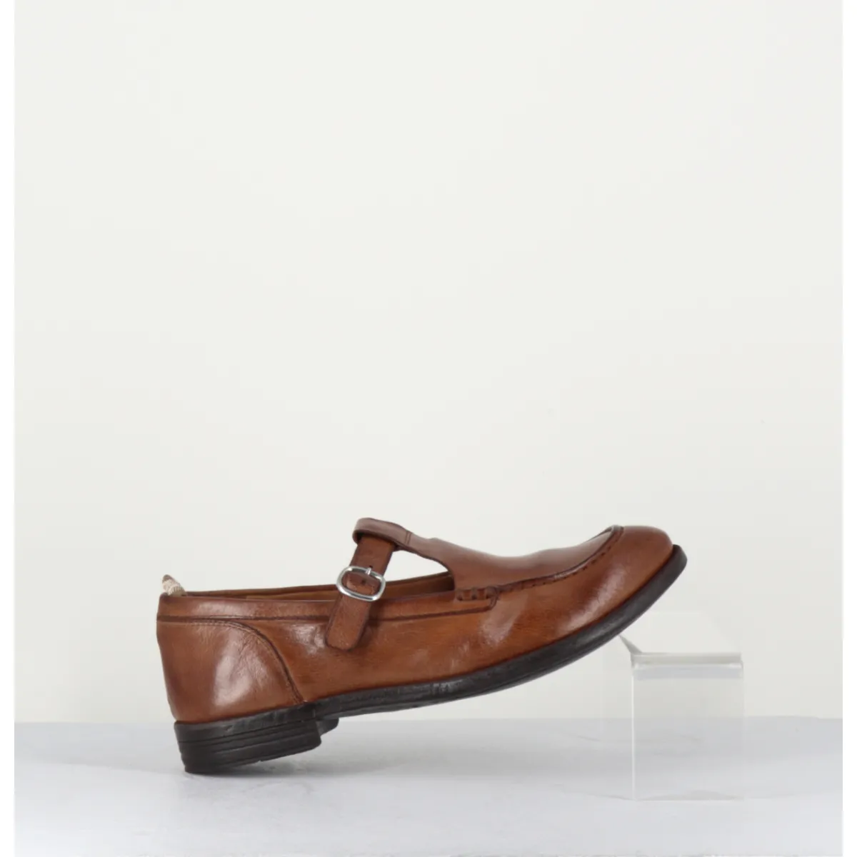 Brown leather Mary-Jane shoes with adjustable silver buckle, almond toe, mounted on a flexible hand-sewn sole with gum insert.