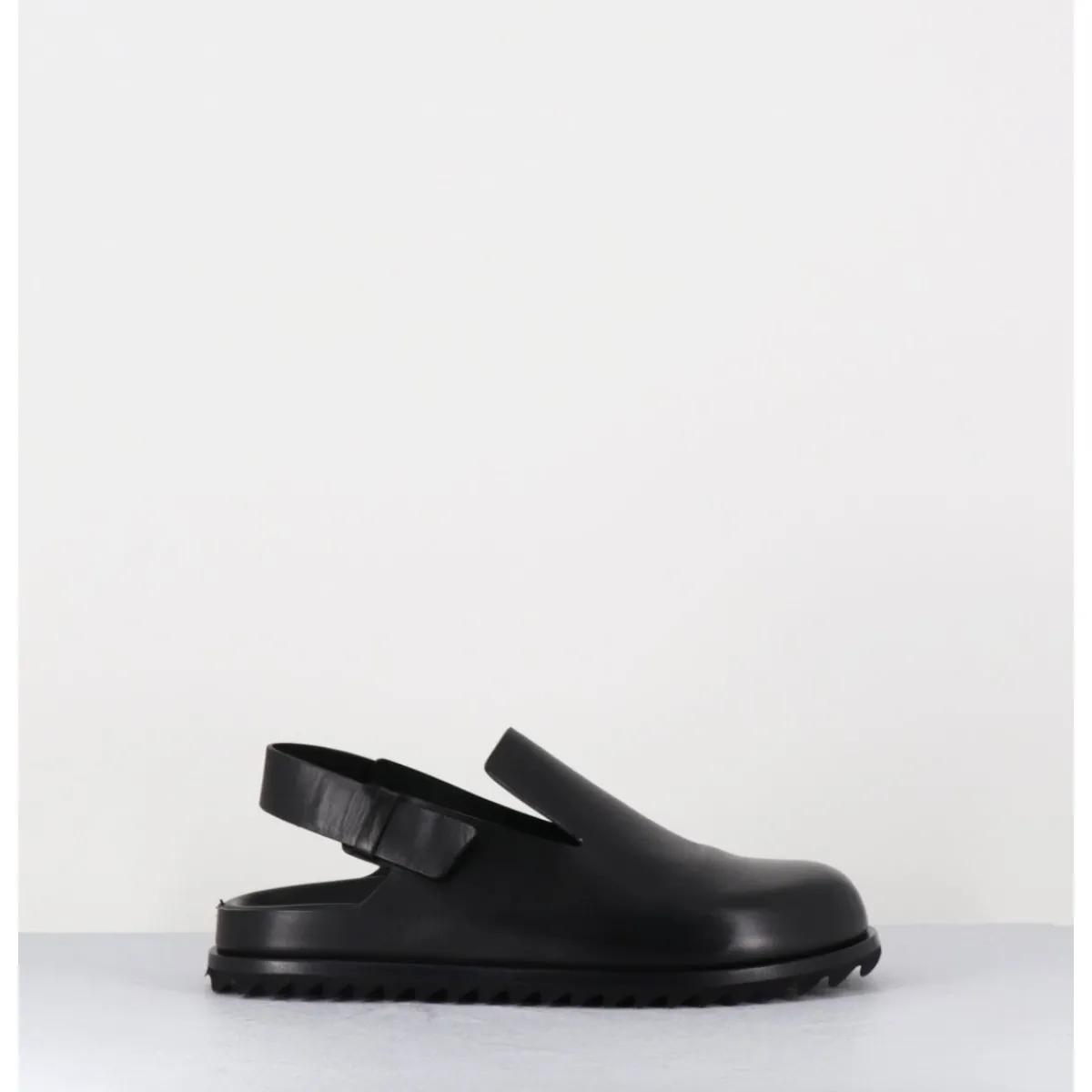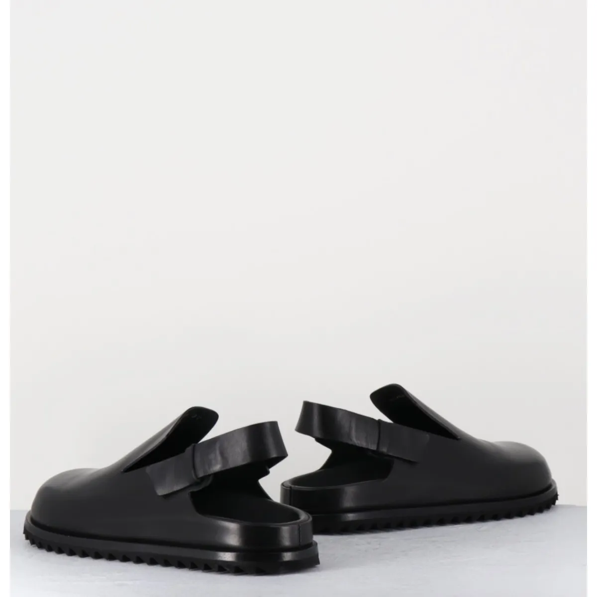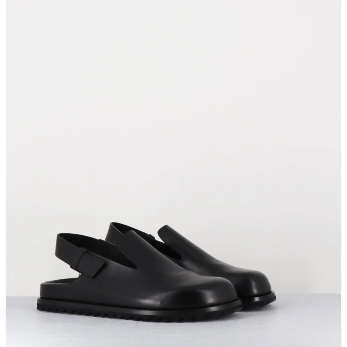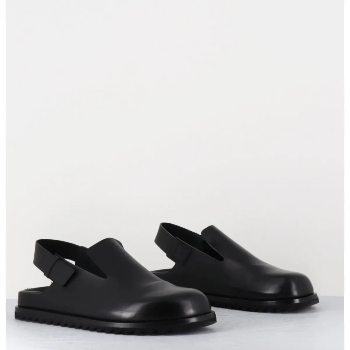 Sabots en cuir lisse noir qualité premium, ligne épurée réalisée sans couture, semelle intérieure anatomique mémoire de forme extrêmement légère et confortable, bout arrondi, bride arrière ajustable, semelle extérieure en gomme légère crantée.