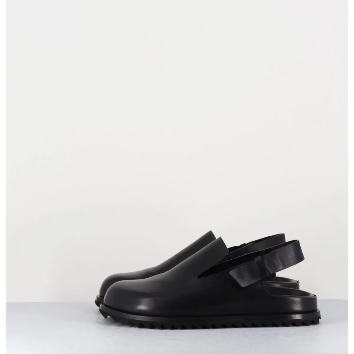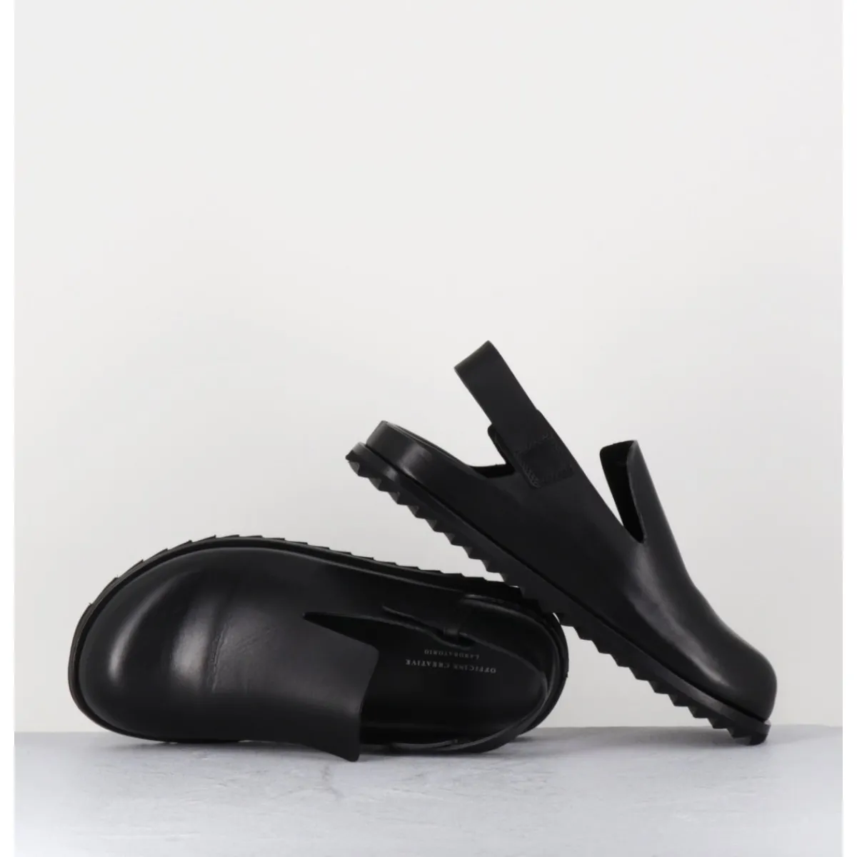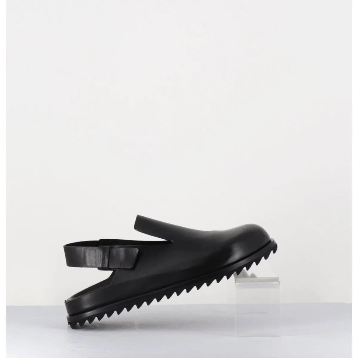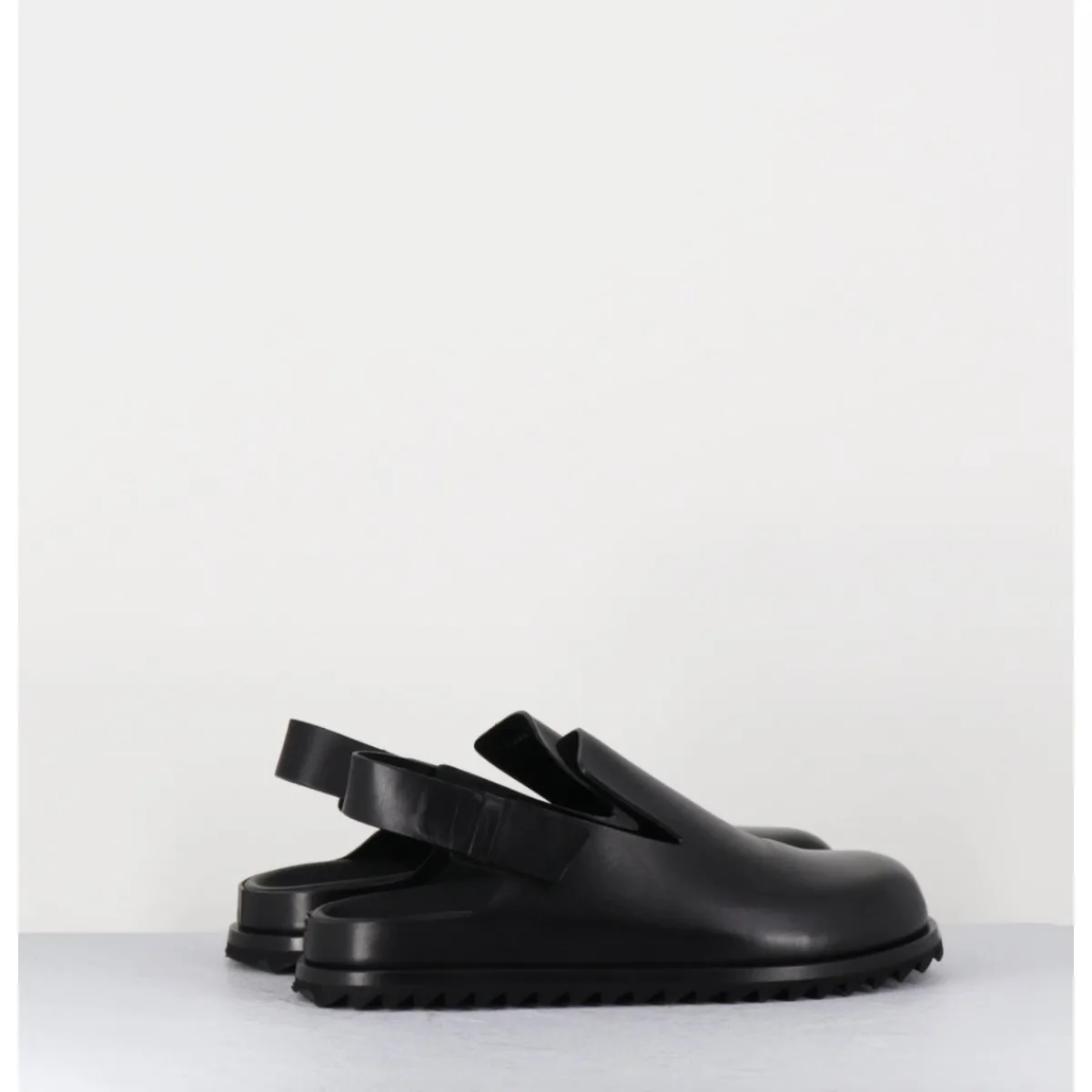 Sabots en cuir lisse noir qualité premium, ligne épurée réalisée sans couture, semelle intérieure anatomique mémoire de forme extrêmement légère et confortable, bout arrondi, bride arrière ajustable, semelle extérieure en gomme légère crantée.