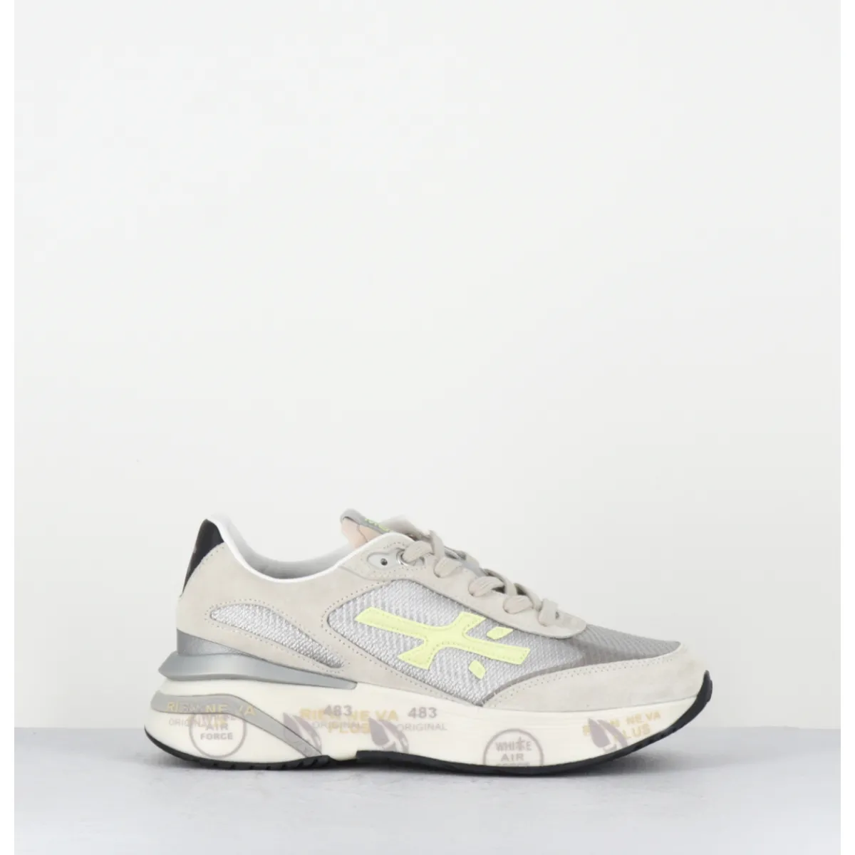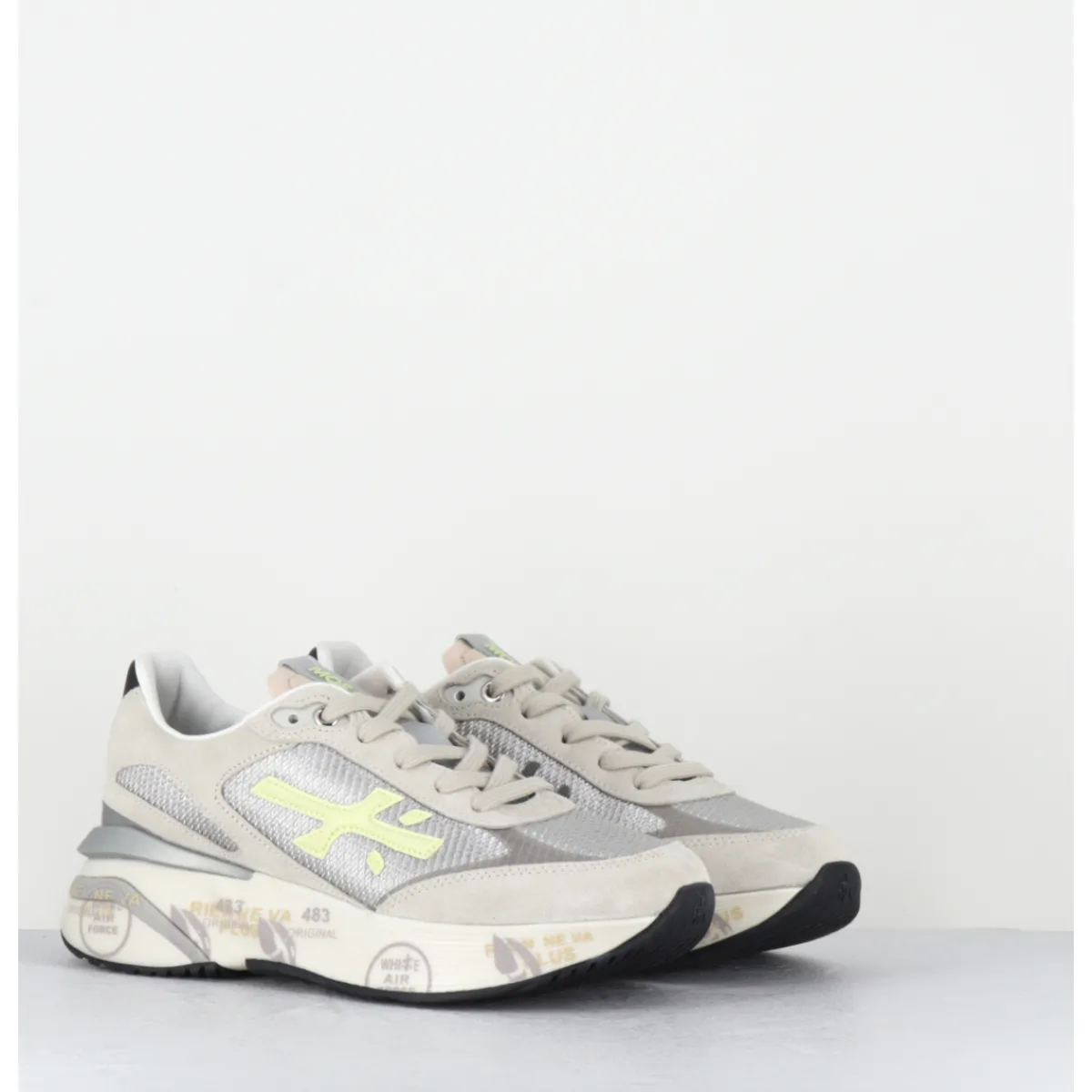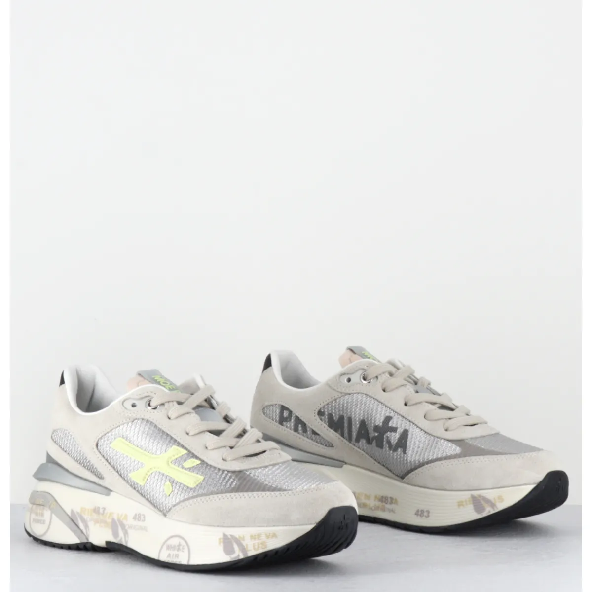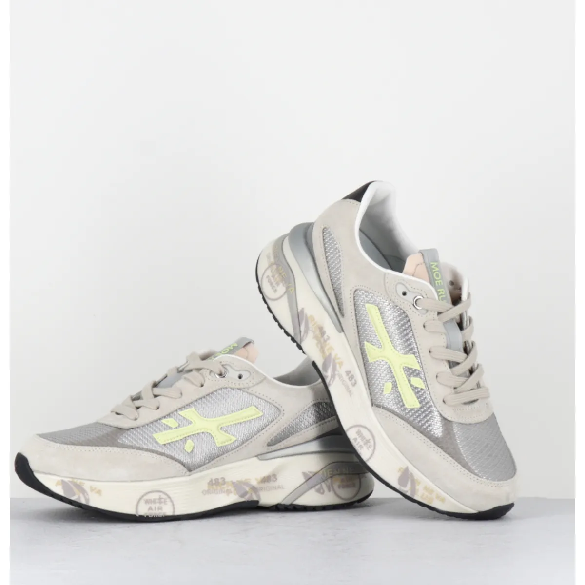 Sneakers esprit années 90, semelle ultra light innovante chez Premiata, daim gris et empiècement de toile métallisé avec détails cuir vert clair, montées sur une semelle épaisse blanche en micro fibre, avec imprimé signature de la Maison Italienne Premiata.