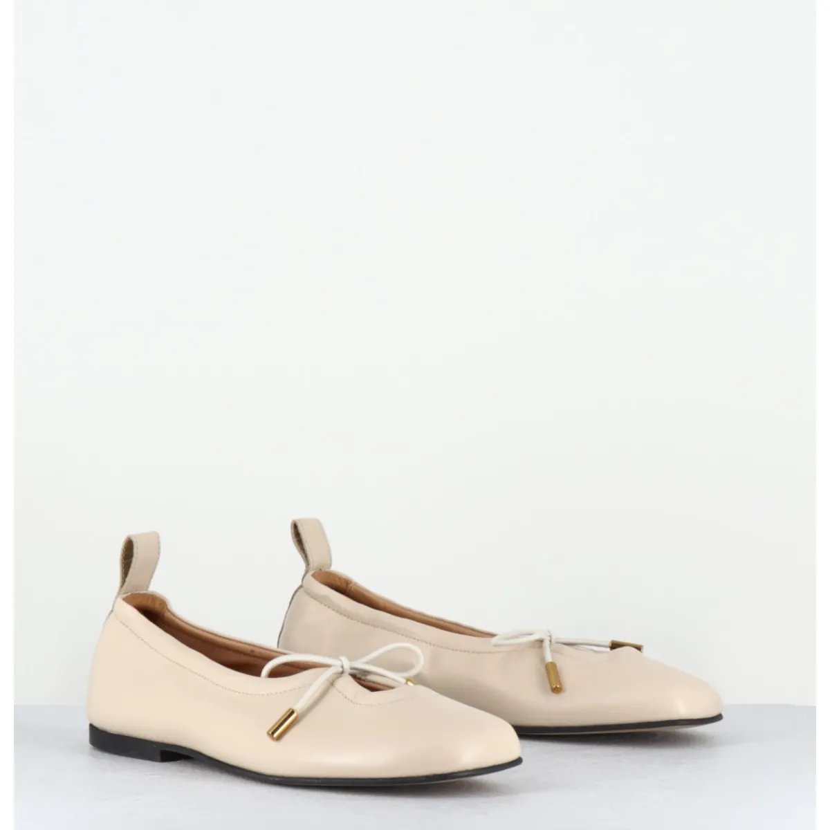 Ballerines plates en cuir beige crème, petit noeud élastique avec finitions dorées réglable à l’avant, bout carré arrondi