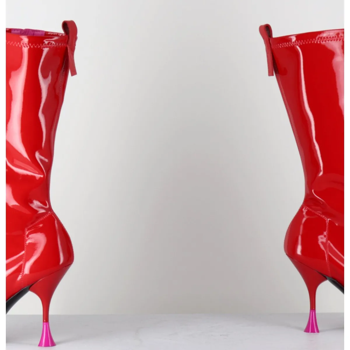 Boots en stretch vernis rouge galbantes, bout effilé à pointe carrée esprit 90s, zip intérieur, montées sur un talon haut fin stylisé avec détail rose fuchsia