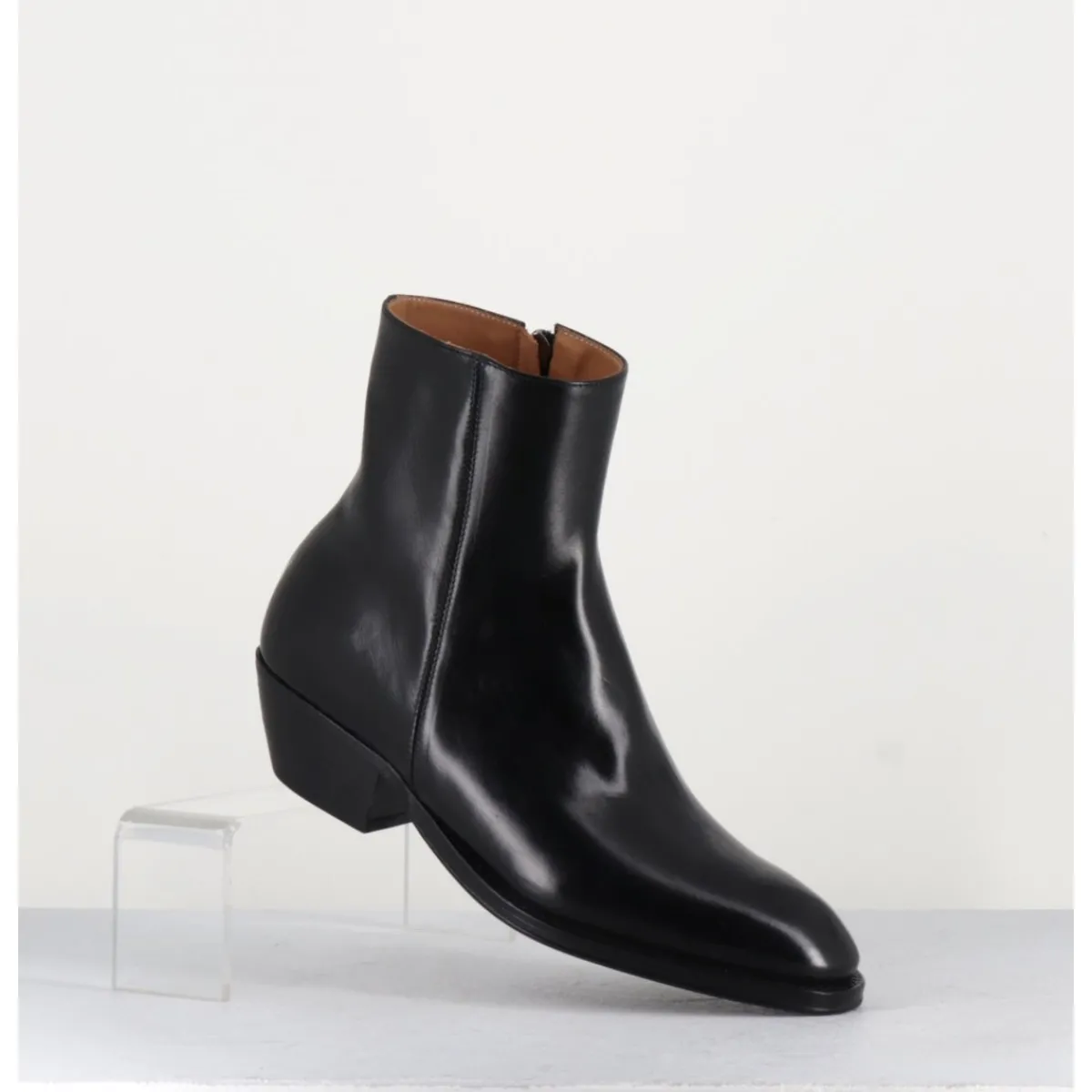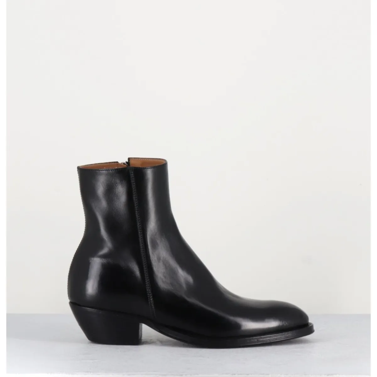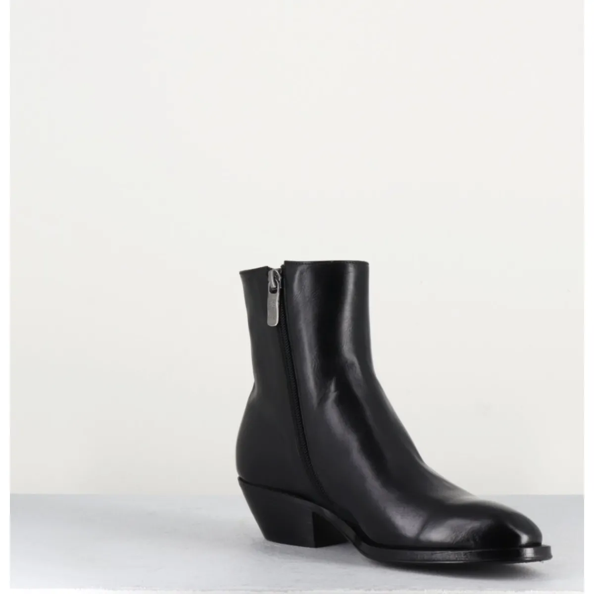 Bottines esprit santiags en cuir noir extrêmement souple, zip intérieur, bout effilé sobre, montées sur une semelle en cuir et gomme cousue main & un talon biseauté.