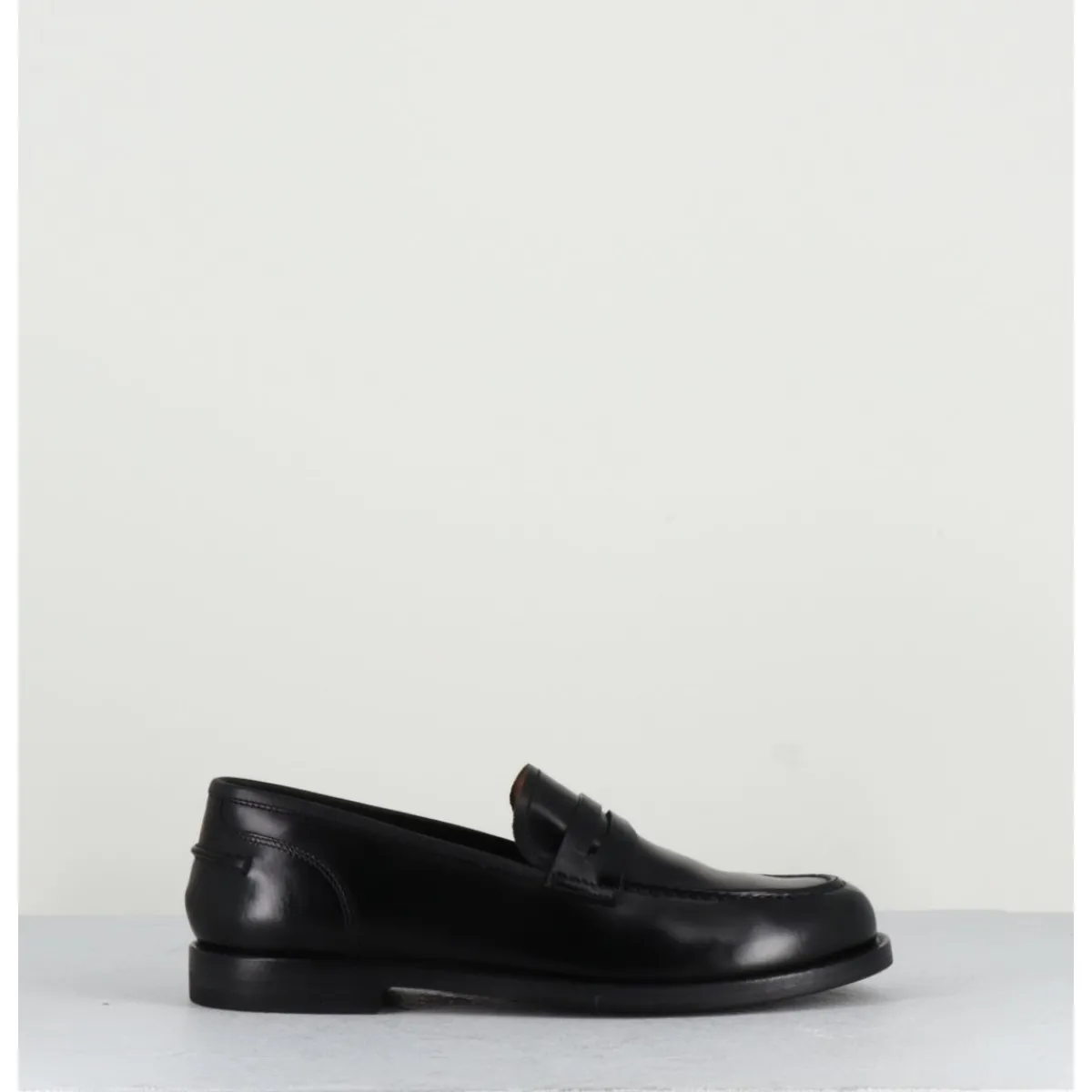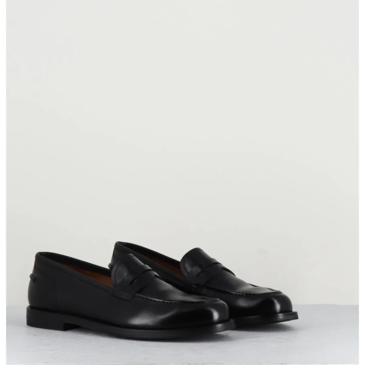 Mocassins en cuir noir légèrement glacé, montés sur une semelle en cuir et gomme cousue main.
