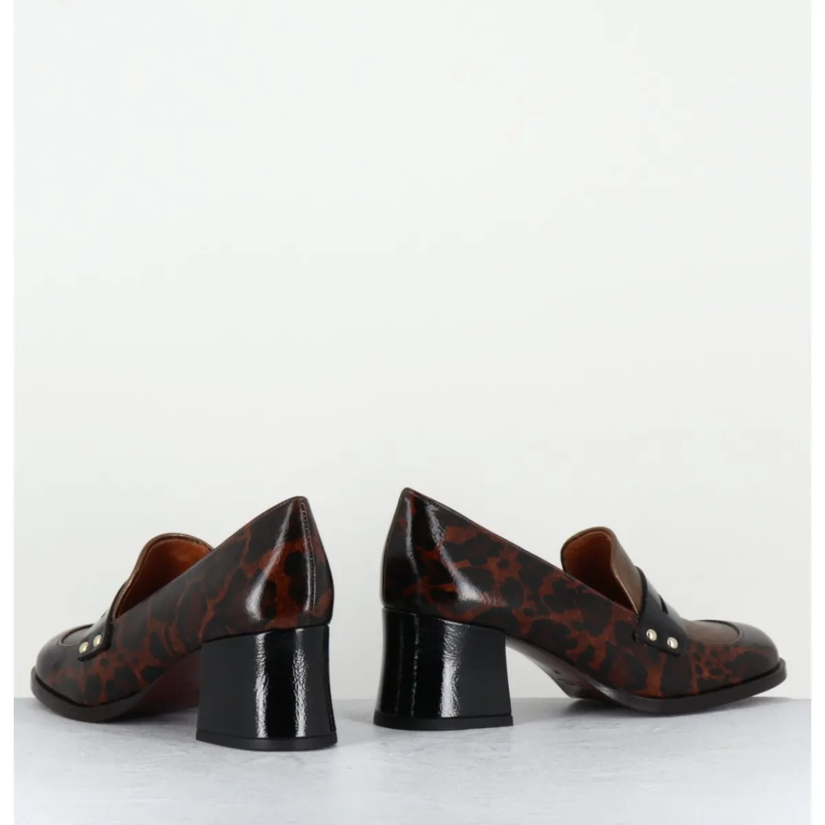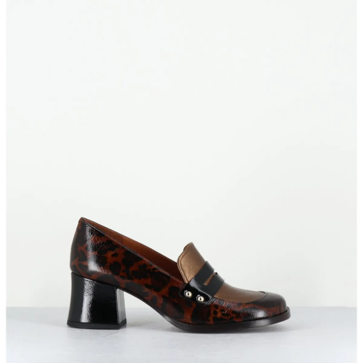 Chaussures mocassins en cuir imprimé leopard avec l’avant empeigne métallisée bronze, bout carré arrondi, montées sur un petit talon rétro légèrement évasé recouvert de cuir noir