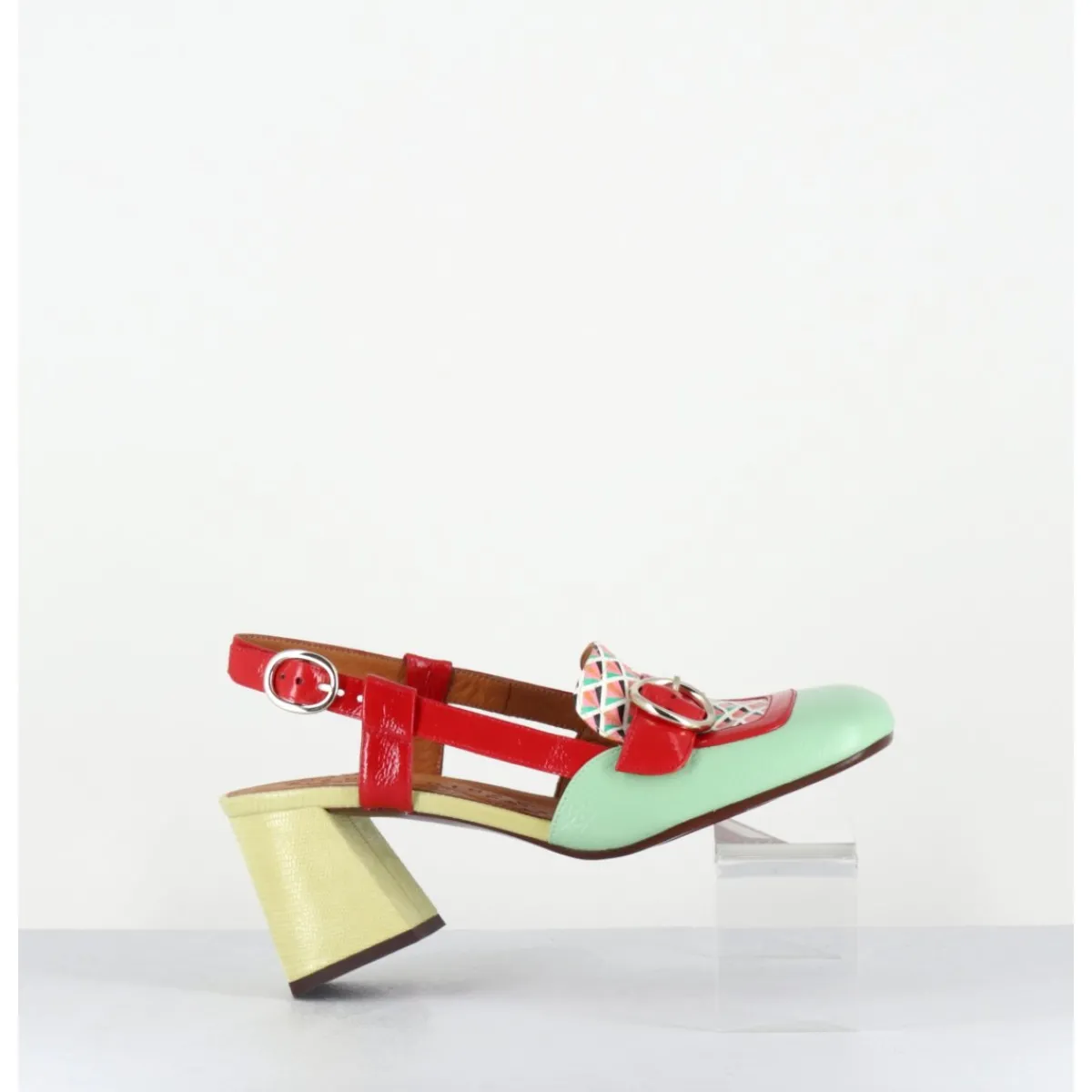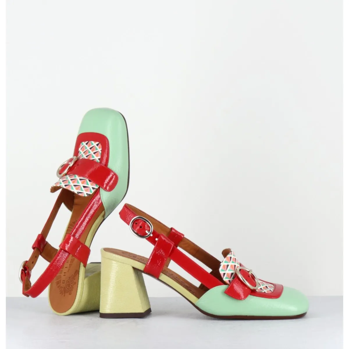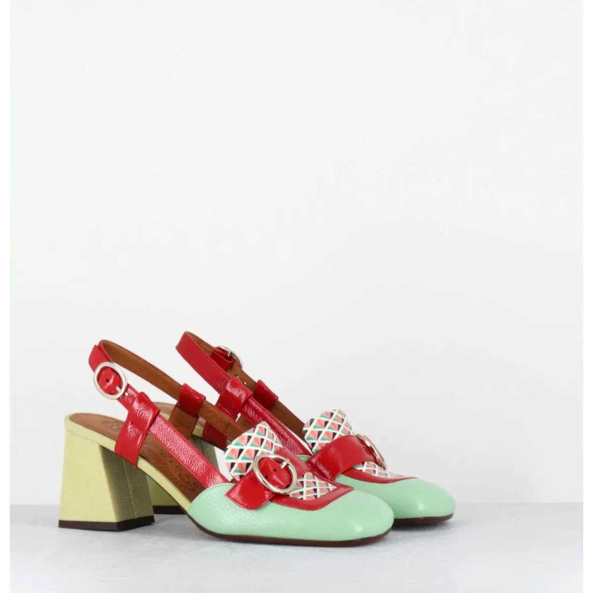 Mocassins slingback esprit 70s en cuir vernis vert, motifs rétro à l’avant & petite boucle géométrique, bride arrière réglable rouge, montés sur un talon légèrement évasé vernis jaune