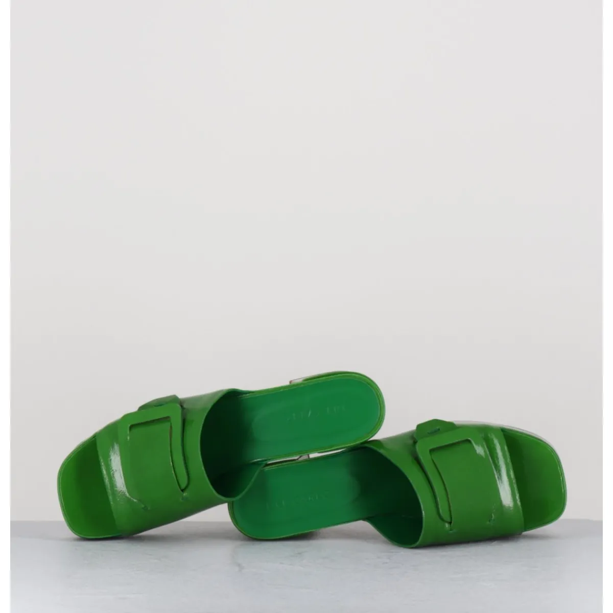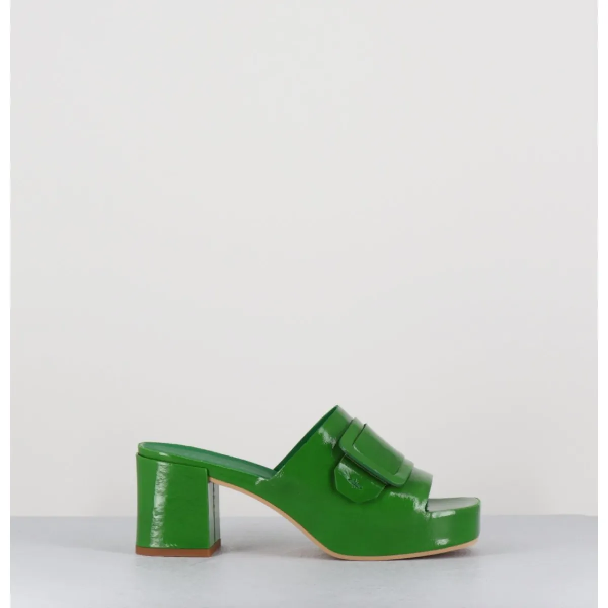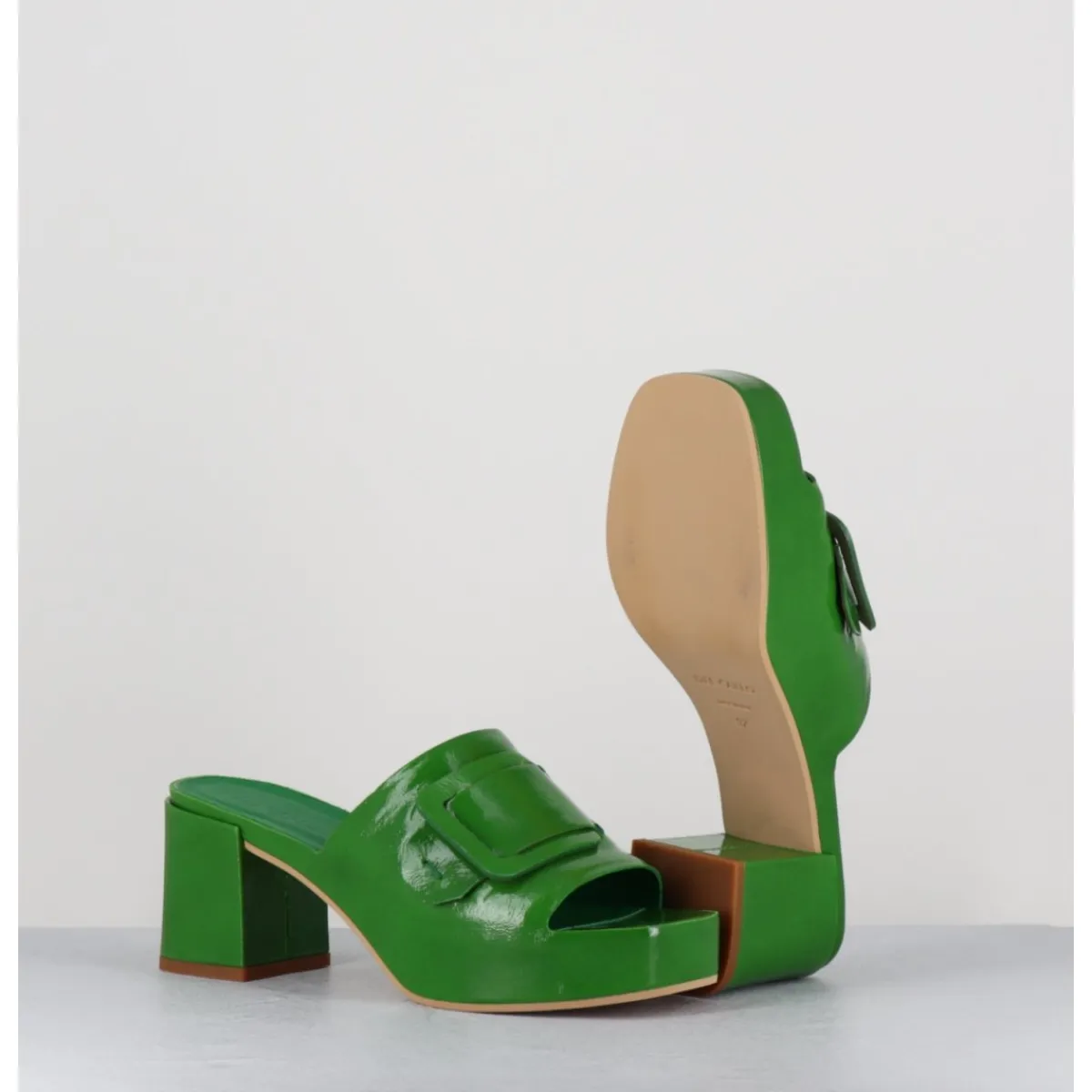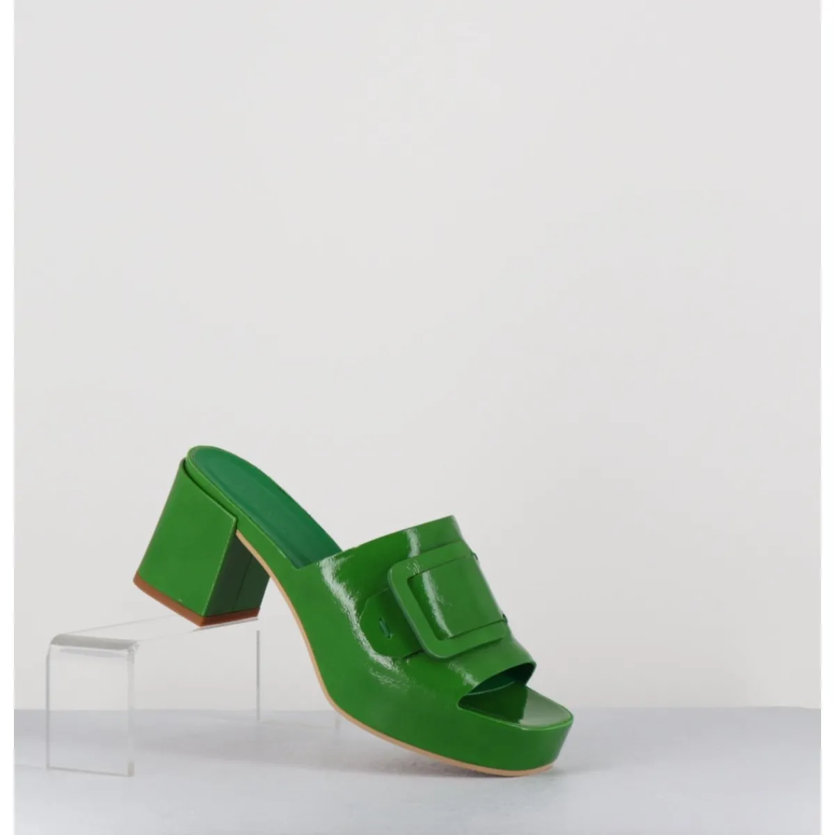 Mules sandales à plateforme en cuir vernis vert ornées d’un faux passant géométrique look 70s à l’avant et montées sur un petit talon bloc confortable