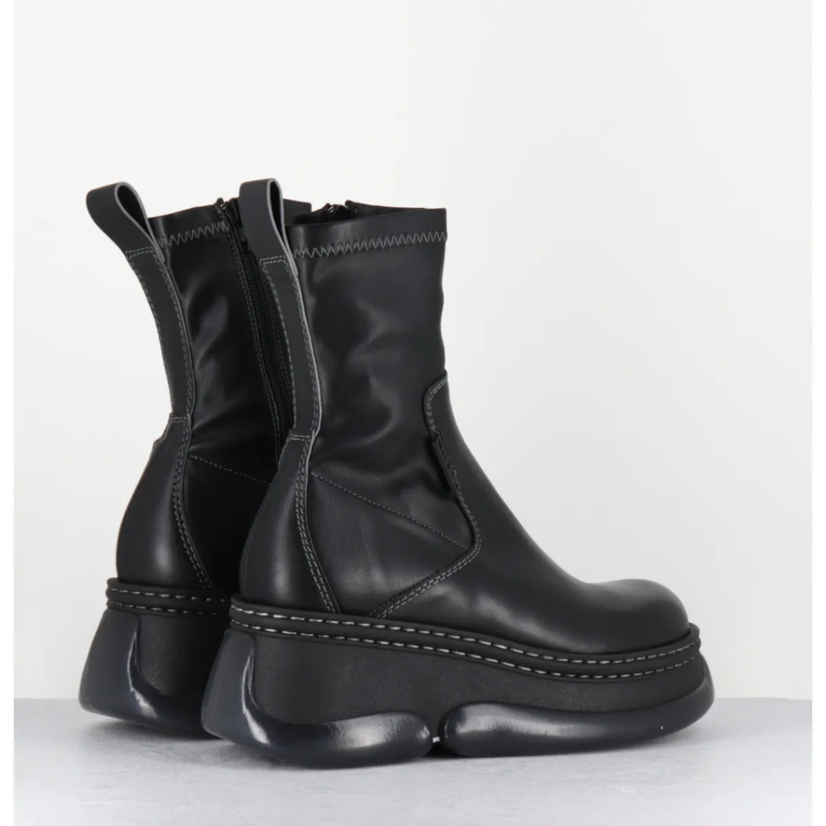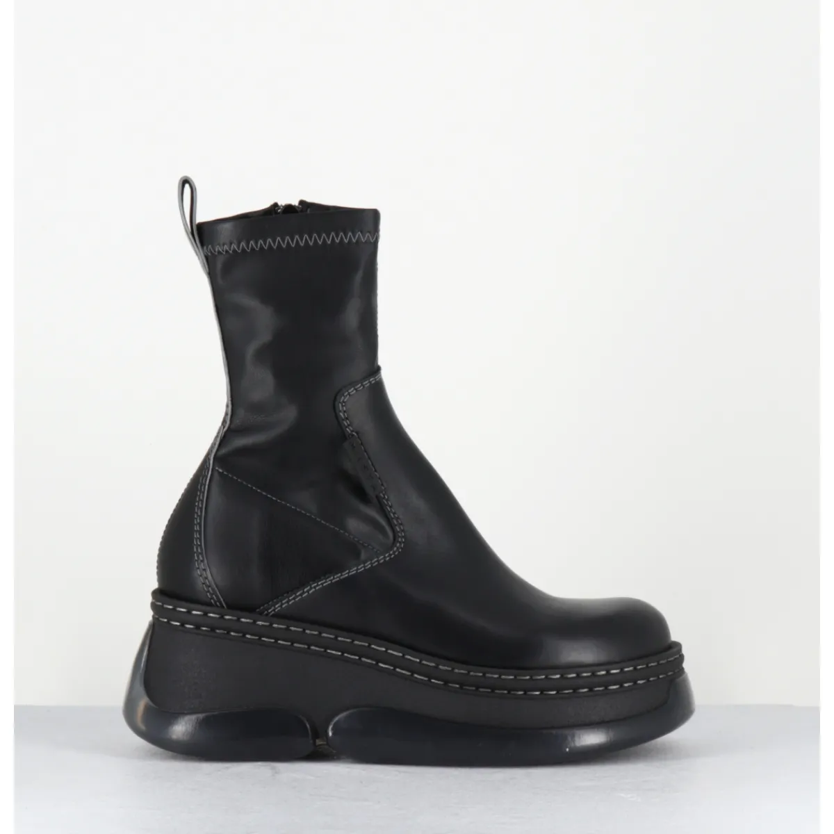 Kattrin est construite sur la base du sabot Brietta avec ce même esprit futuriste japonisant représenté par une semelle compensé en gomme noir complété par un effet bulle ton sur ton. Réalisé à partir de 3 empiècements de cuir noir avec surpiqûres contrastantes, se terminant par du stretch pour un effet galbant sur la jambe