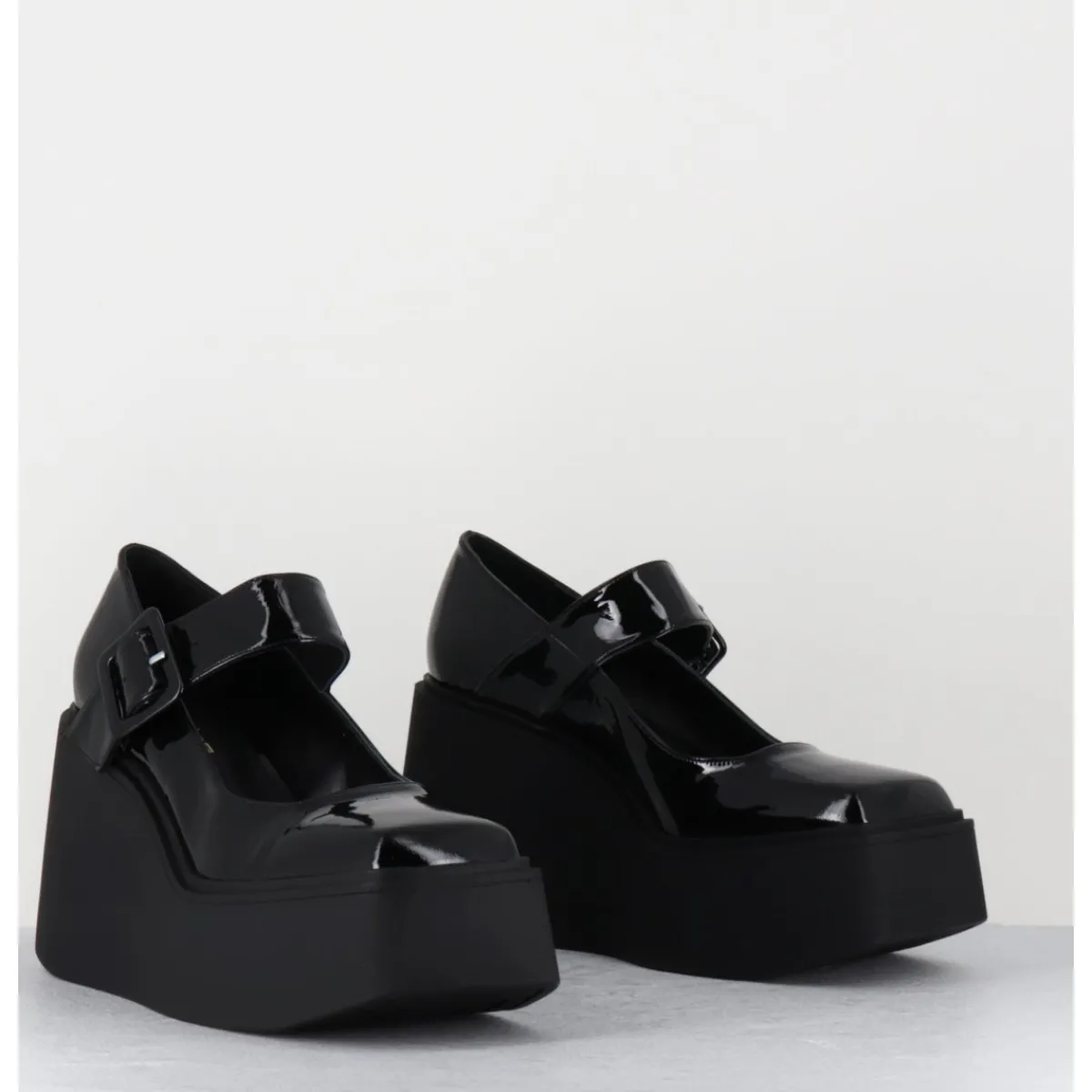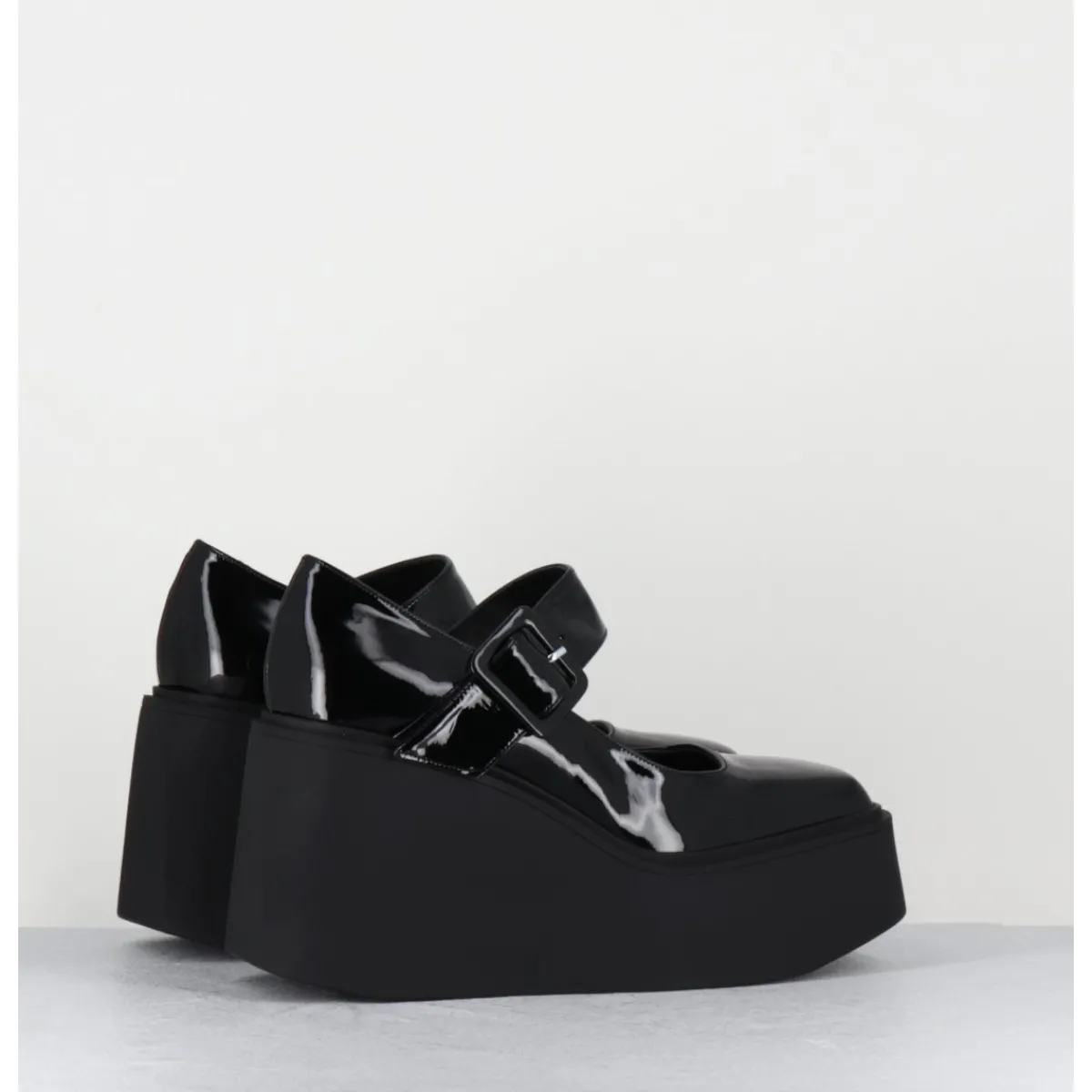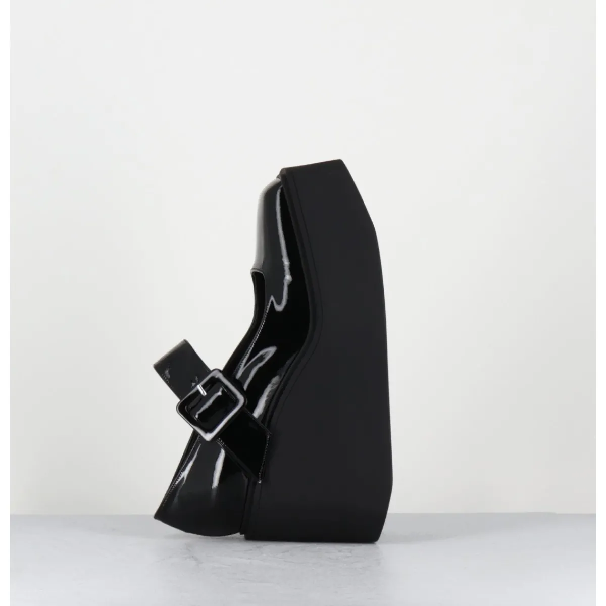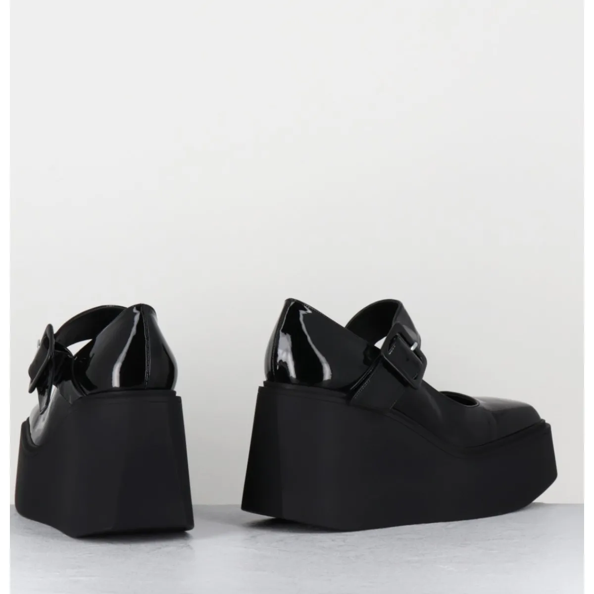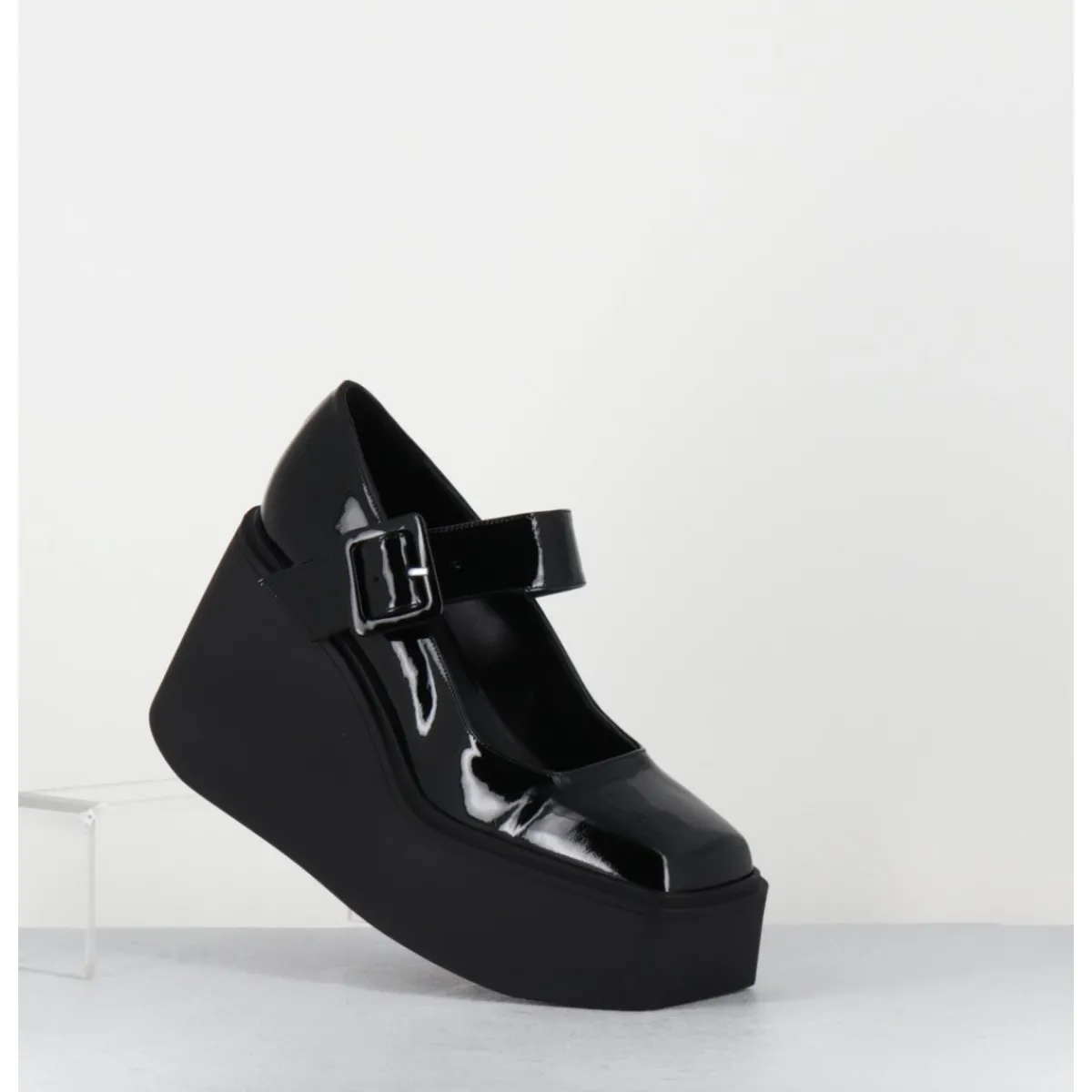 Babies compensées en cuir vernis noir, forme inspirée des Mary-Jane japonaises des années 90, montées sur une plateforme structurée en gomme noire