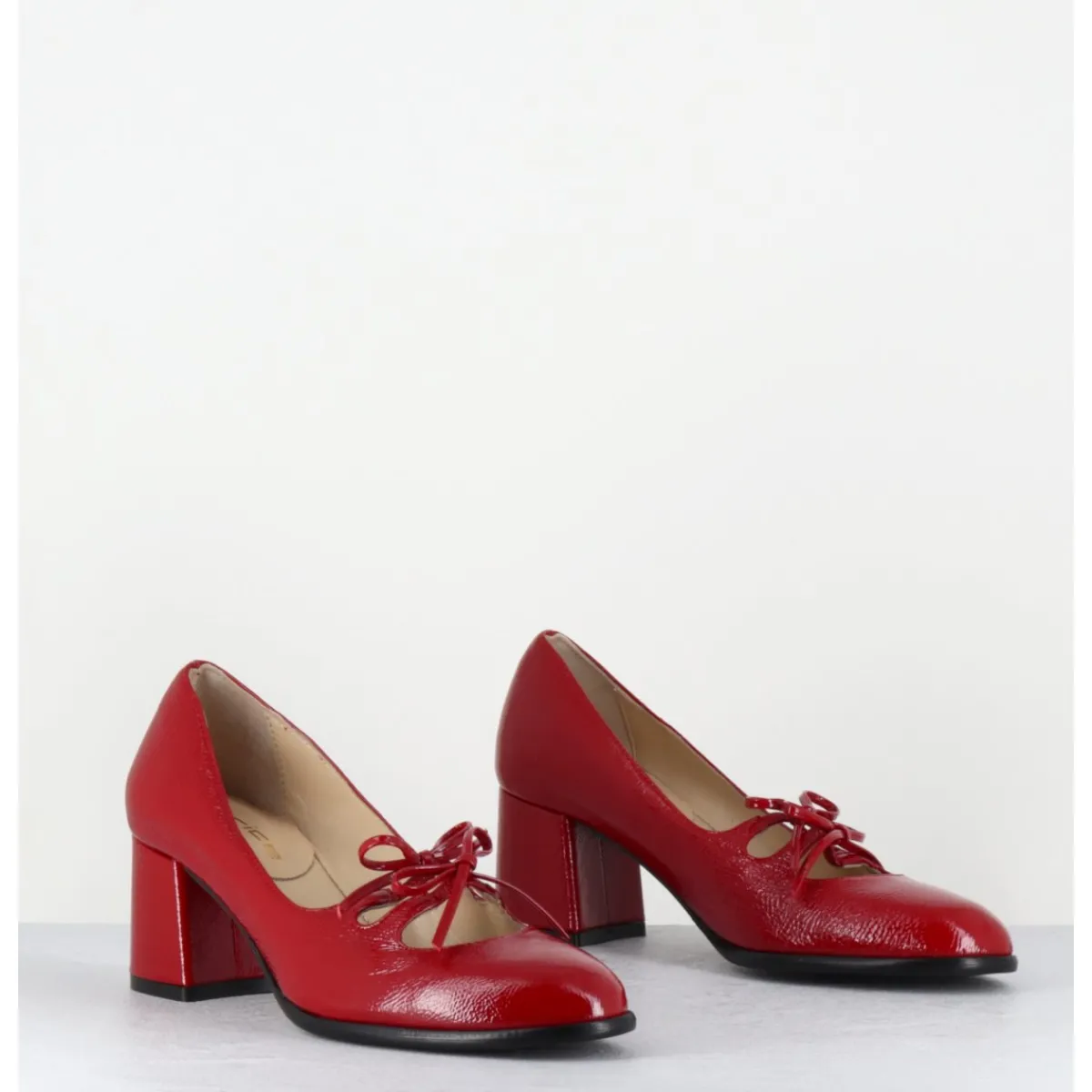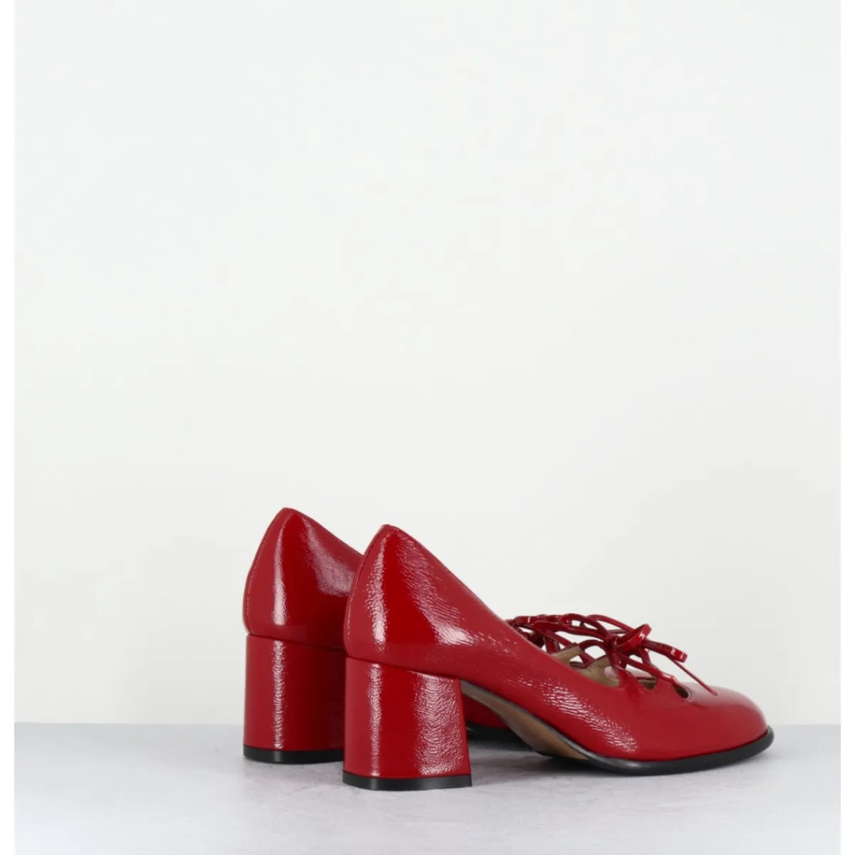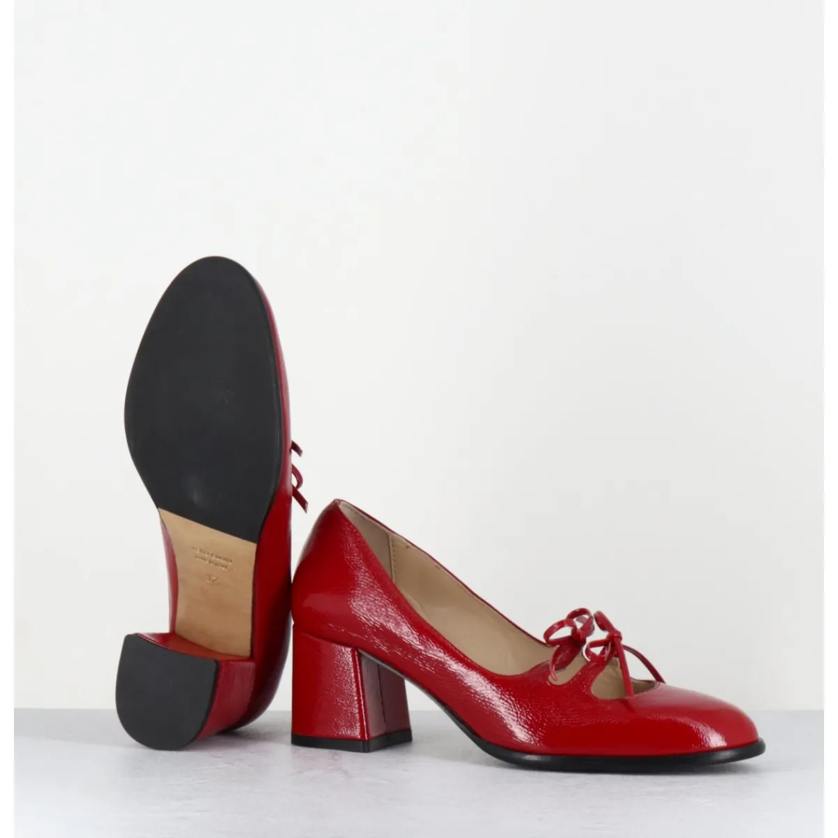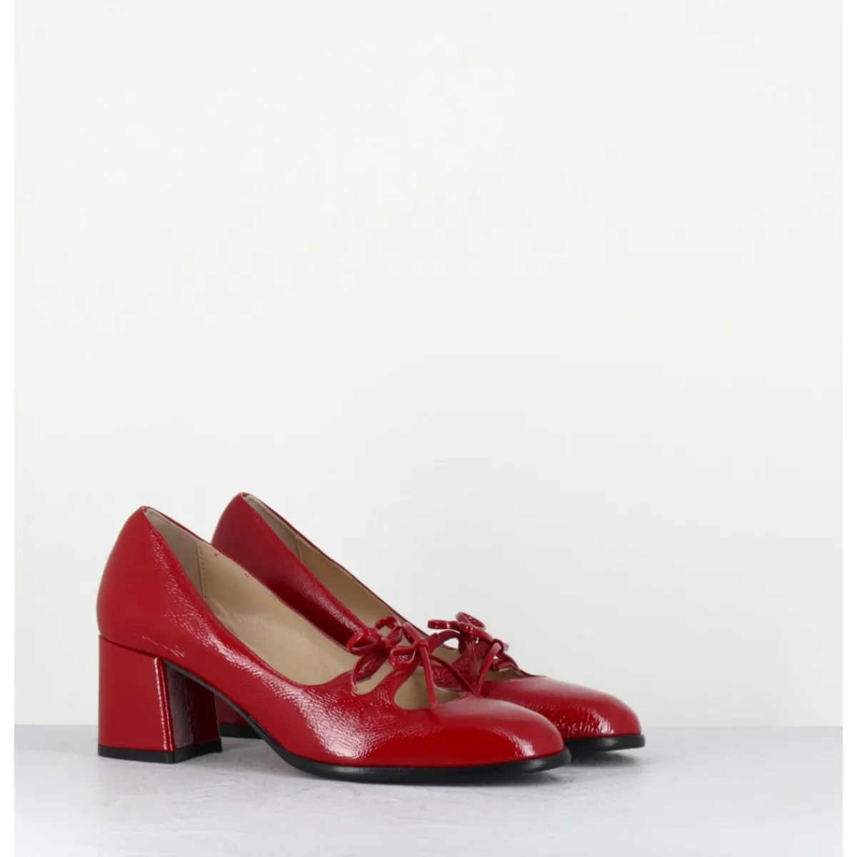 Babies à talon en cuir naplak rouge avec petits noeuds décoratifs cousus sur des élastiques de confort invisibles, bout en amande, montées sur un talon bloc