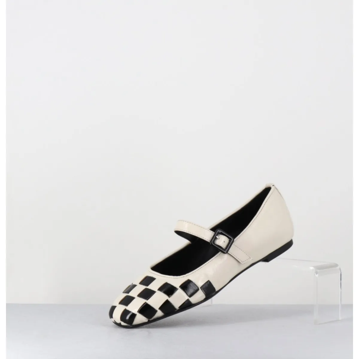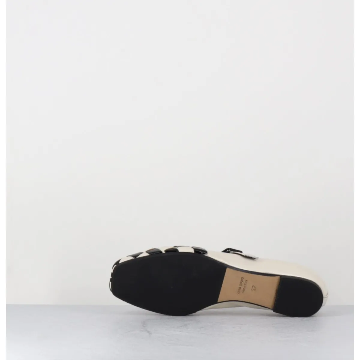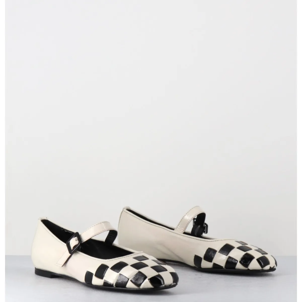 Ballerines à bride en cuir souple légèrement brillant blanc cassé et noir, présentant à l’avant des lamelles de cuir entremêlés créant un effet damier