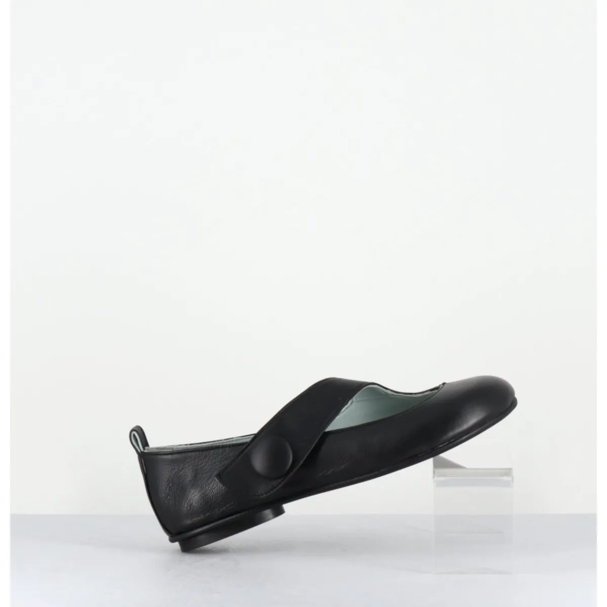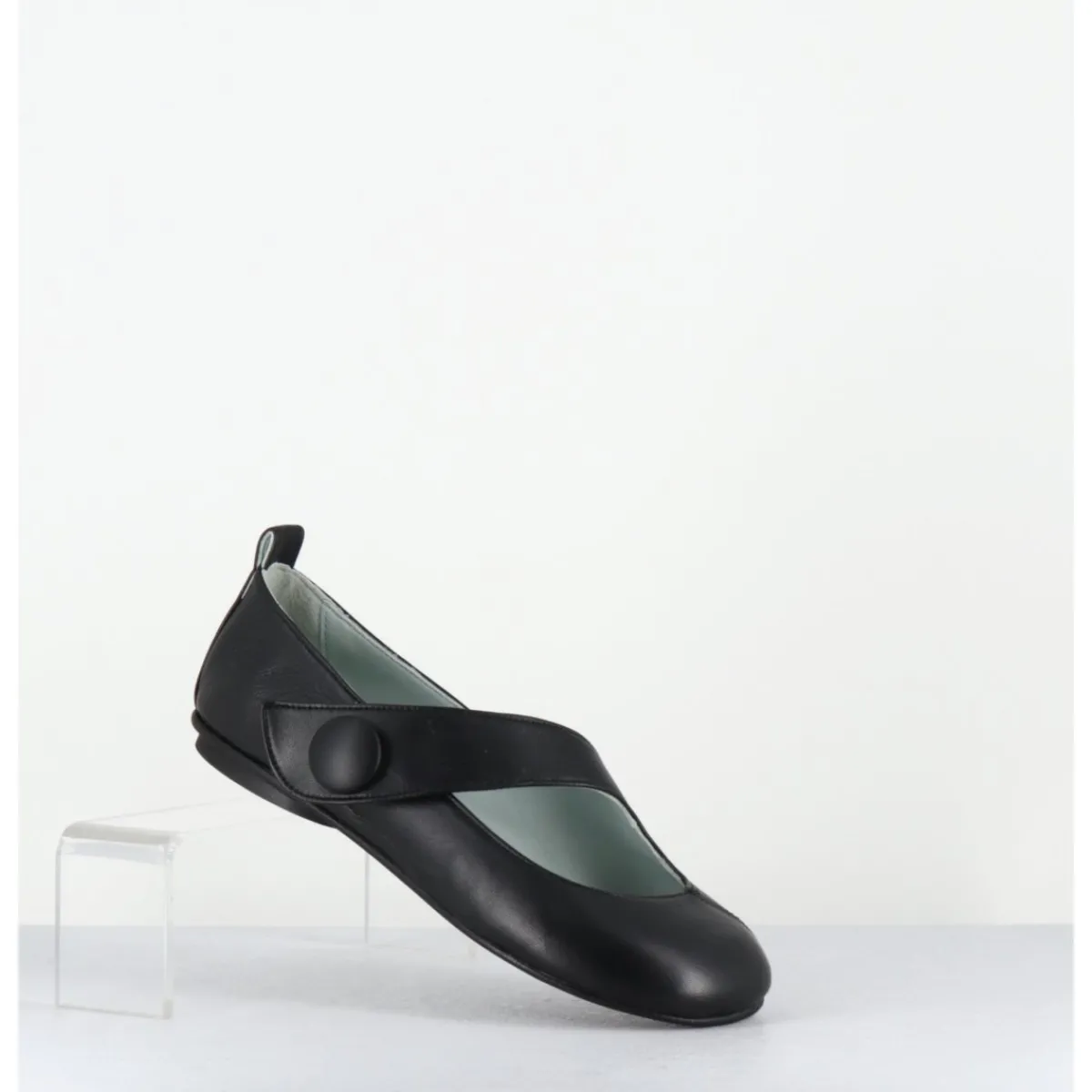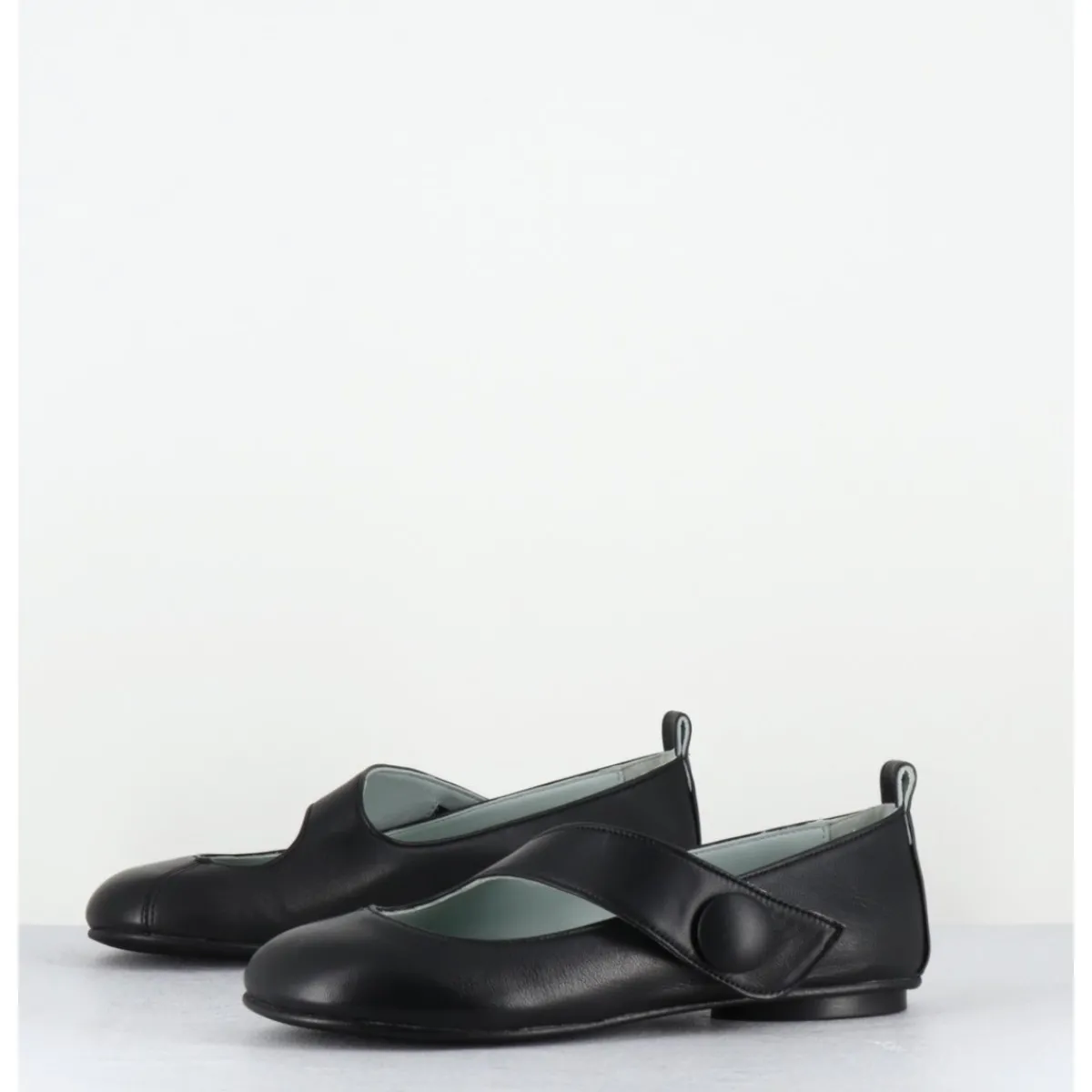 Ballerines ligne avant-gardiste japonisante à bout rond, bride asymétrique ornée d’un large bouton, découpe échancrée à l’avant, réalisées dans un cuir noir extrêmement souple, semelle intérieure molletonnée à mémoire de forme, semelle extérieure cousue construction sacchetto flexible avec talonnette ronde en gomme. D’un grand confort.