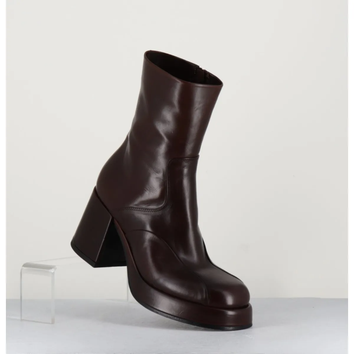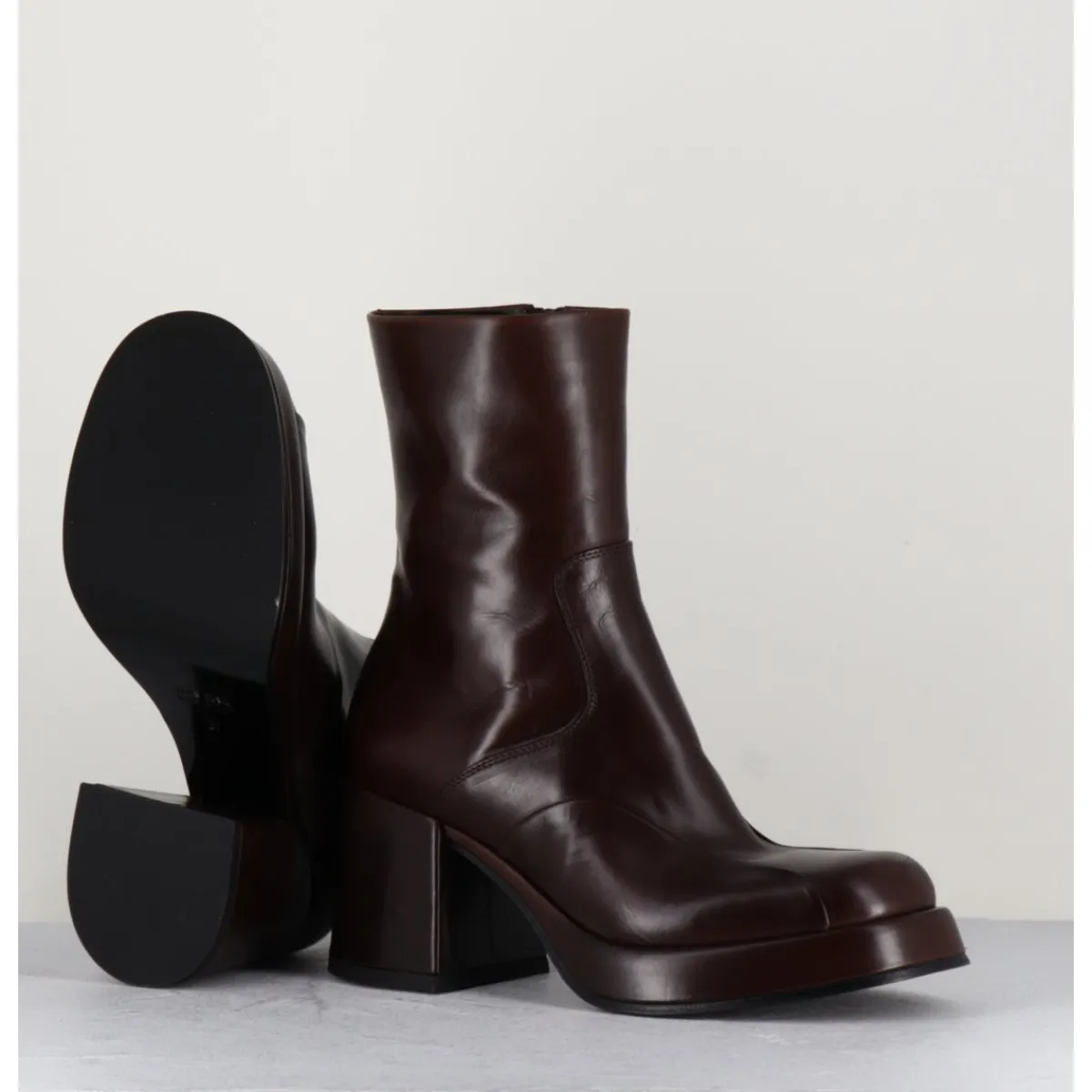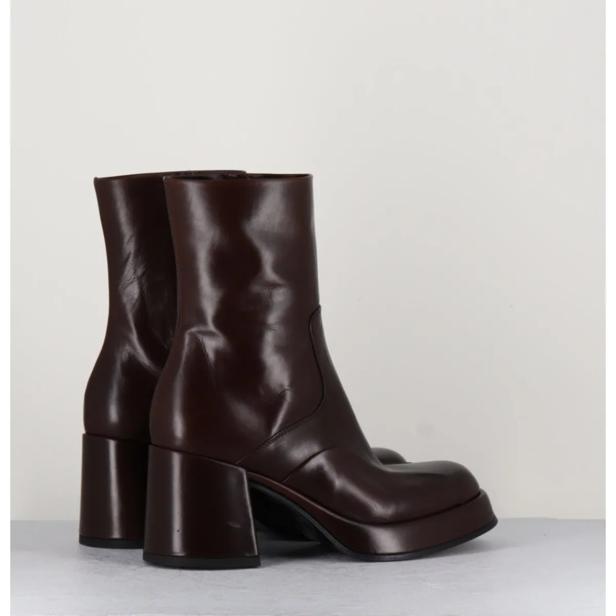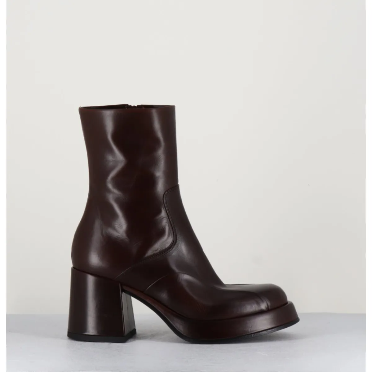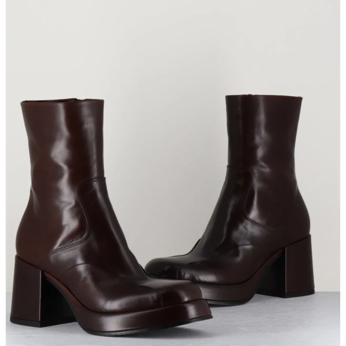 Boots 70s en cuir marron, empiècements ton sur ton sur l’avant, bout carré soft, montées sur un talon bloc et une plateforme recouverts.